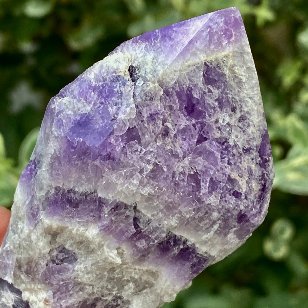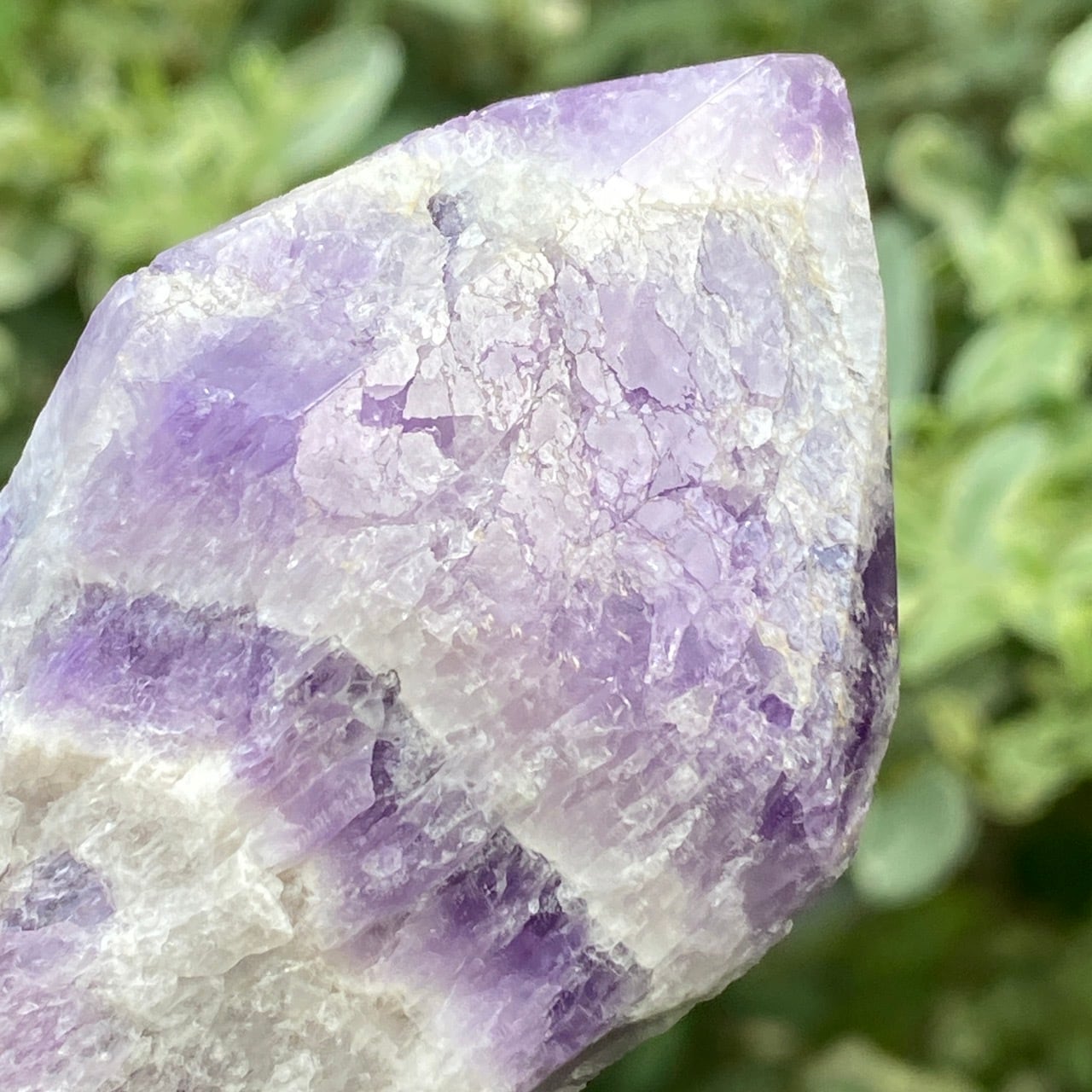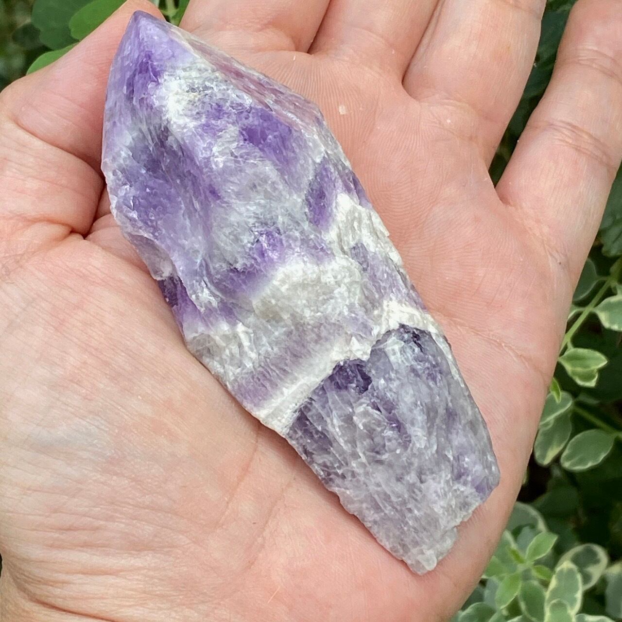 この子は他の子達と比べるとアメジストの色味が優しく、まるでスイーツのようで、癒し系の雰囲気を放っています。ポリッシュした部分のアメジストは所々半透明になっており、霜降り部分も見られます。形状が通常のアメジストのワンドよりも短いし小さいですが、握って石が持つ意識を感じていただければと思います。