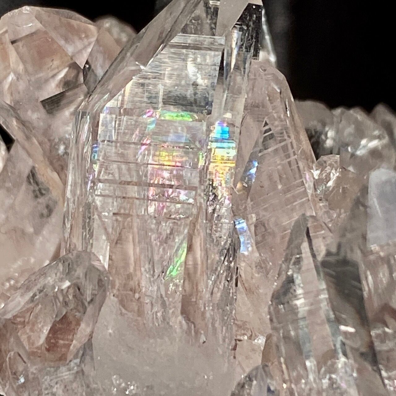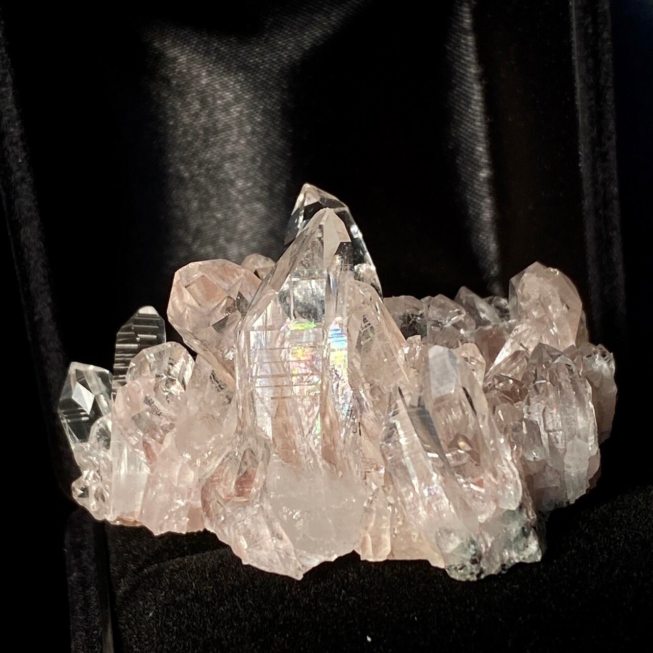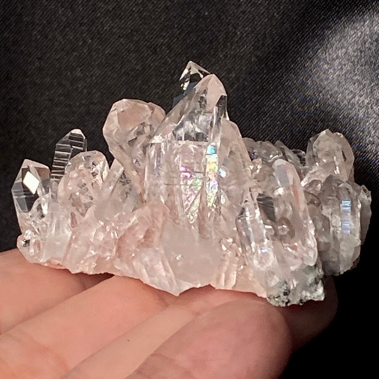 一番太く側柱に顕著な古代レムリアの叡智が刻まれていると言われるレムリアンリッジ(バーコードのような条線)が見られるポイント部分にはっきりとした虹が浮かぶ子です。色も乙女な淡いピンクで美しく、コロンビア産のレムリアンクォーツの特徴である透明感や輝きや照りが見事です。