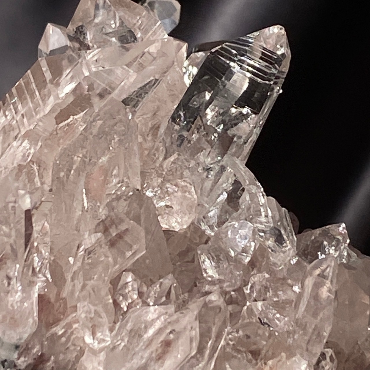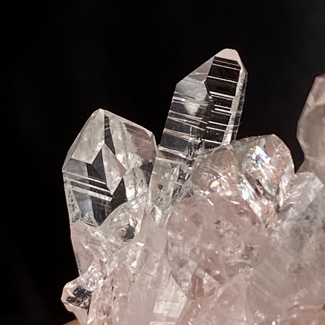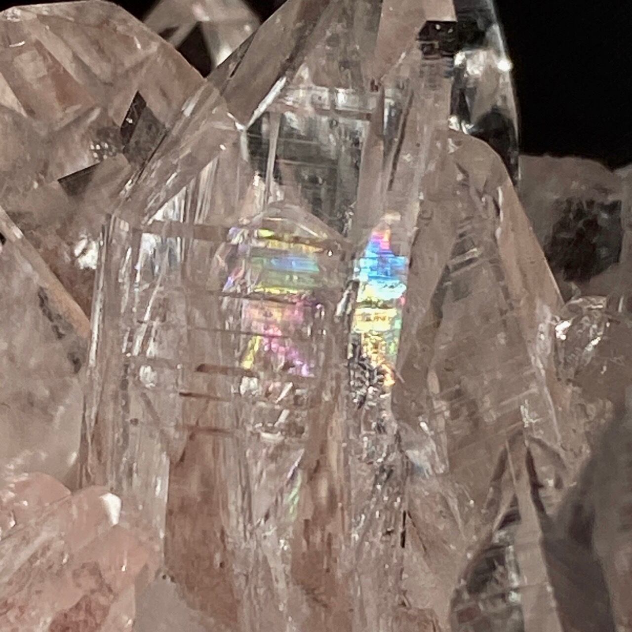 一番太く側柱に顕著な古代レムリアの叡智が刻まれていると言われるレムリアンリッジ(バーコードのような条線)が見られるポイント部分にはっきりとした虹が浮かぶ子です。色も乙女な淡いピンクで美しく、コロンビア産のレムリアンクォーツの特徴である透明感や輝きや照りが見事です。