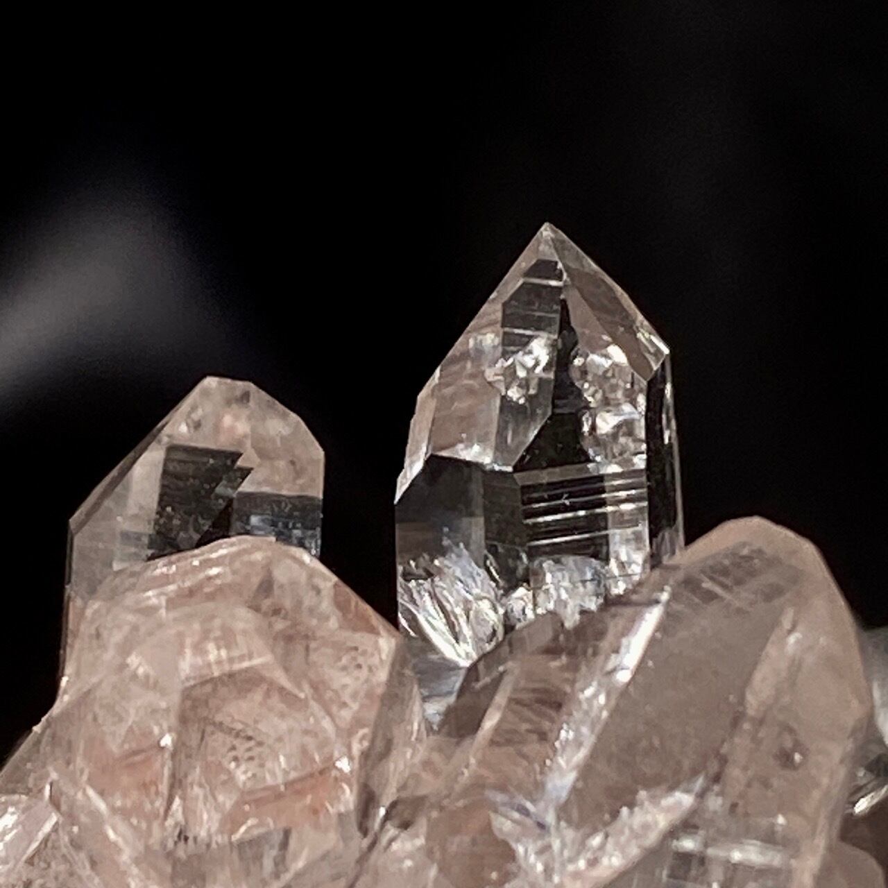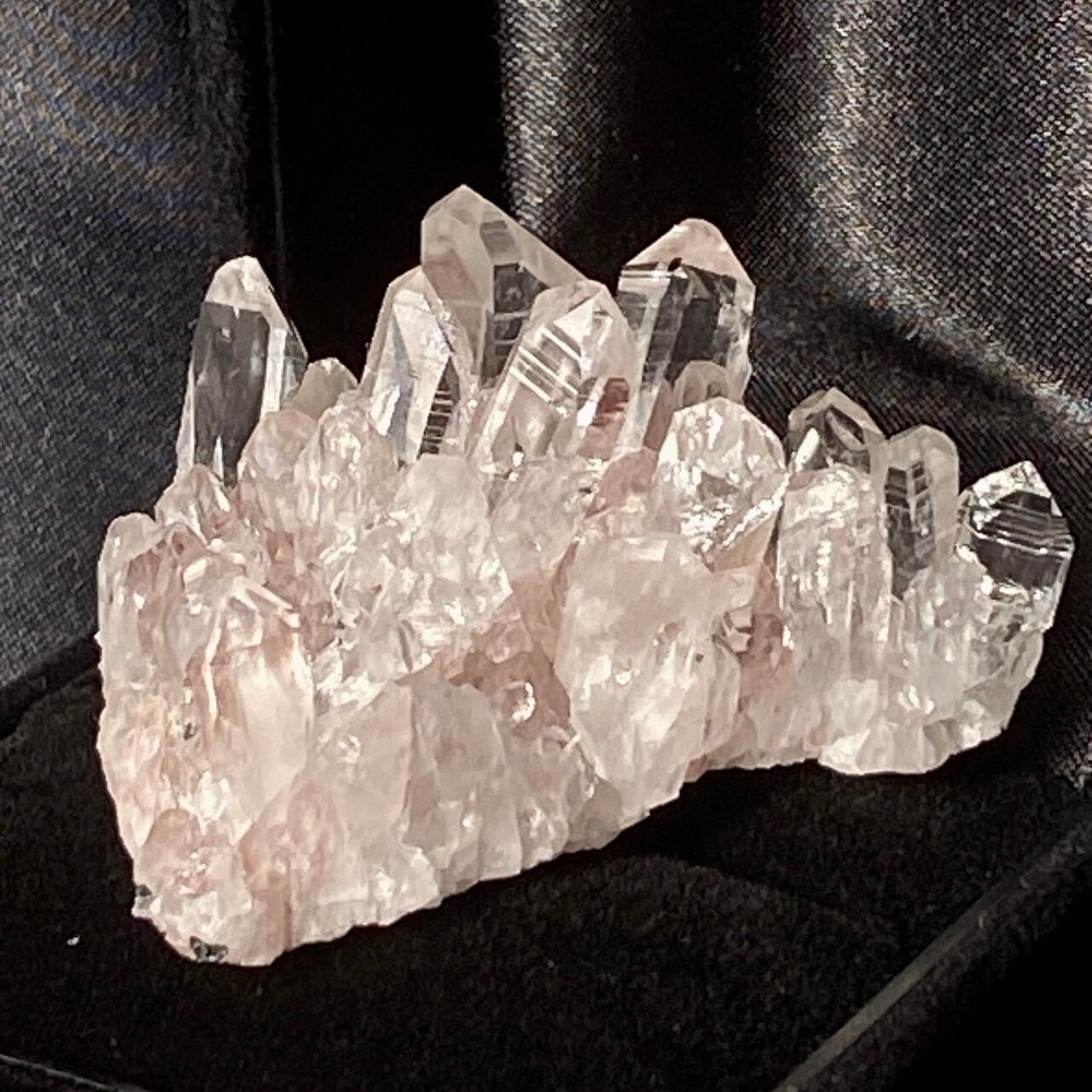透明度は個体によって異なります。ピンクレムリアンに関しては、形状も一般的なクラスターに加え、沢山のポイントが折り重なっている形状や、非常にレアなタビュラー型のファーデンクォーツのフォーメンションから成ります。