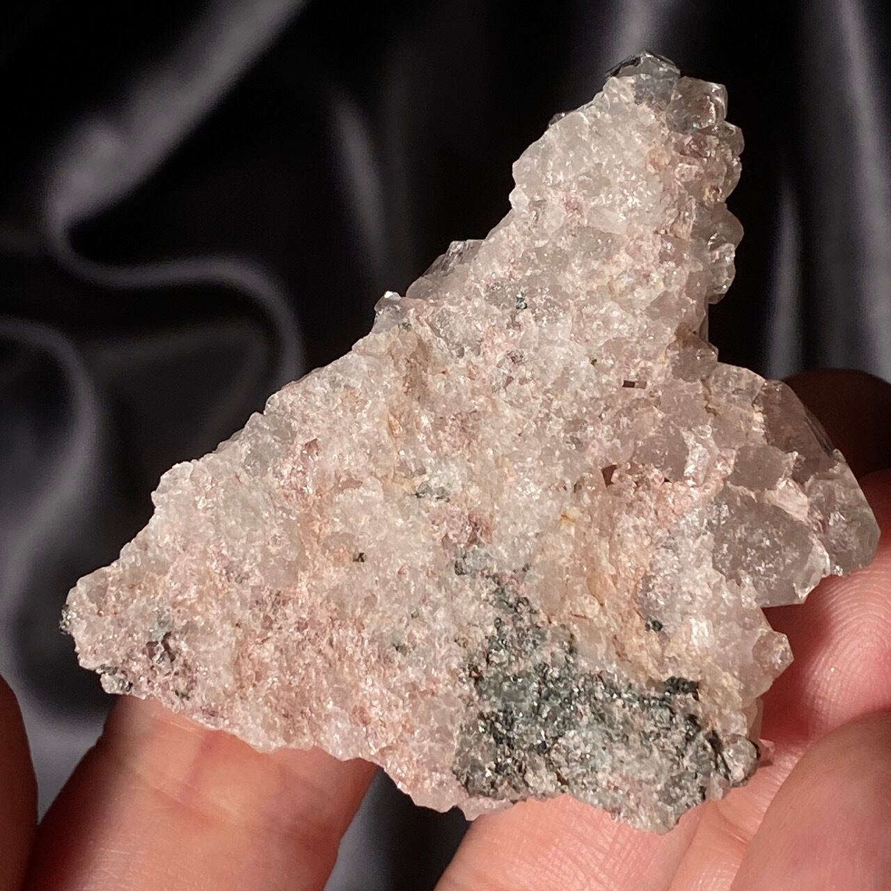 そして、緑色(黒)っぽいインクルージョンはクリノクロア(斜緑泥石)で、緑泥石グループに属する粘土鉱物です。