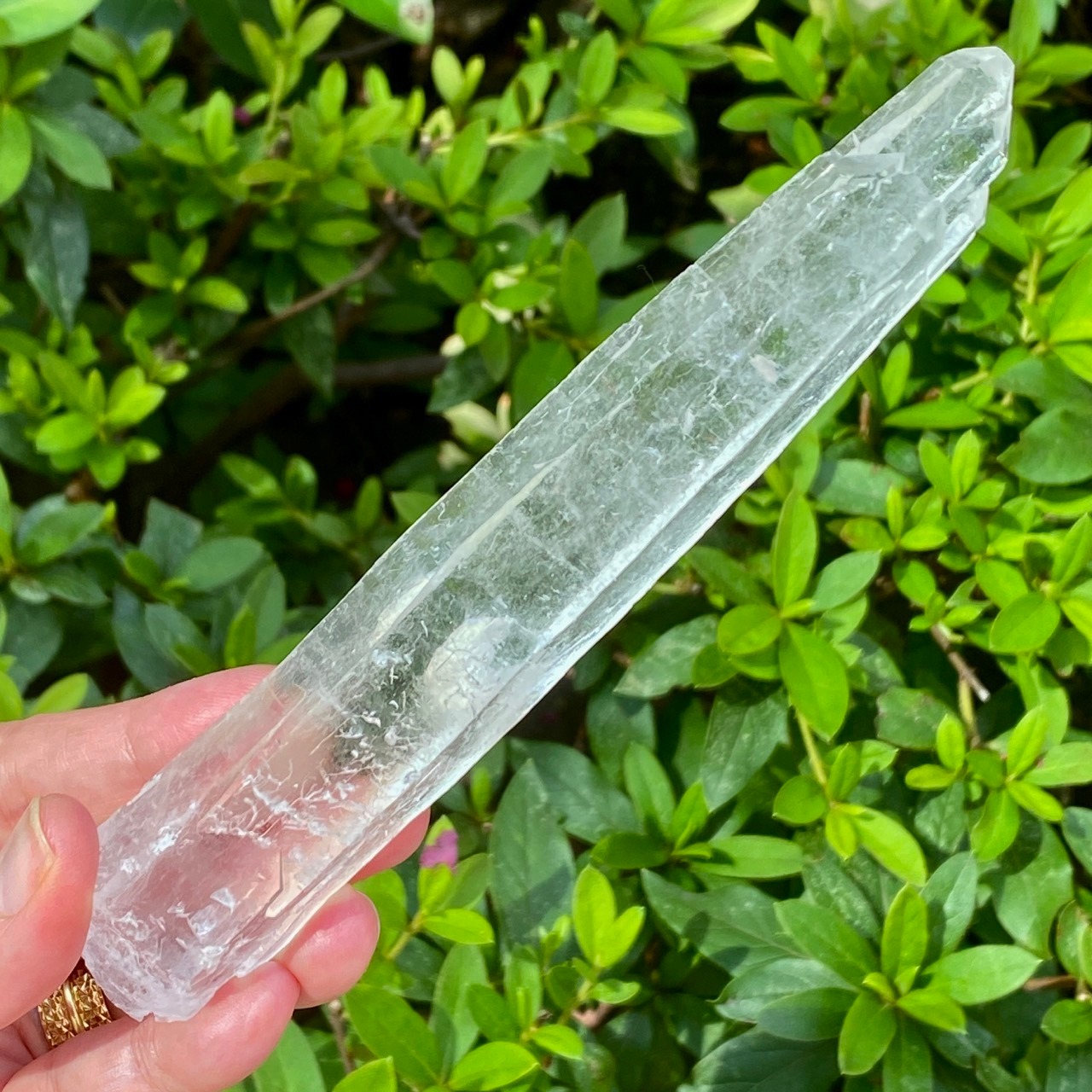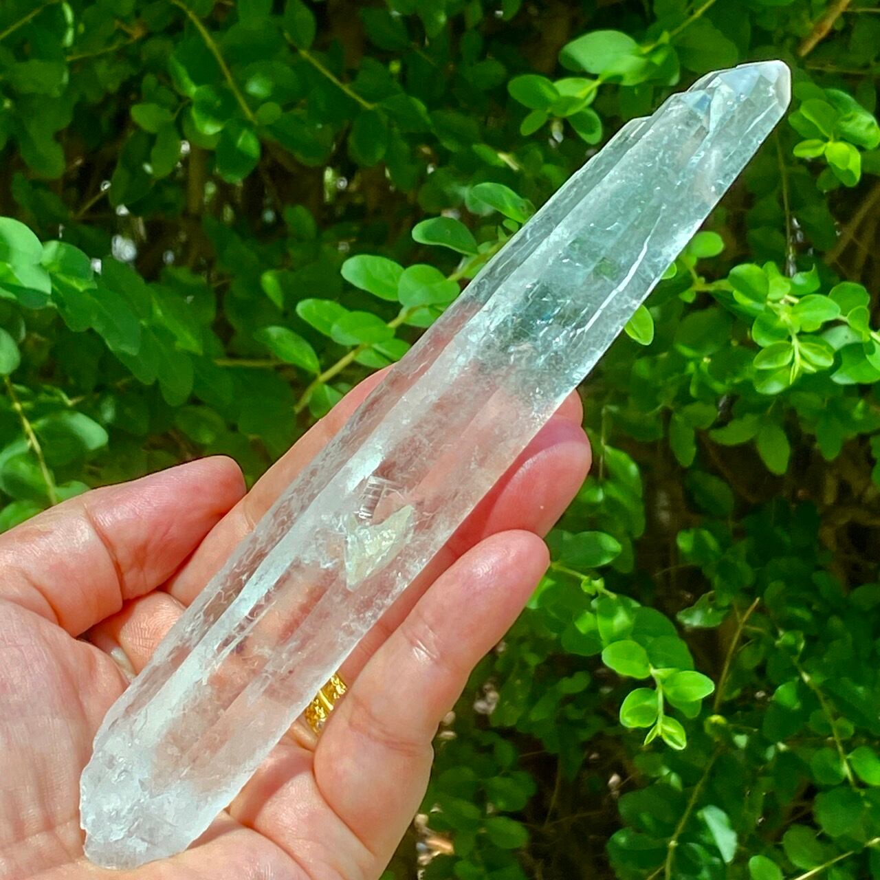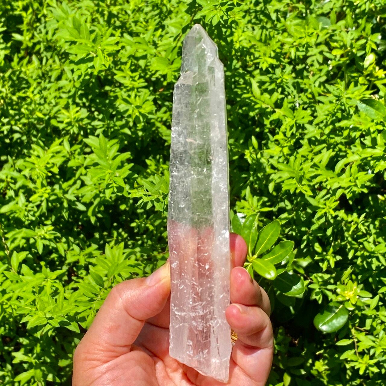 手のひらに収めた時の長さ存と在感を感じて頂きたい、レーザクォーツになります。特筆すべきは、ポイント部分がカテドラルの様になっていて(11、12枚目の画像に掲載)可愛い事。中世のお城や教会の様な先頭からレーザービームが出ると想像するだけでワクワクしたので選びました。