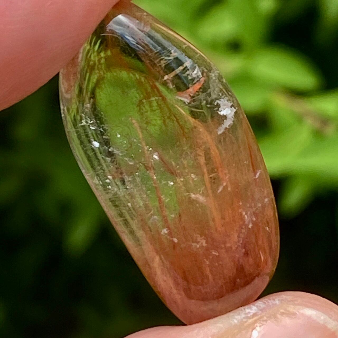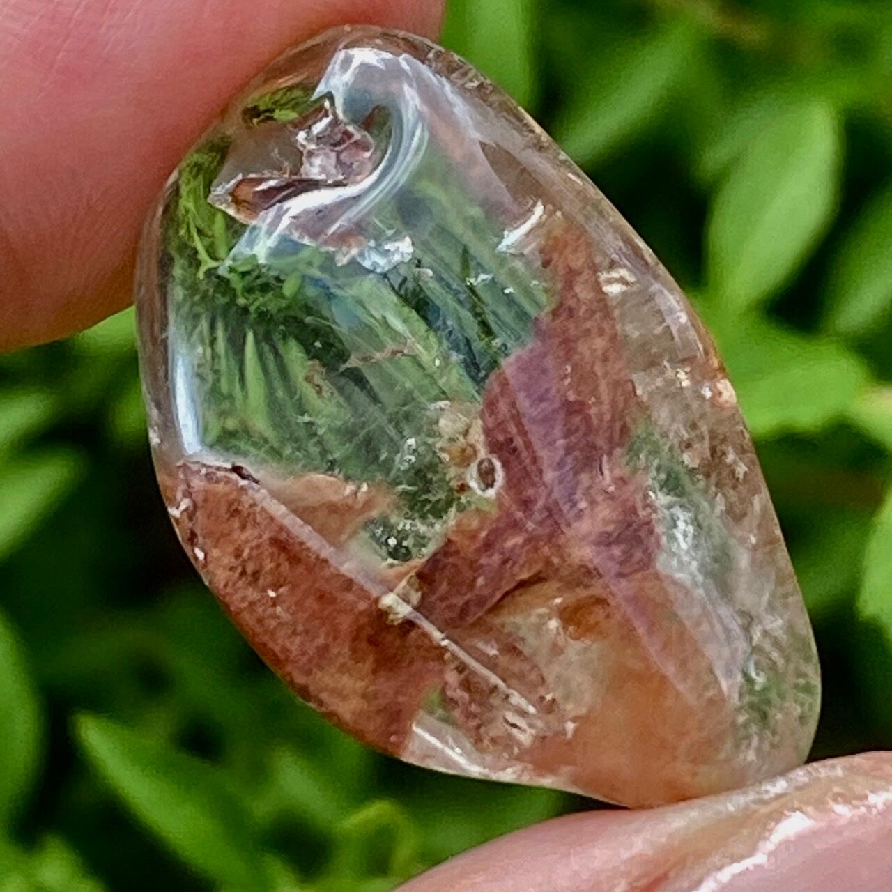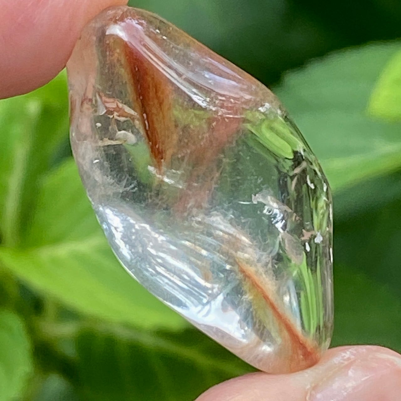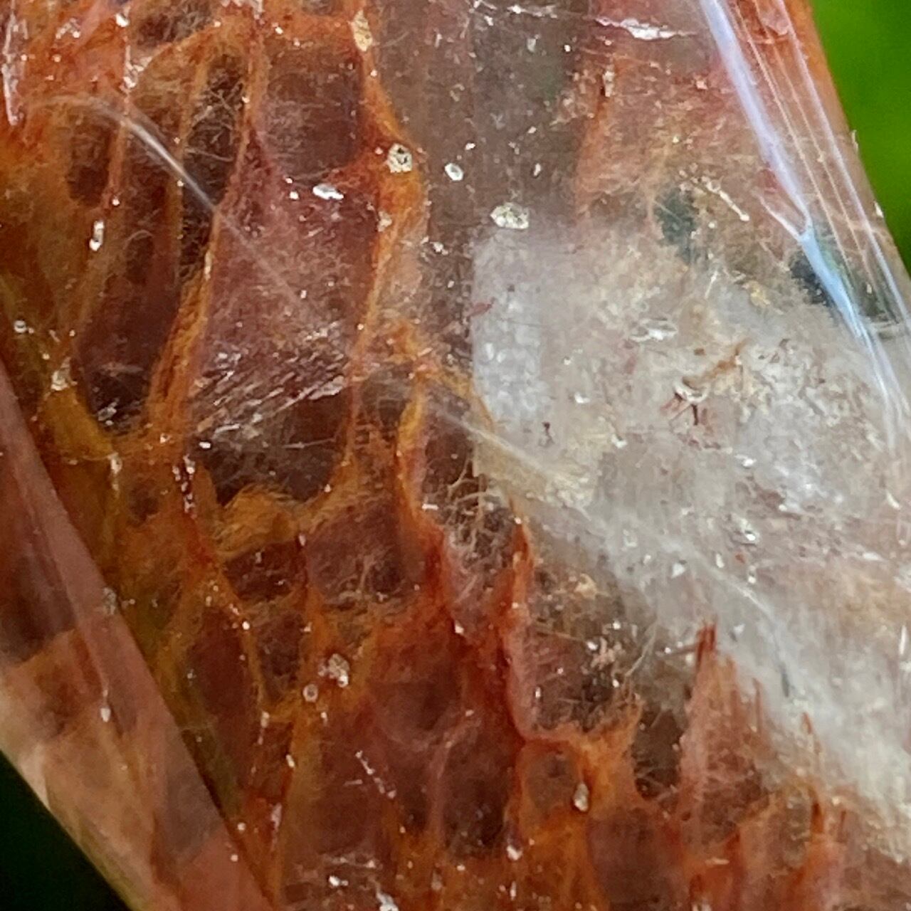 アンフィボール クォーツは、内側のファントムが天使の羽のように見えることから、エンジェル・ファントム・クォーツとしても知られています。アンフィボールの内包物は、主に(黄色の)リ(ライ)モナイト、(赤色の)ヘマタイト、(白色の)カオリナイト、(ピンク色の)リチウムで構成されています。