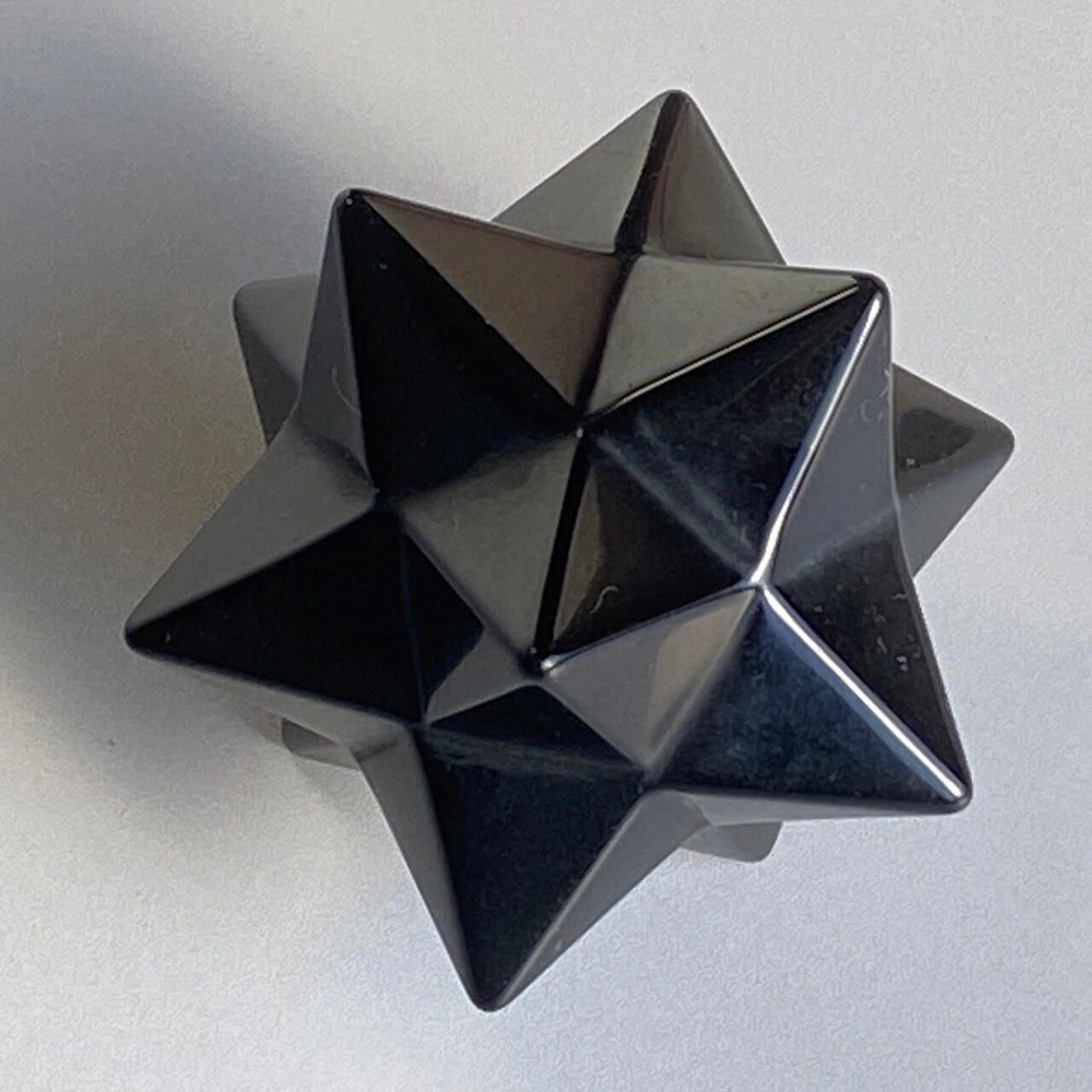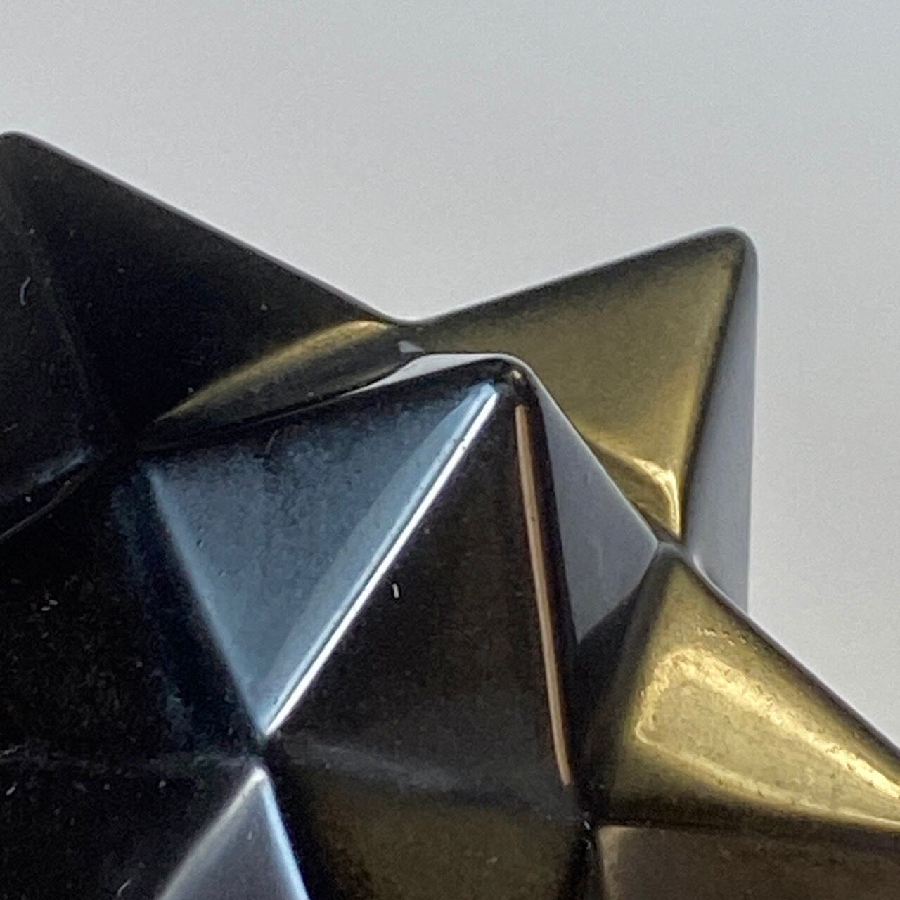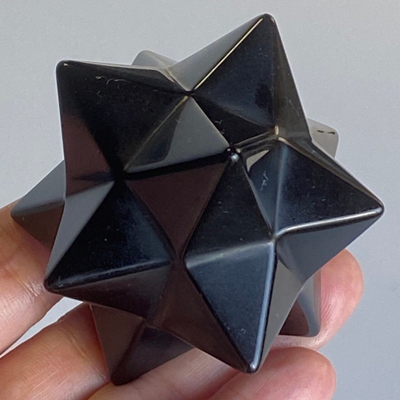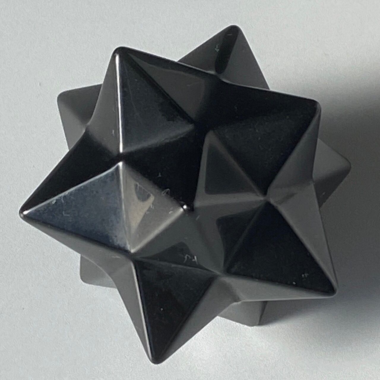 アステロイドは小星型12面体と呼ばれ、五芒星(ペンダグラム)と六芒星(ヘキサグラム)が合体した12個の頂点を持つ形状です。六芒星のもつ大宇宙の調和と安定、そして五芒星の持つ神の力による護符、この2つの要素を融合させたものです。