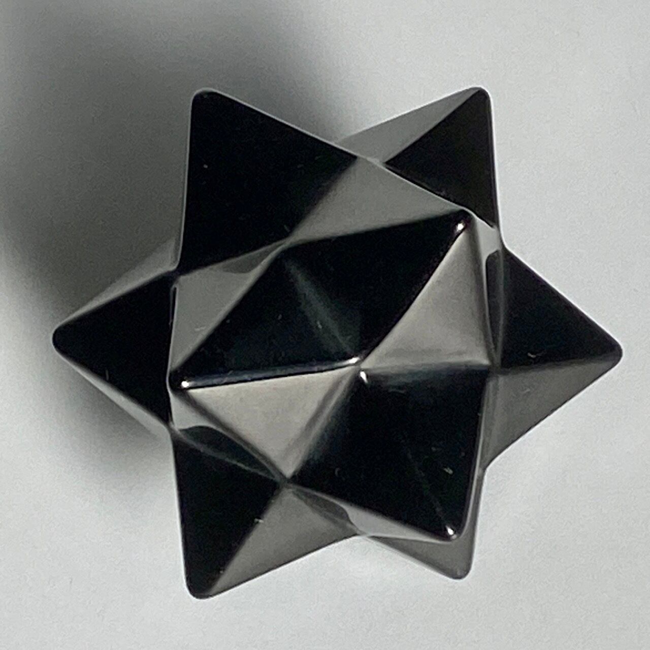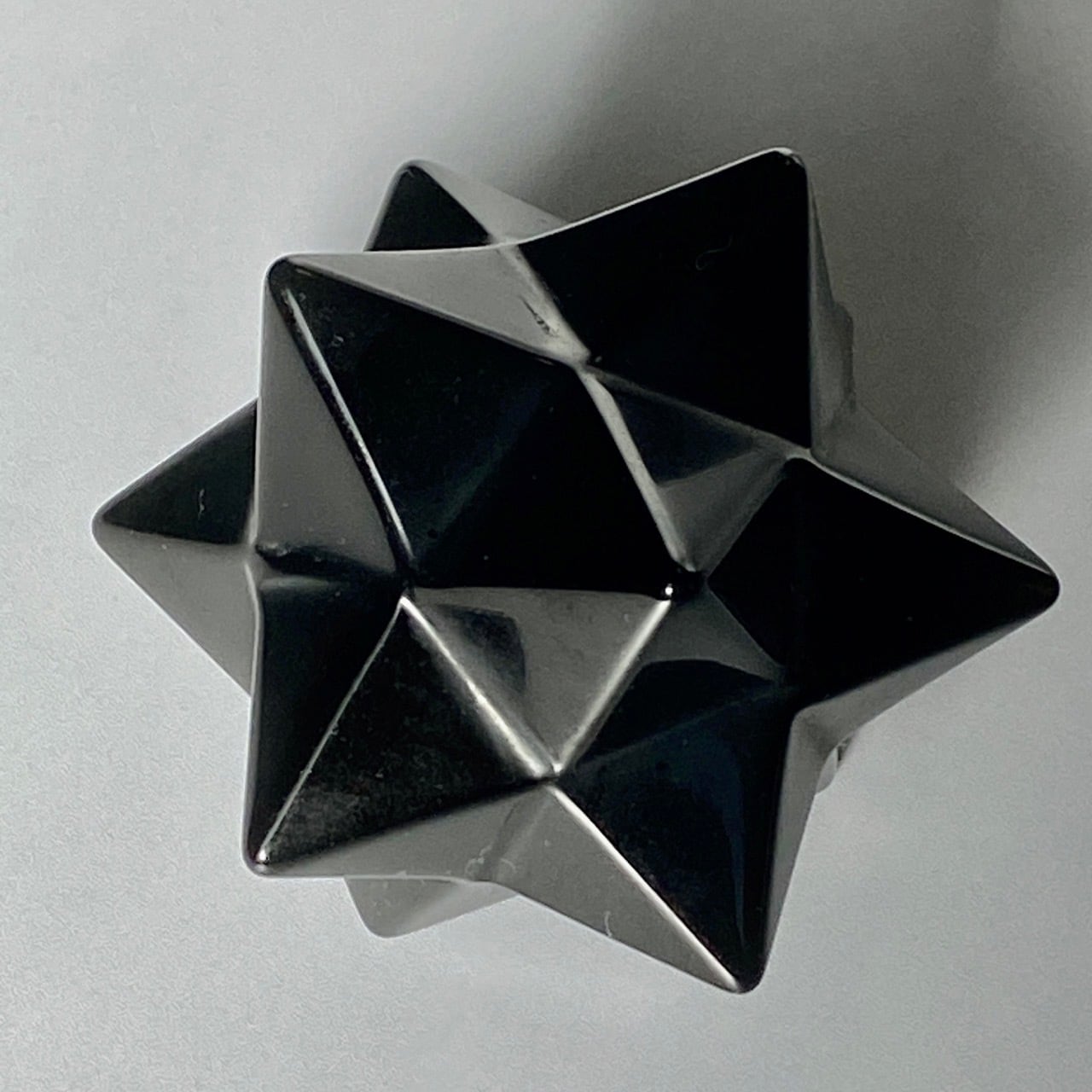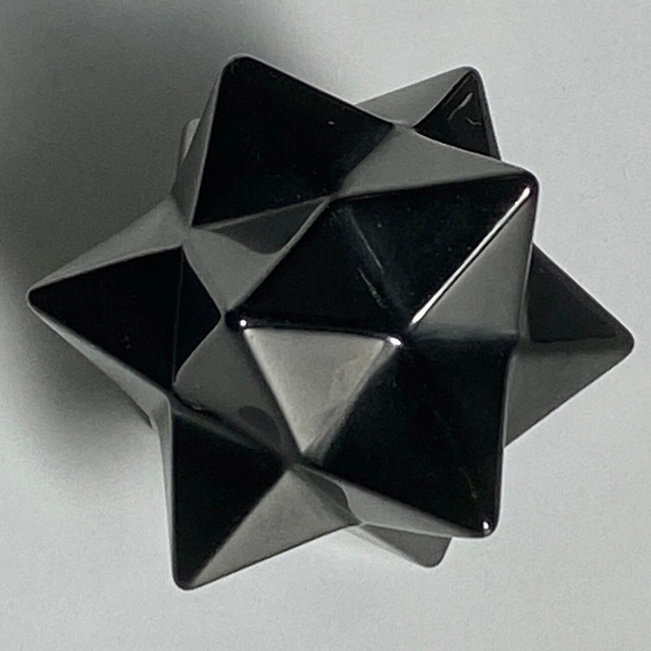 アステロイドは小星型12面体と呼ばれ、五芒星(ペンダグラム)と六芒星(ヘキサグラム)が合体した12個の頂点を持つ形状です。六芒星のもつ大宇宙の調和と安定、そして五芒星の持つ神の力による護符、この2つの要素を融合させたものです。