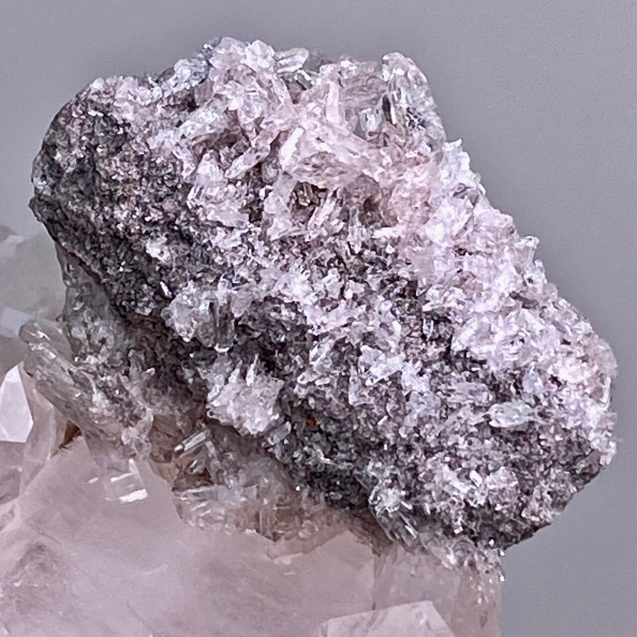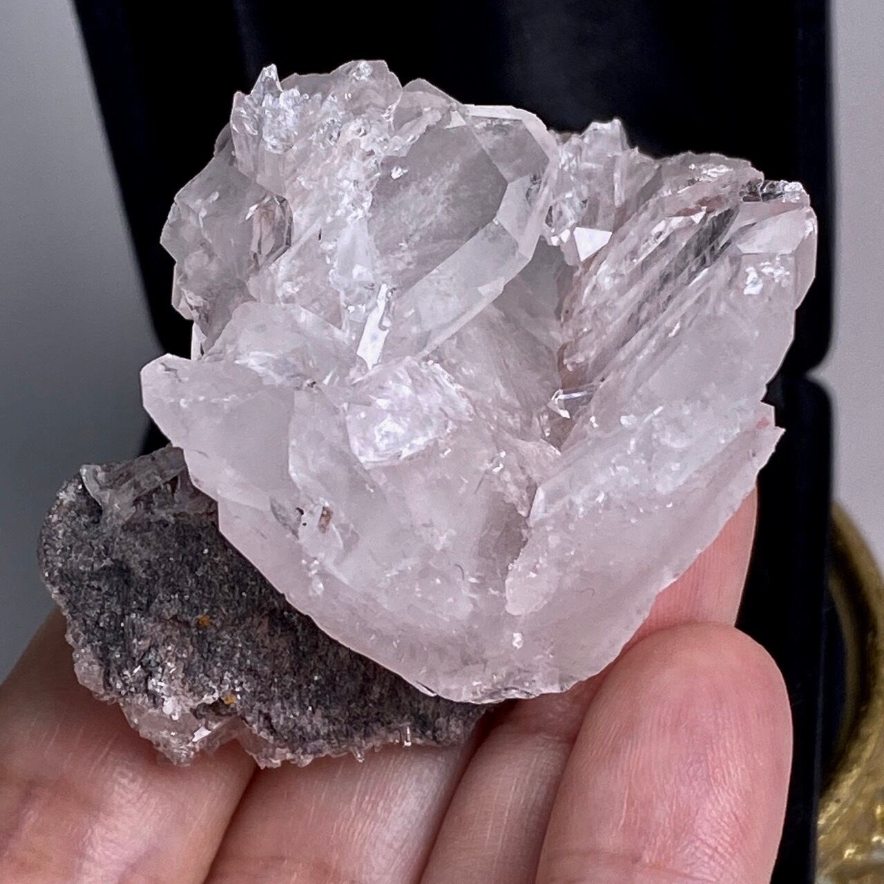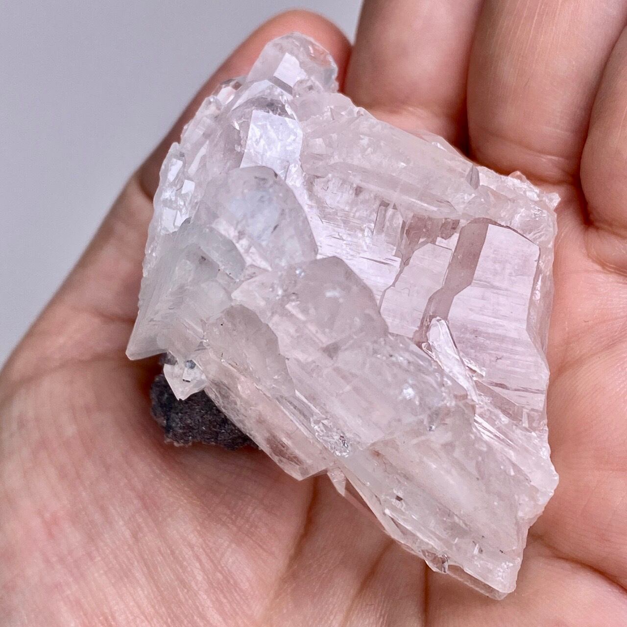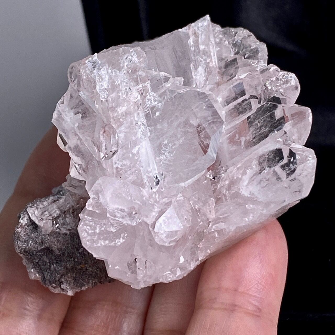 平たい結晶のタビュラー部分はクリアクォーツのような見た目ですが、ピンクレムリアンが採掘される場所で採れたファーデンにつき、本当に若干ですが淡いピンク色を帯びているように見えます。母岩部分にびっしりと付いている非常に微細な結晶(8枚目と18枚目画像に掲載)も淡いピンク色で可愛いです。母岩の上に、連なるタビュラーが載っていている、標本にもぴったりな子です。