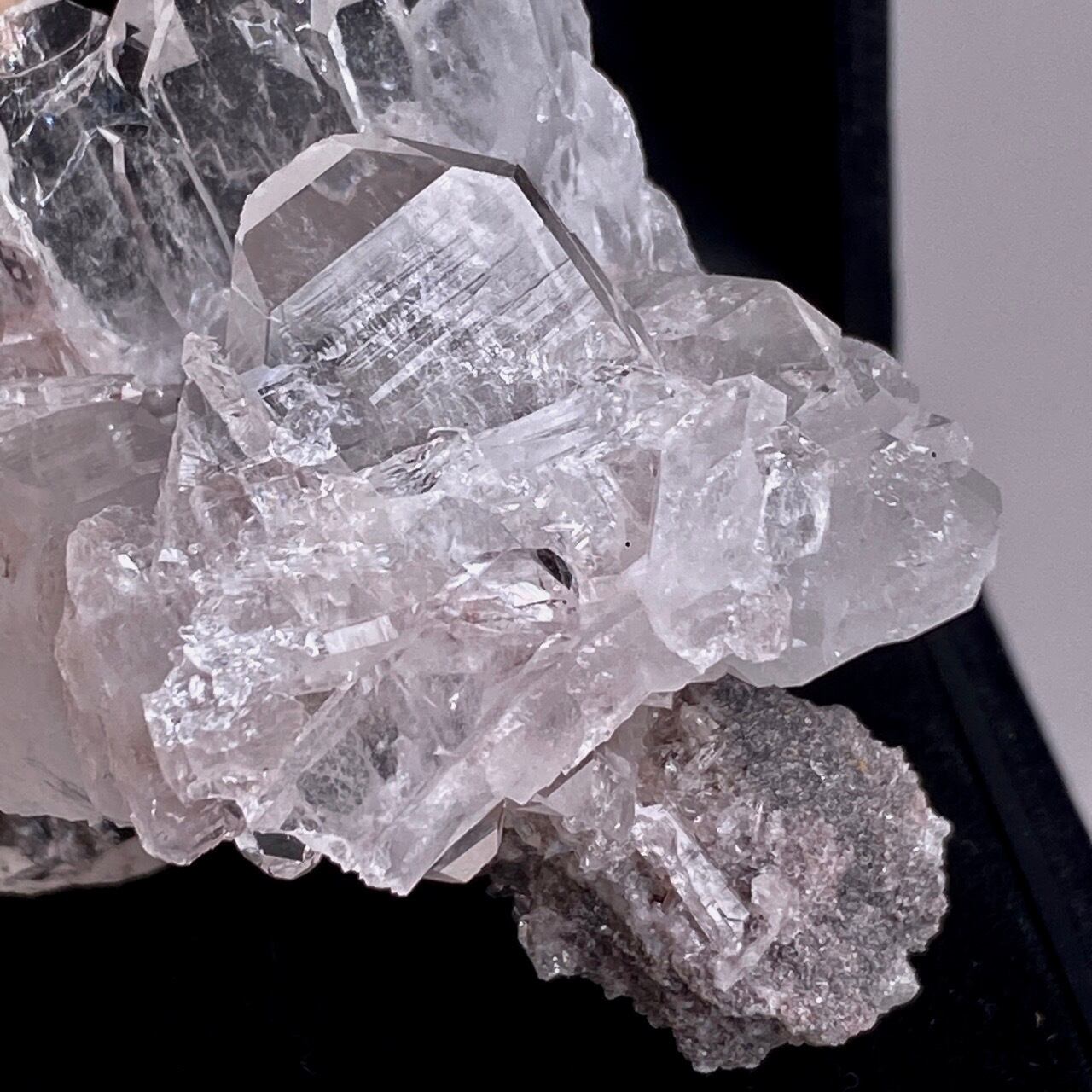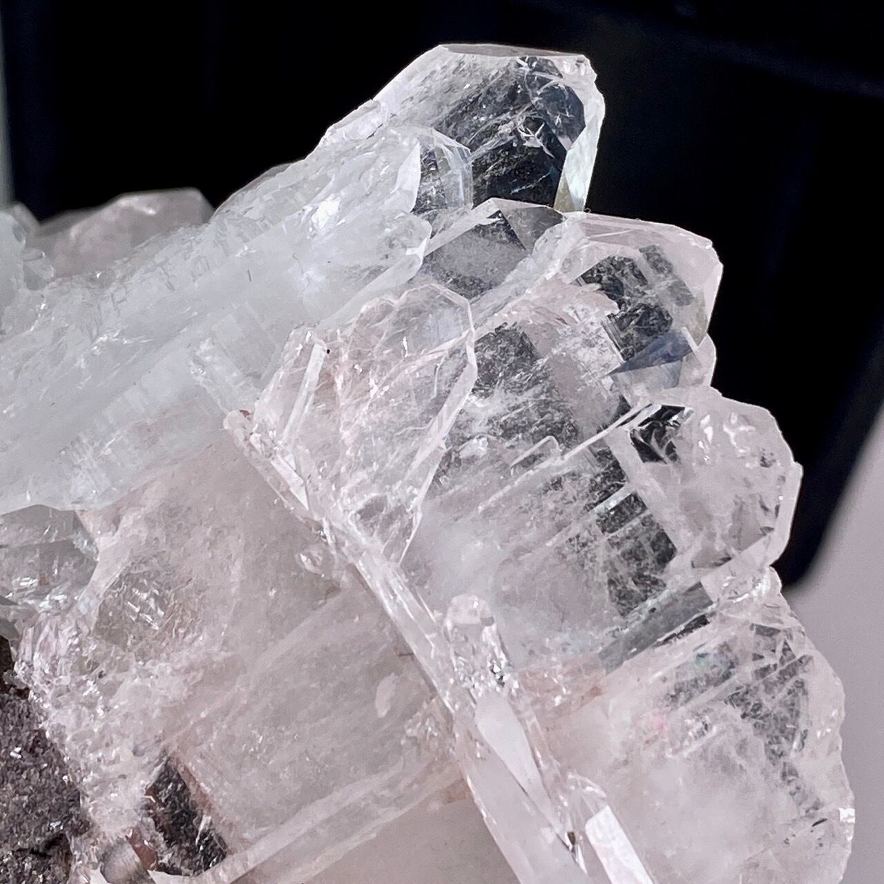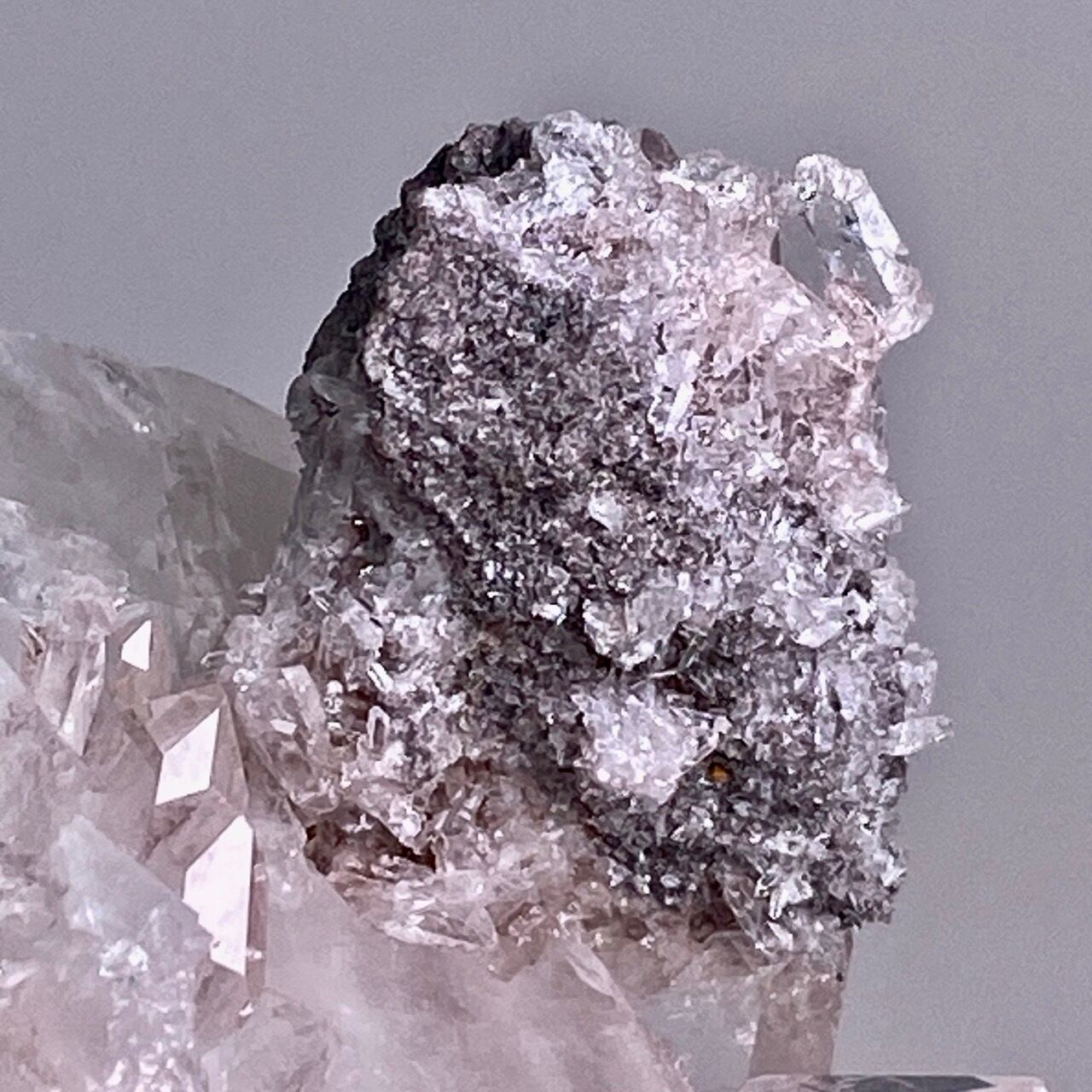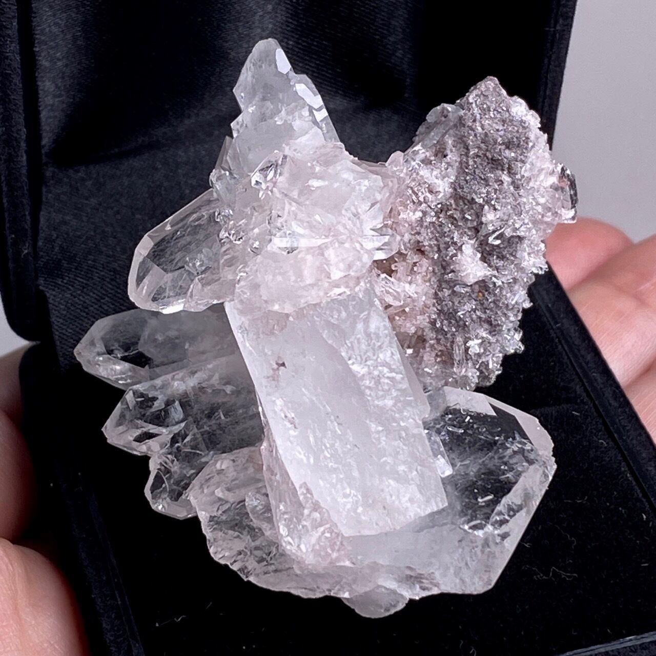 平たい結晶のタビュラー部分はクリアクォーツのような見た目ですが、ピンクレムリアンが採掘される場所で採れたファーデンにつき、本当に若干ですが淡いピンク色を帯びているように見えます。母岩部分にびっしりと付いている非常に微細な結晶(8枚目と18枚目画像に掲載)も淡いピンク色で可愛いです。母岩の上に、連なるタビュラーが載っていている、標本にもぴったりな子です。