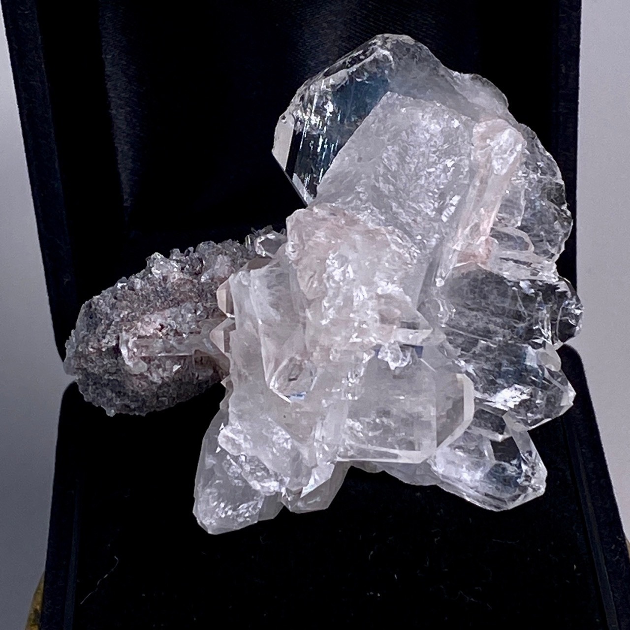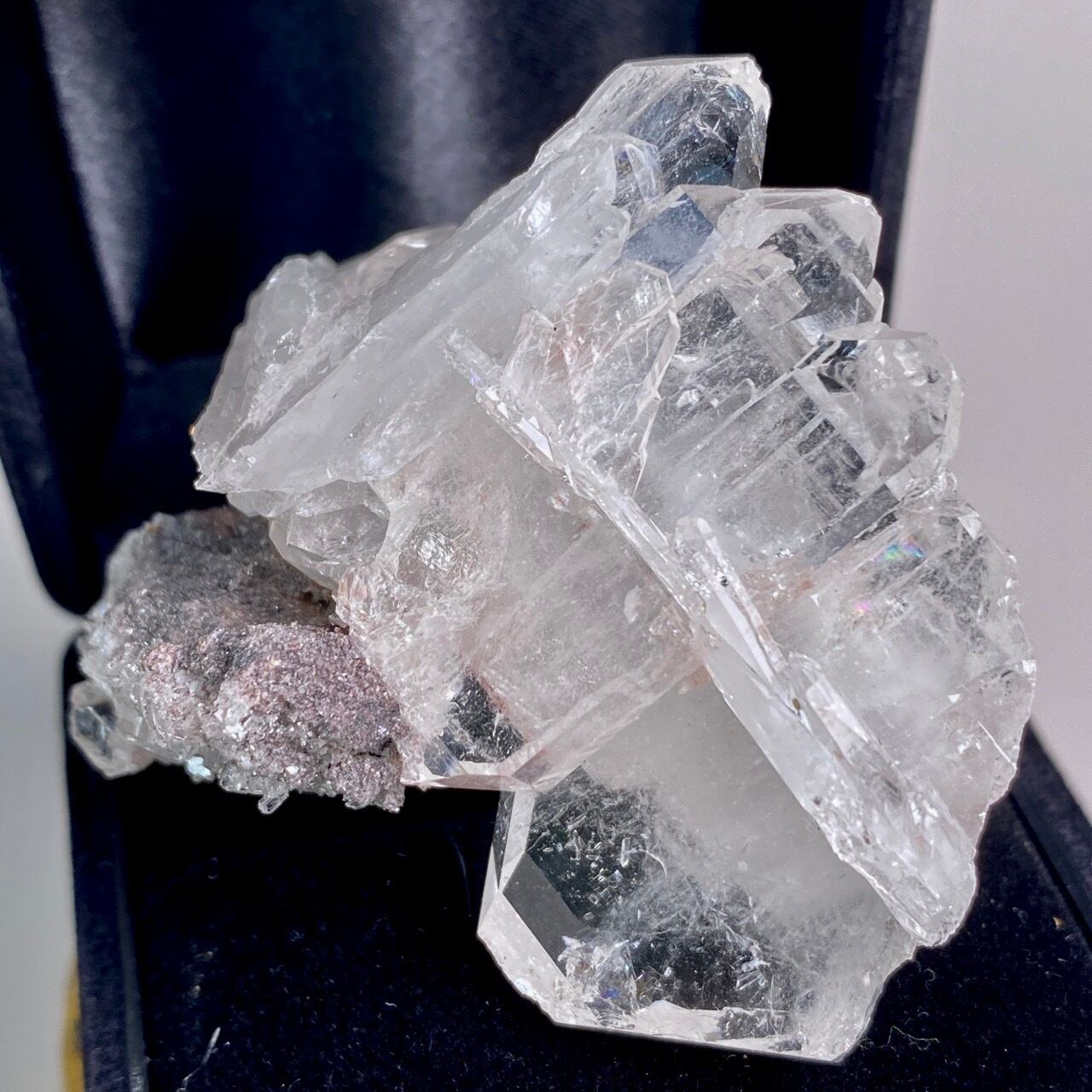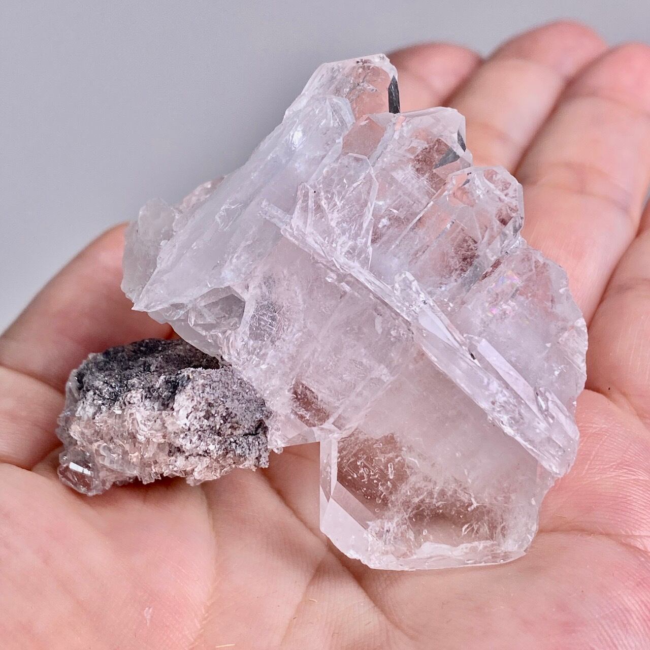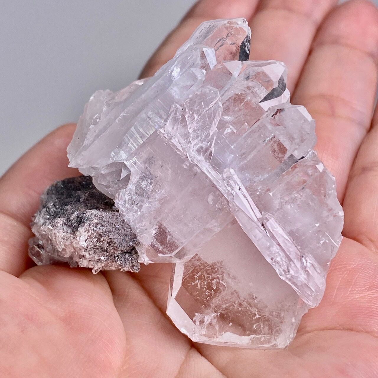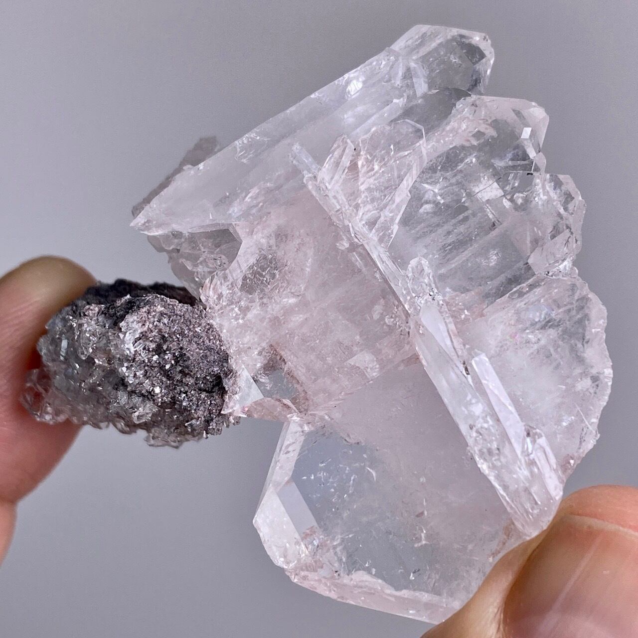 平たい結晶のタビュラー部分はクリアクォーツのような見た目ですが、ピンクレムリアンが採掘される場所で採れたファーデンにつき、本当に若干ですが淡いピンク色を帯びているように見えます。母岩部分にびっしりと付いている非常に微細な結晶(8枚目と18枚目画像に掲載)も淡いピンク色で可愛いです。母岩の上に、連なるタビュラーが載っていている、標本にもぴったりな子です。