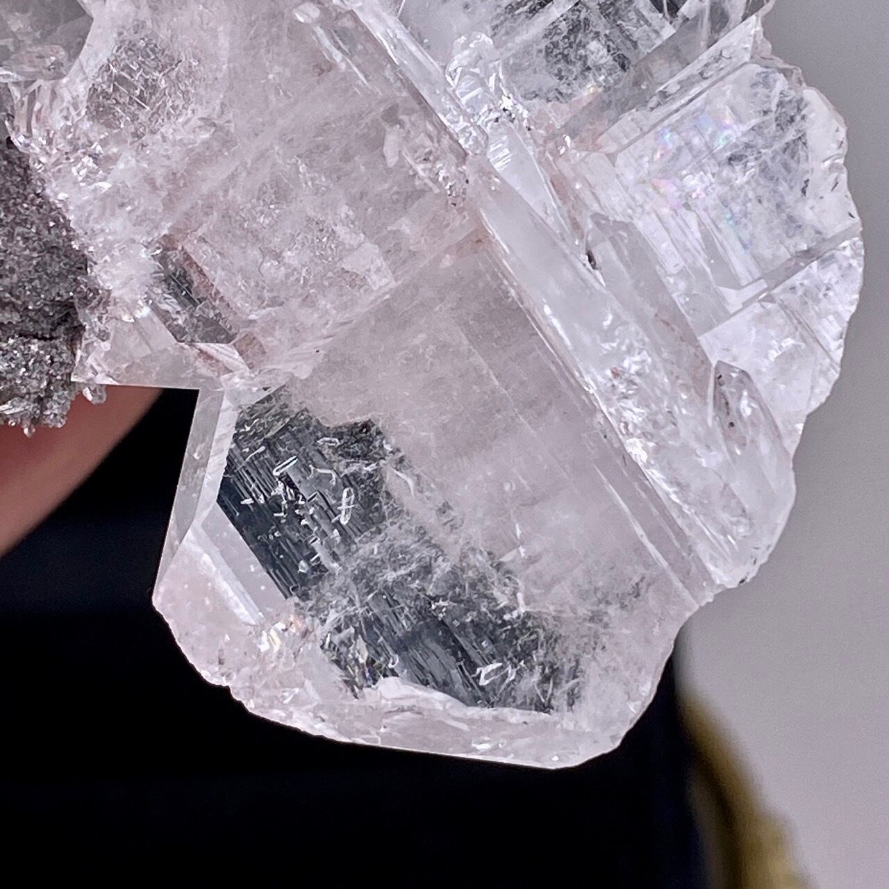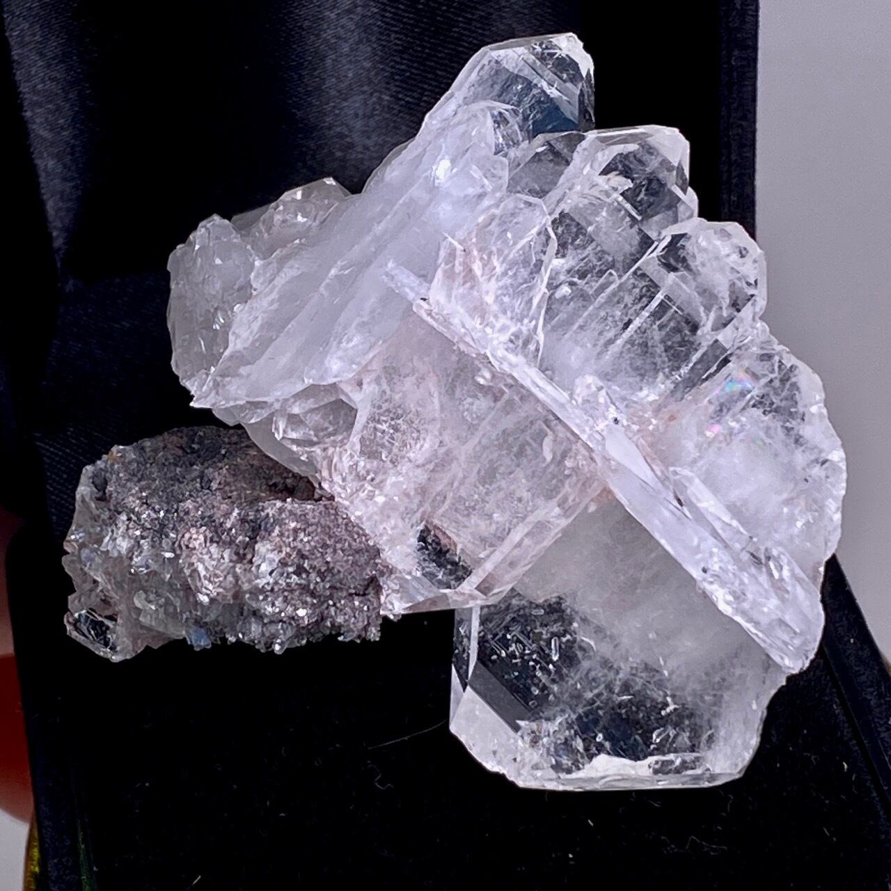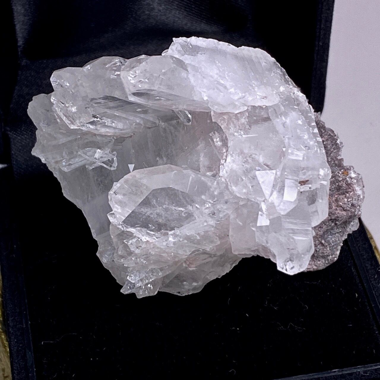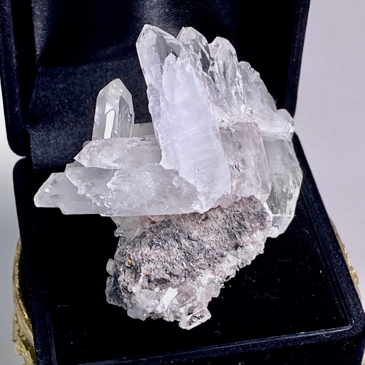 平たい結晶のタビュラー部分はクリアクォーツのような見た目ですが、ピンクレムリアンが採掘される場所で採れたファーデンにつき、本当に若干ですが淡いピンク色を帯びているように見えます。母岩部分にびっしりと付いている非常に微細な結晶(8枚目と18枚目画像に掲載)も淡いピンク色で可愛いです。母岩の上に、連なるタビュラーが載っていている、標本にもぴったりな子です。