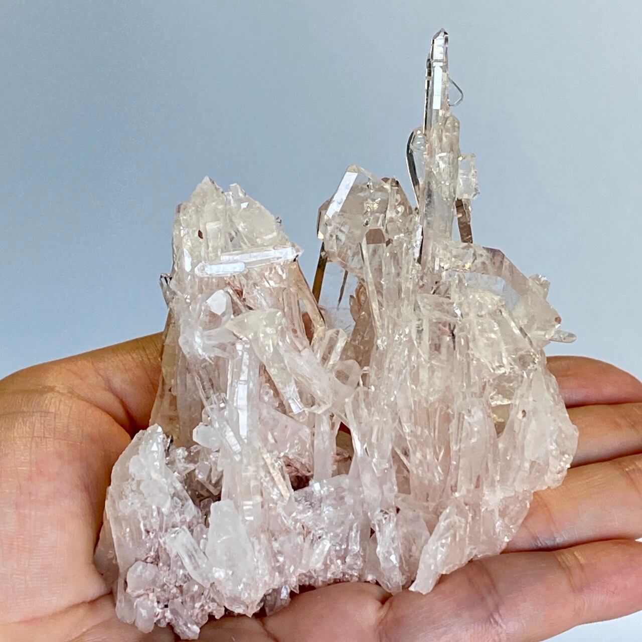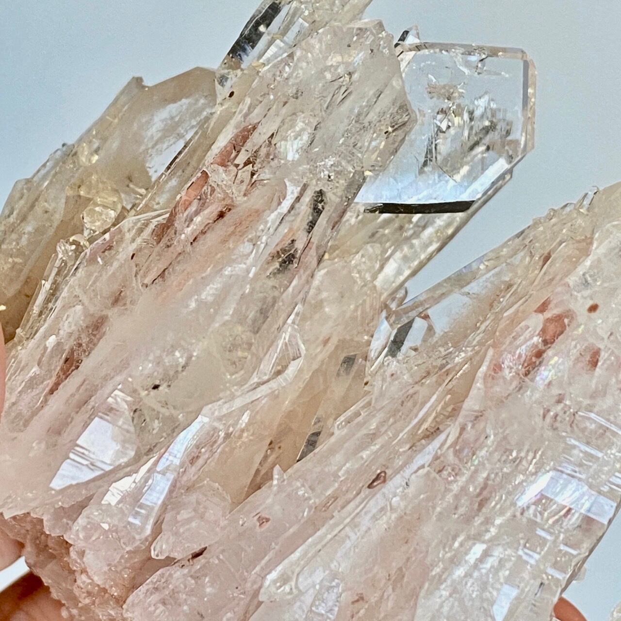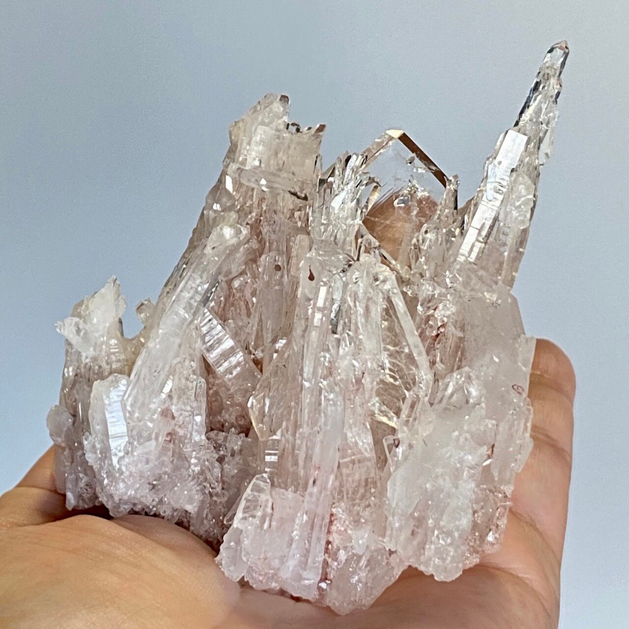 透明度は個体によって異なります。ピンクレムリアンに関しては、形状も一般的なクラスターに加え、沢山のポイントが折り重なっている形状や、非常にレアなタビュラー型のファーデンクォーツのフォーメンションから成ります。