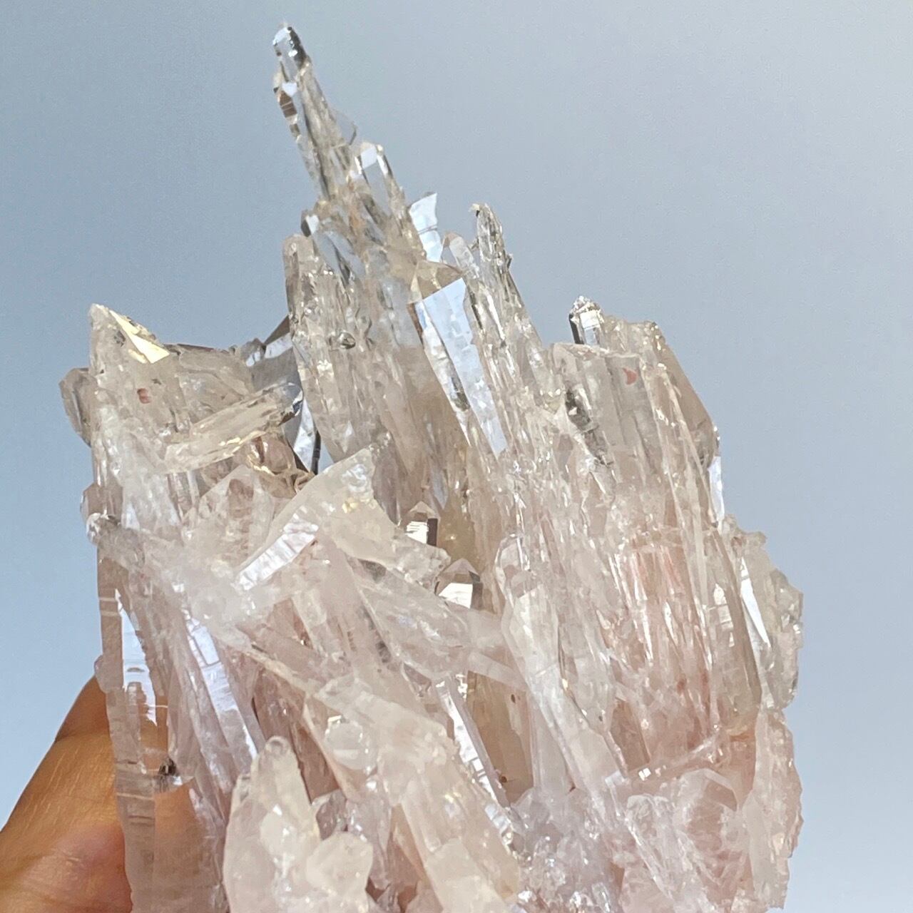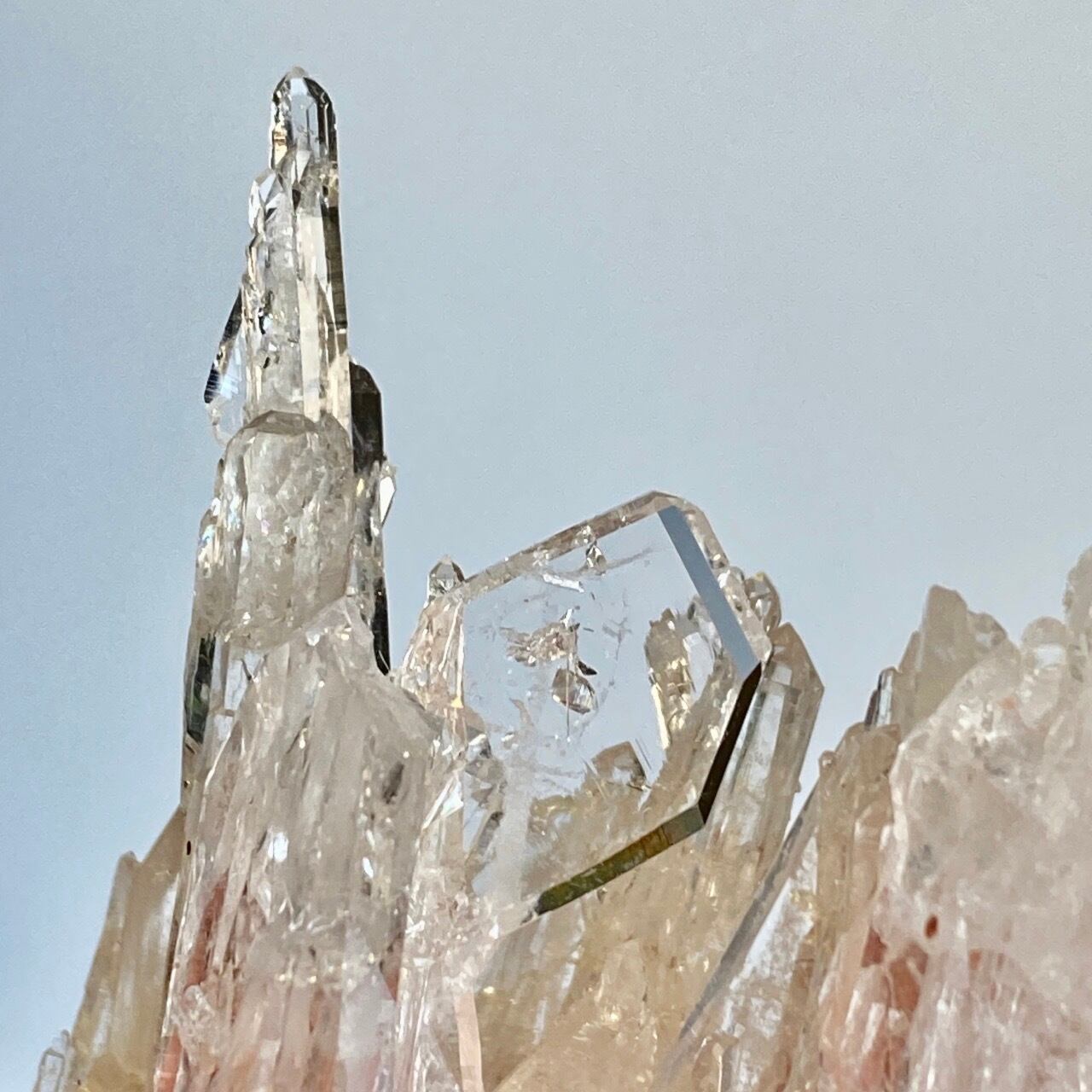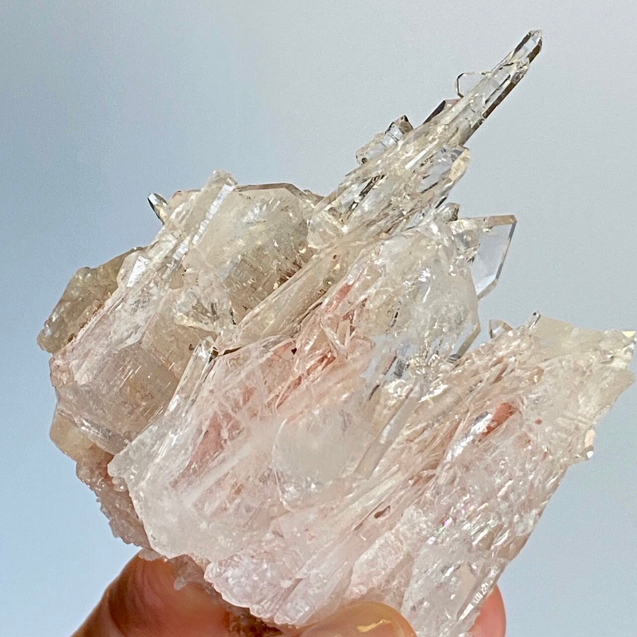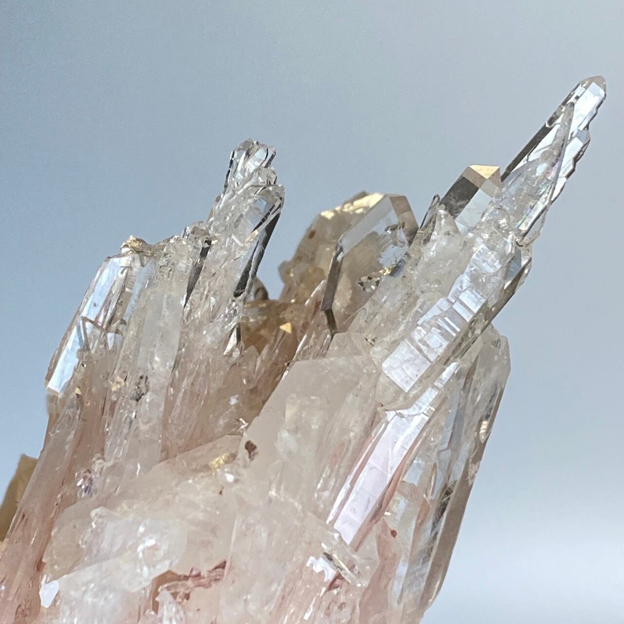 透明度は個体によって異なります。ピンクレムリアンに関しては、形状も一般的なクラスターに加え、沢山のポイントが折り重なっている形状や、非常にレアなタビュラー型のファーデンクォーツのフォーメンションから成ります。