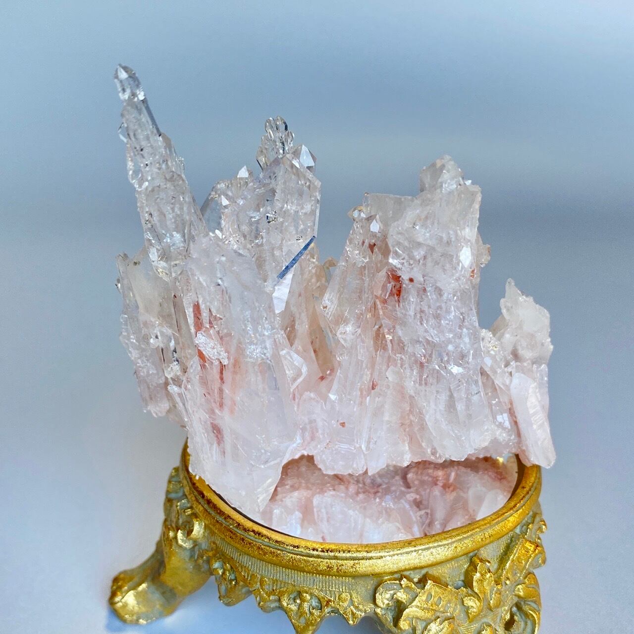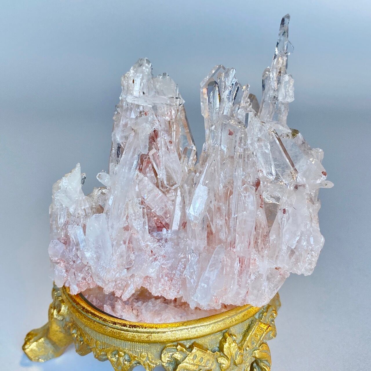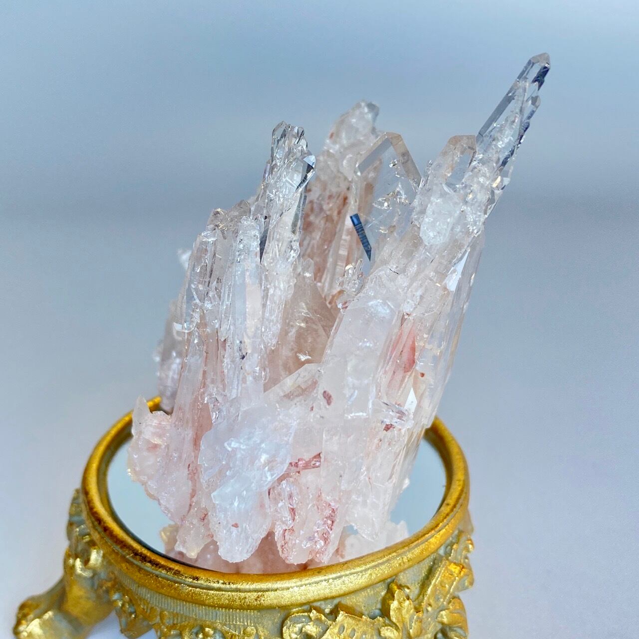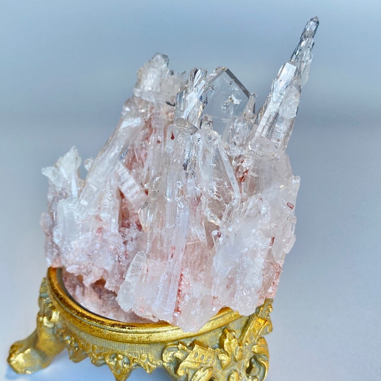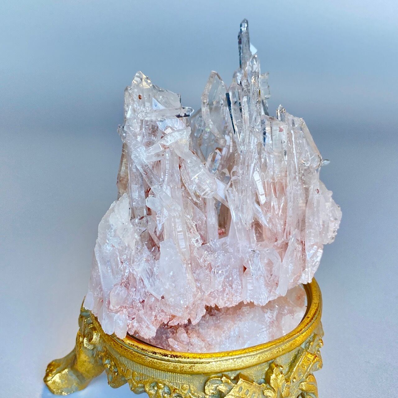 コロンビア産のピンクレムリアンの中でもレア系のファーデンクォーツのクラスターになります。詳しくは、Sacred rosé pink Lemurian quartzと呼ばれ、sacredは『神聖な』を、rosé pinkは『ロゼワインの色のように控えめな淡いピンクの』を意味します。