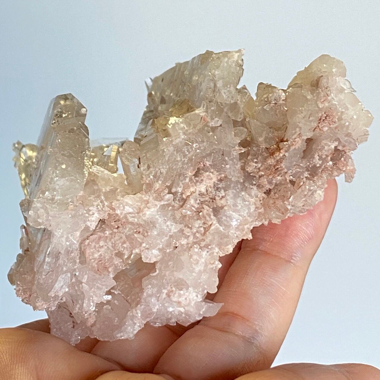 タビュラー部分はクリアクォーツのような見た目ですが、画像のとおり、ピンク色の色素が溜まっている箇所があるため、全体的に薄らとしたピンク色に見えます。裏面には面積が大きい透明度の高い結晶も付いています。母岩の付いていないフローターで、ピンクに若干アプリコットの色調が入っており、画像では上手く色味が出ていないのですが、店主のモニターでは17枚目の画像の色味が一番近しいと思います。