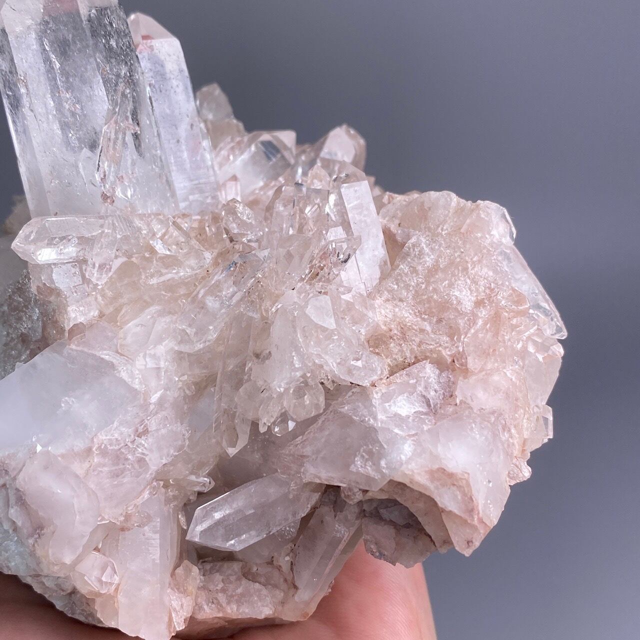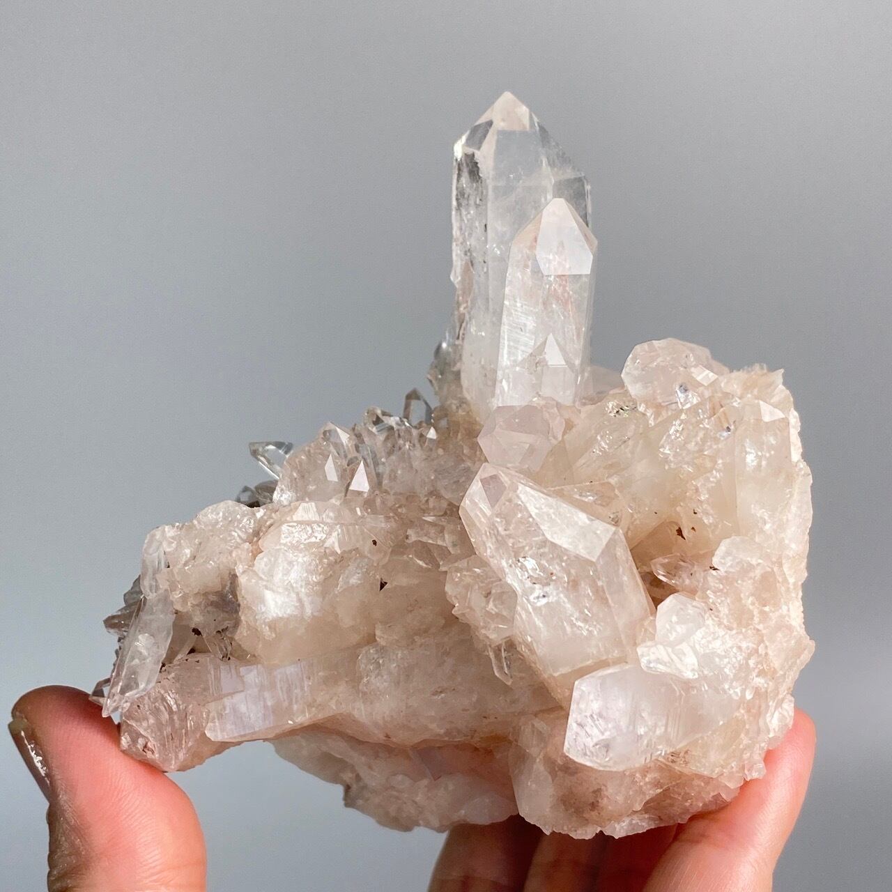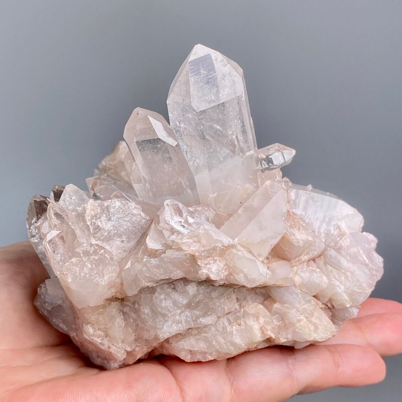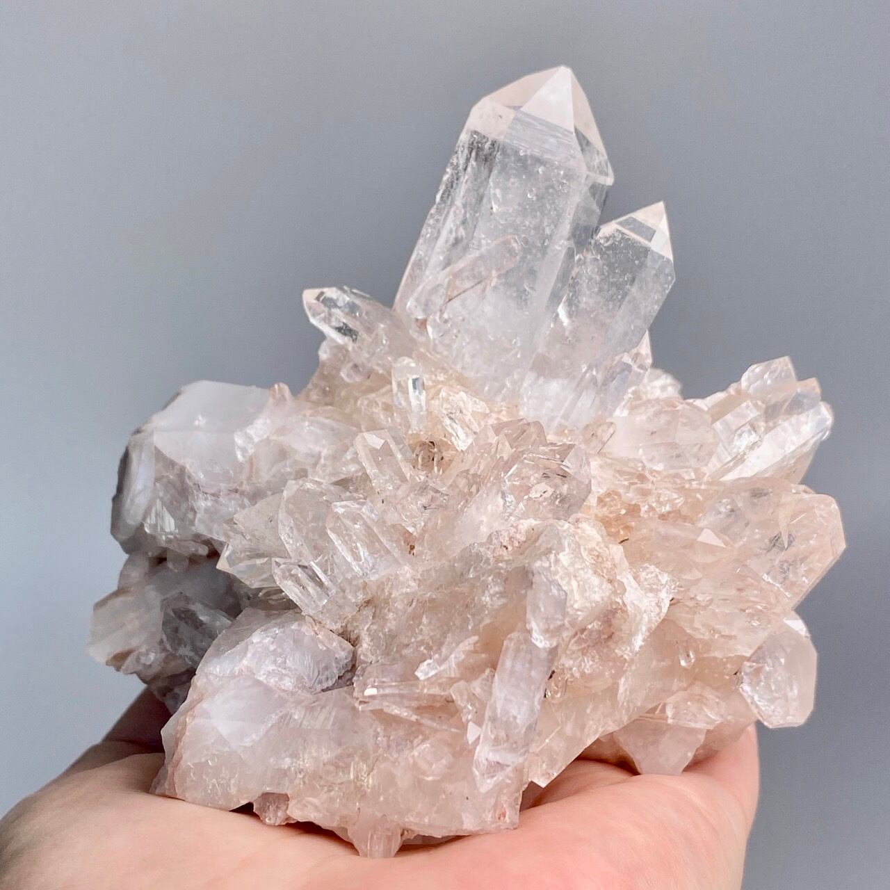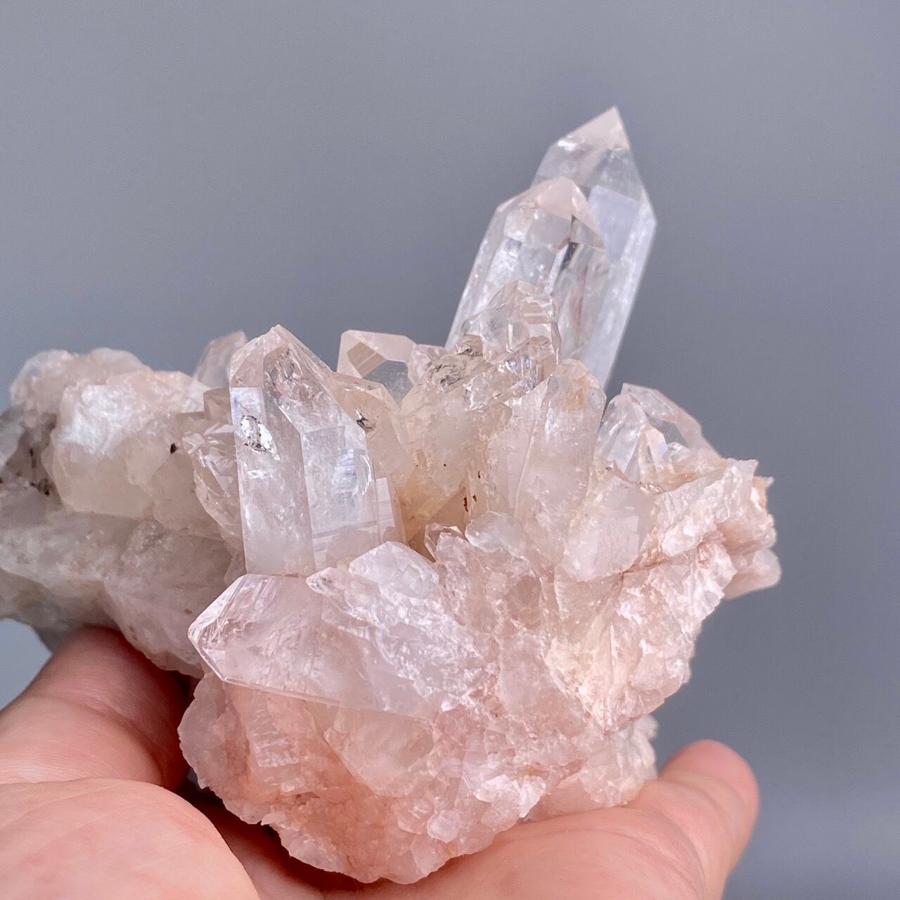 掌に置いて眺めているだけでハートが開くような感覚になる優しいエネルギーを放っていて、お部屋に華を添えてくれる様な美さです。ピンク色を帯びたしっかりとした厚みの母岩の上にそびえ立つポイント達。