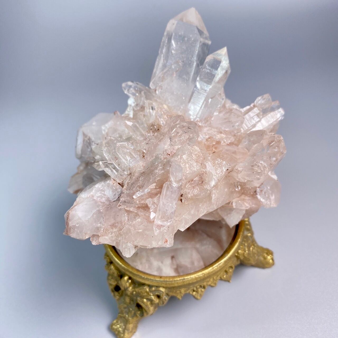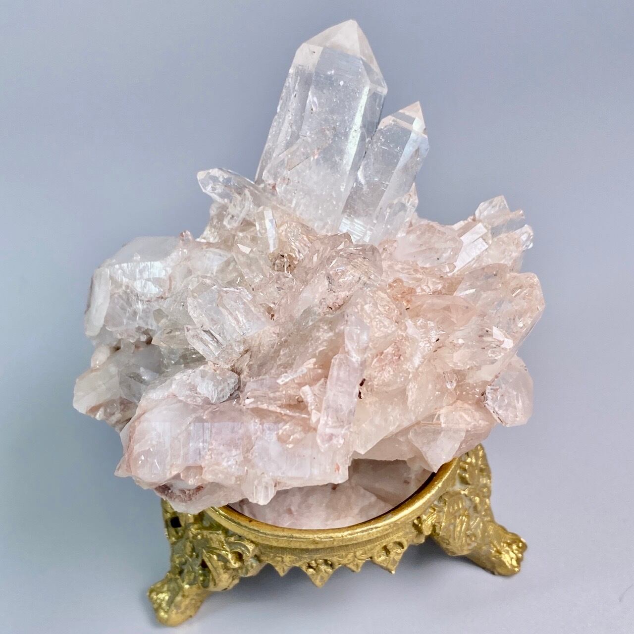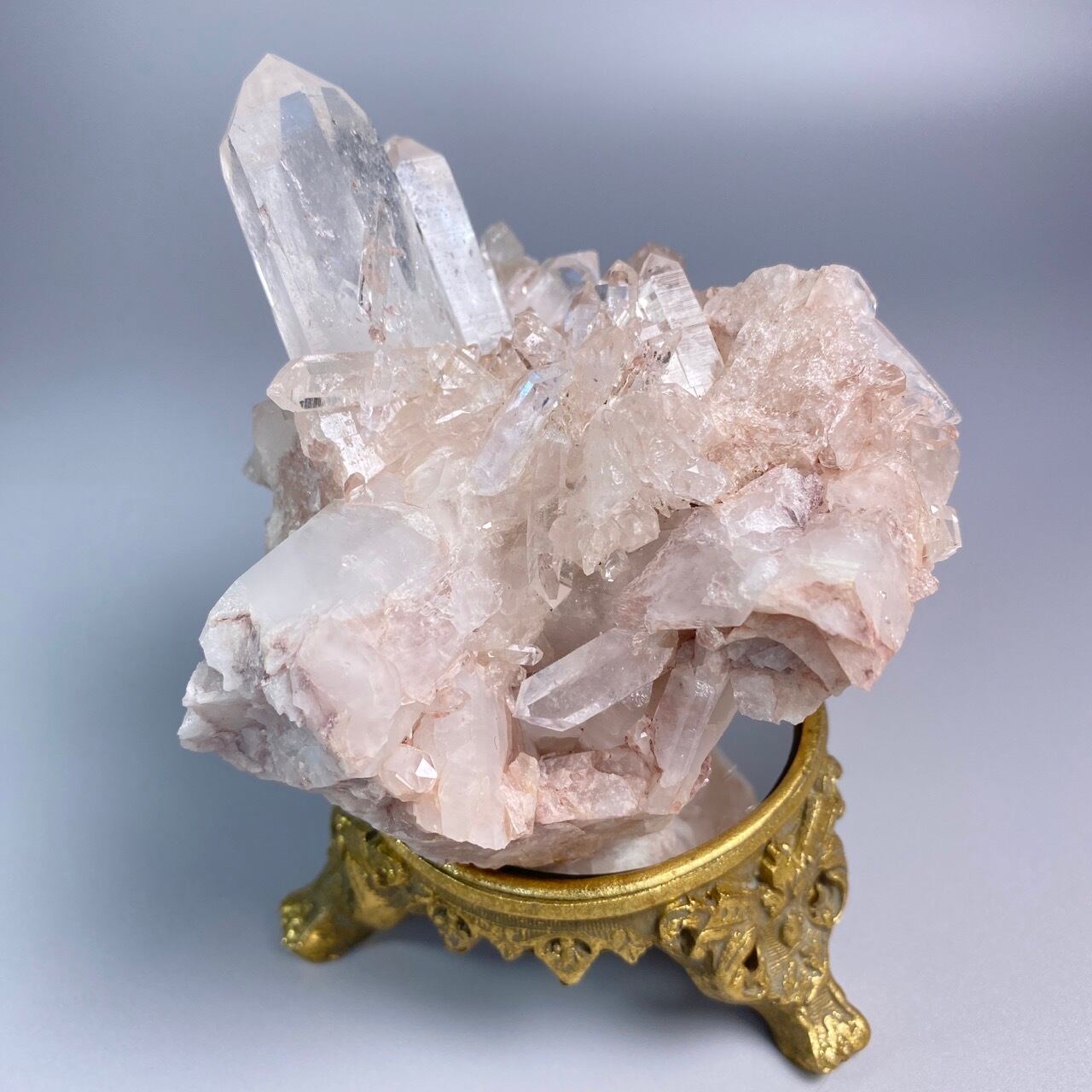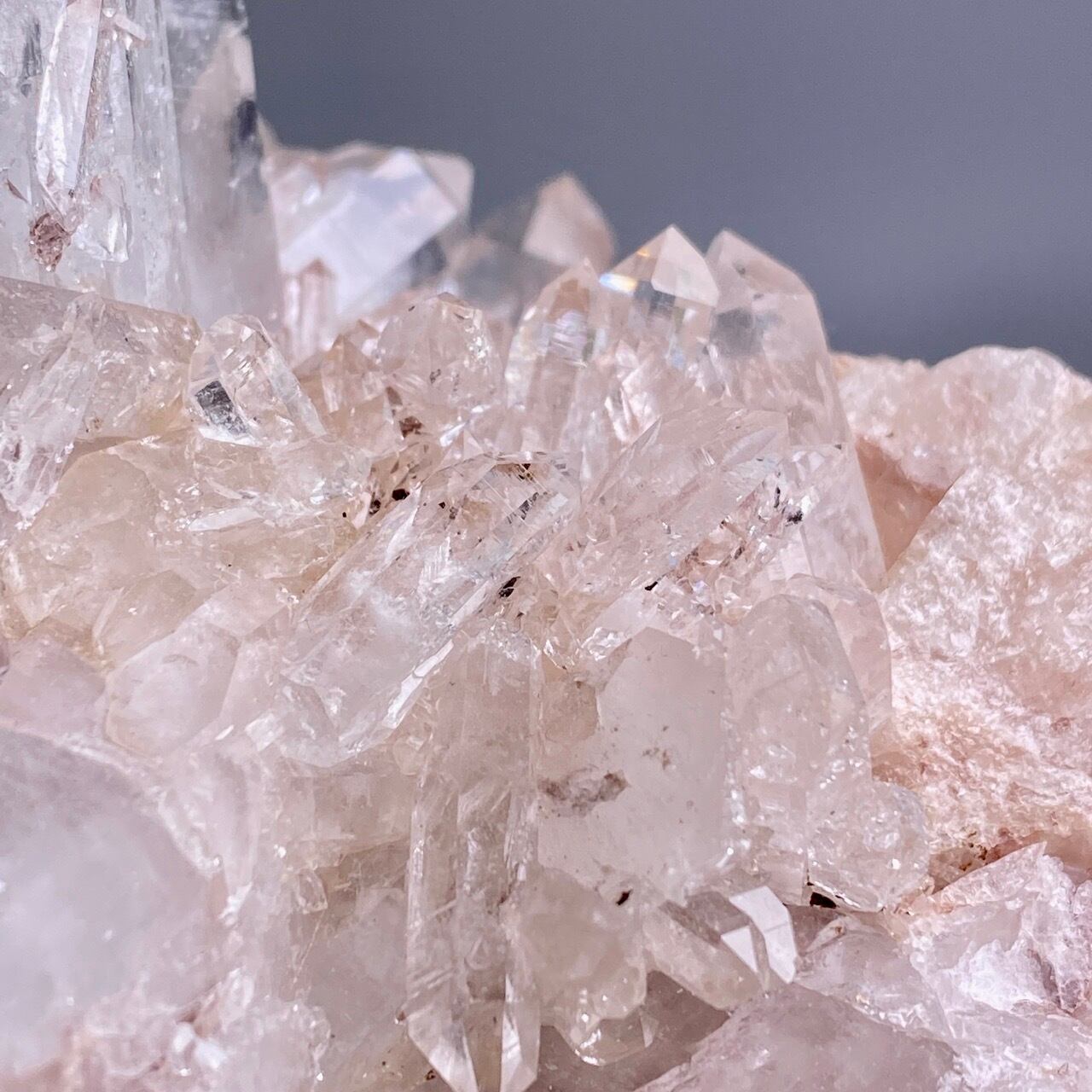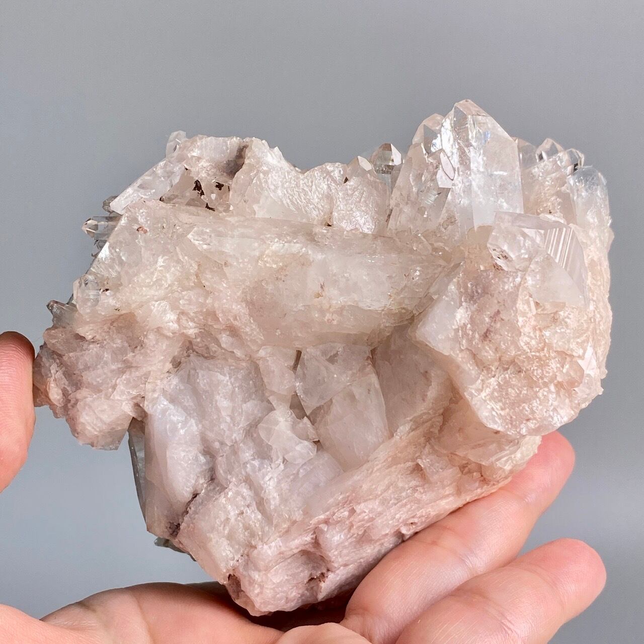 掌に置いて眺めているだけでハートが開くような感覚になる優しいエネルギーを放っていて、お部屋に華を添えてくれる様な美さです。ピンク色を帯びたしっかりとした厚みの母岩の上にそびえ立つポイント達。