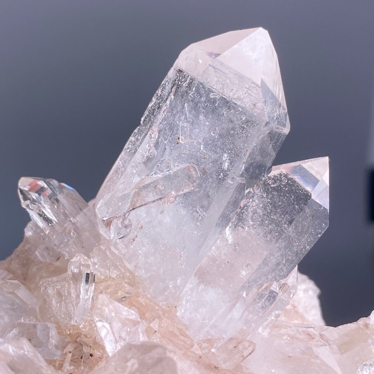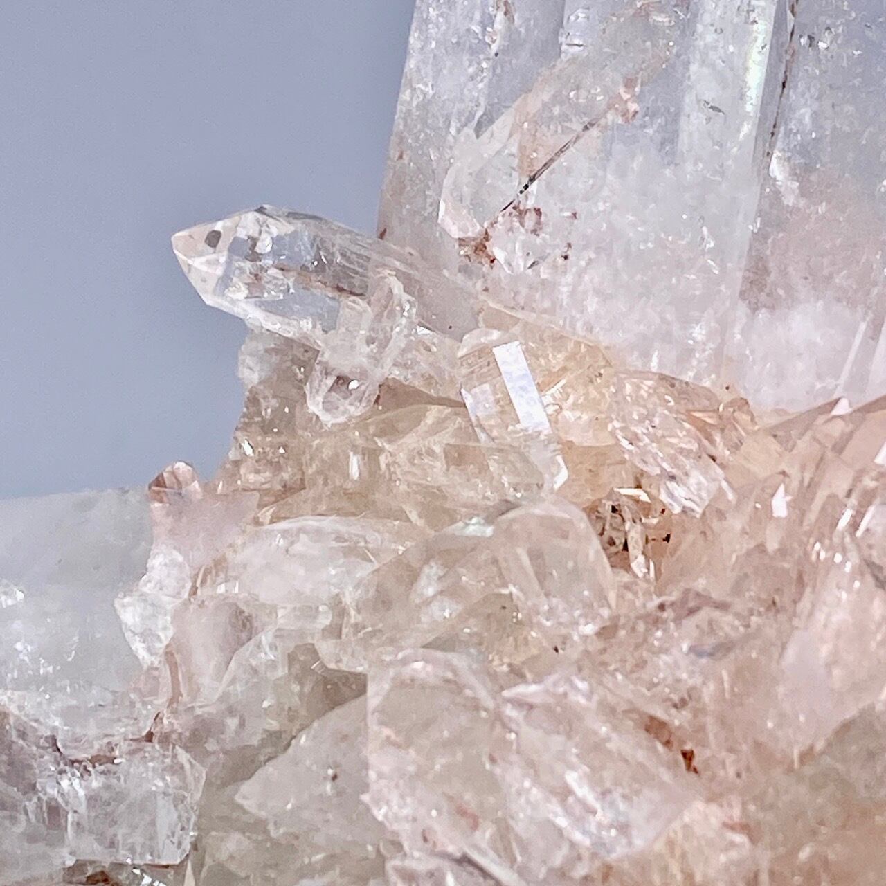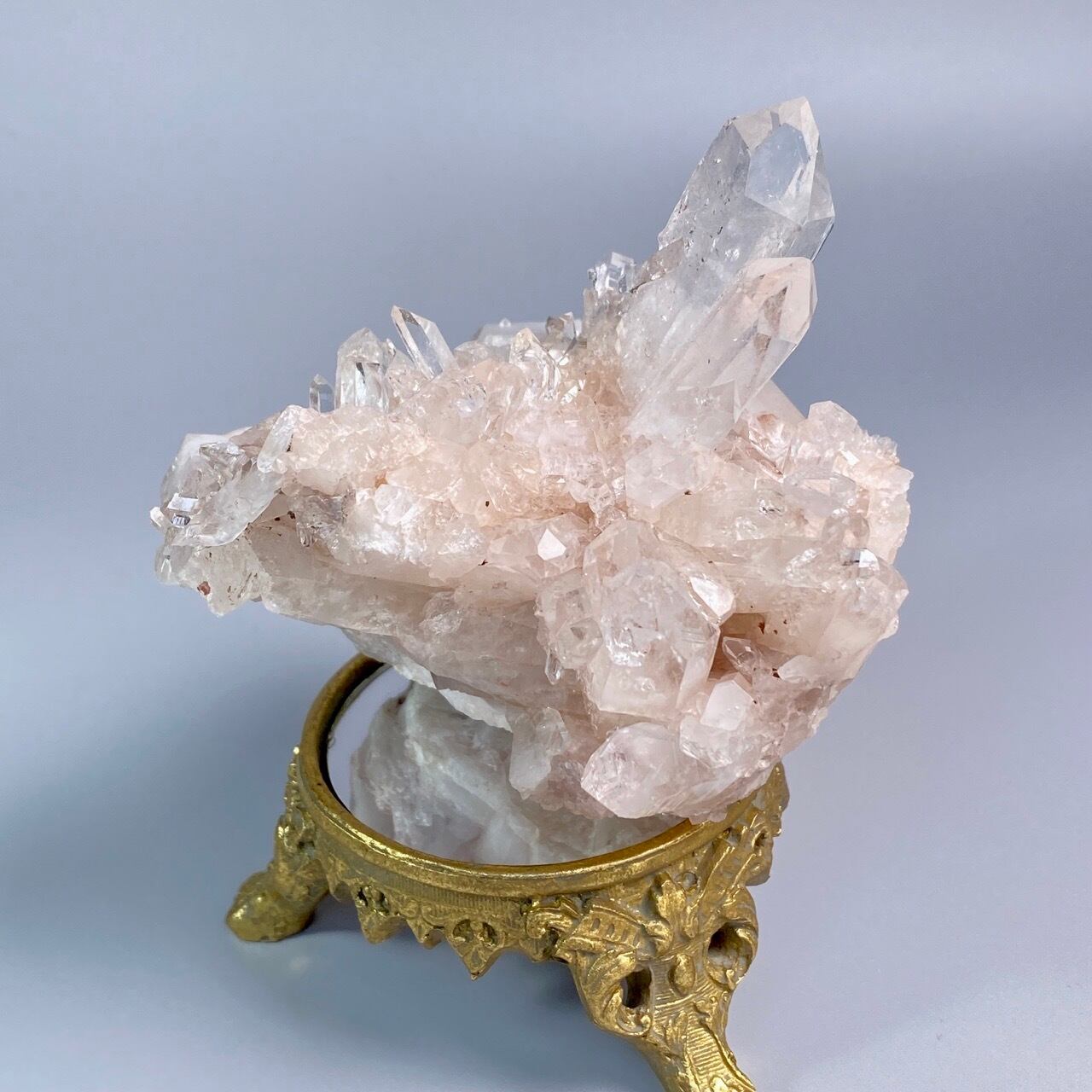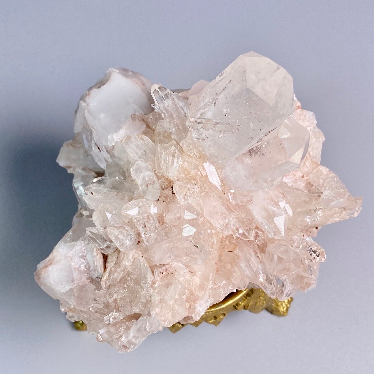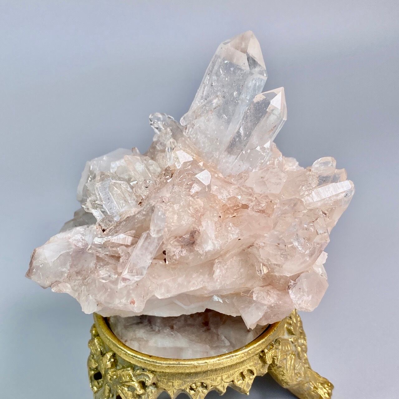 掌に置いて眺めているだけでハートが開くような感覚になる優しいエネルギーを放っていて、お部屋に華を添えてくれる様な美さです。ピンク色を帯びたしっかりとした厚みの母岩の上にそびえ立つポイント達。