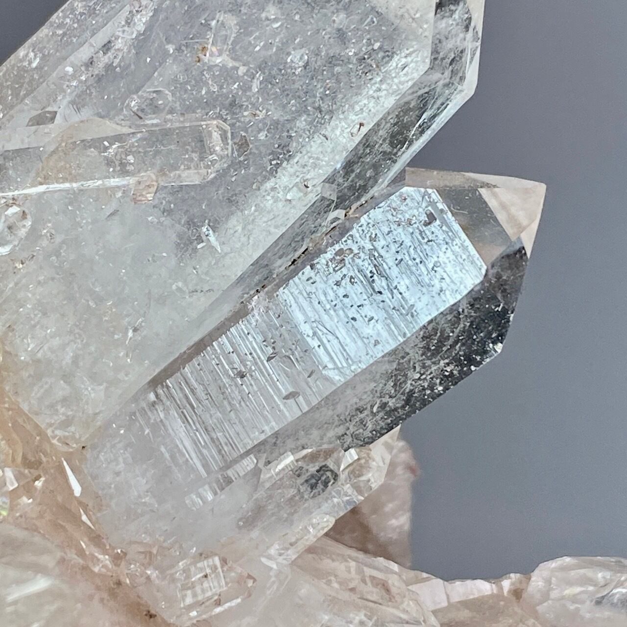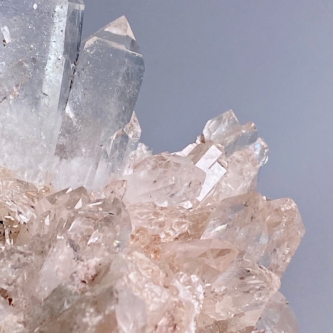 透明度は個体によって異なります。ピンクレムリアンに関しては、形状も一般的なクラスターに加え、沢山のポイントが折り重なっている形状や、非常にレアなタビュラー型のファーデンクォーツのフォーメンションから成ります。