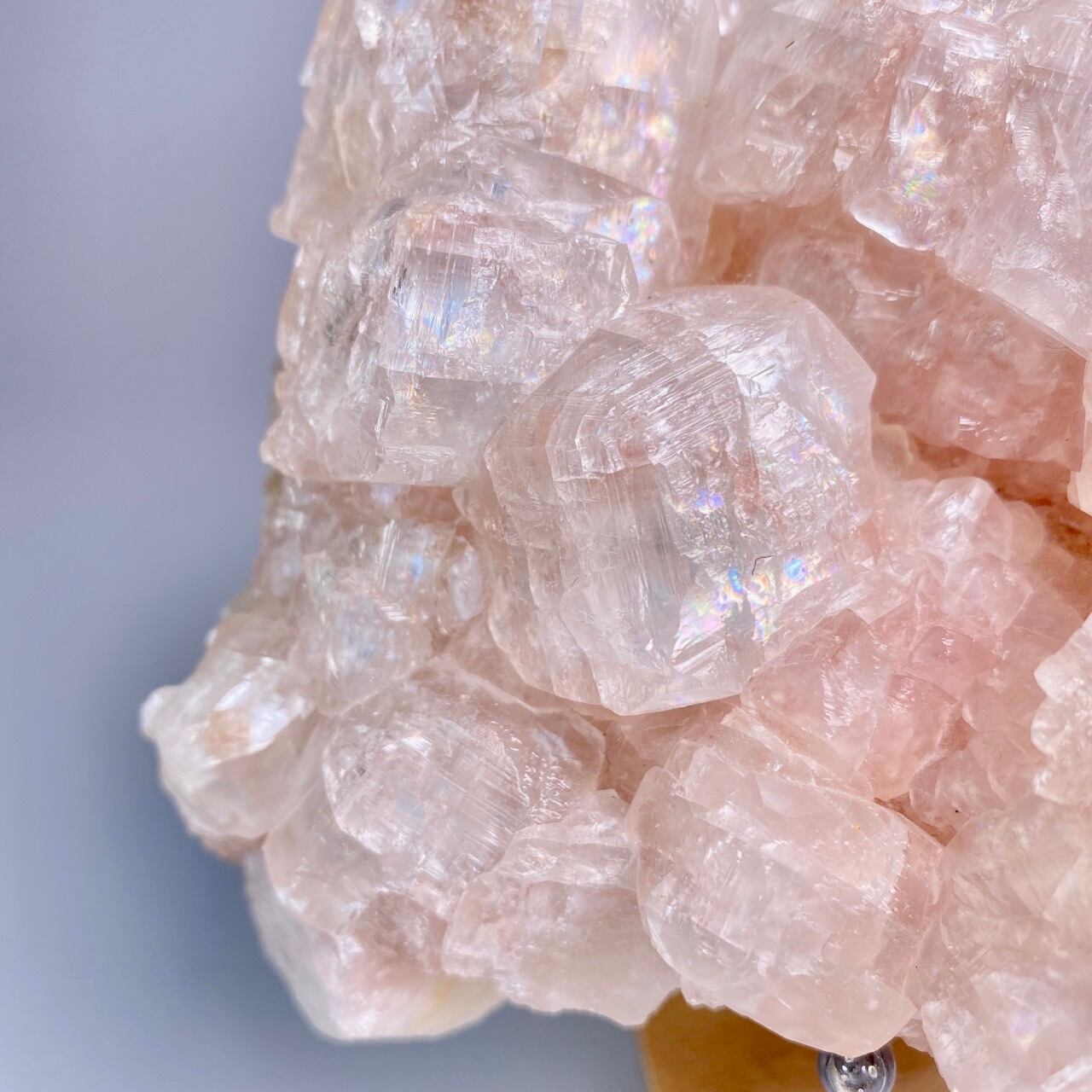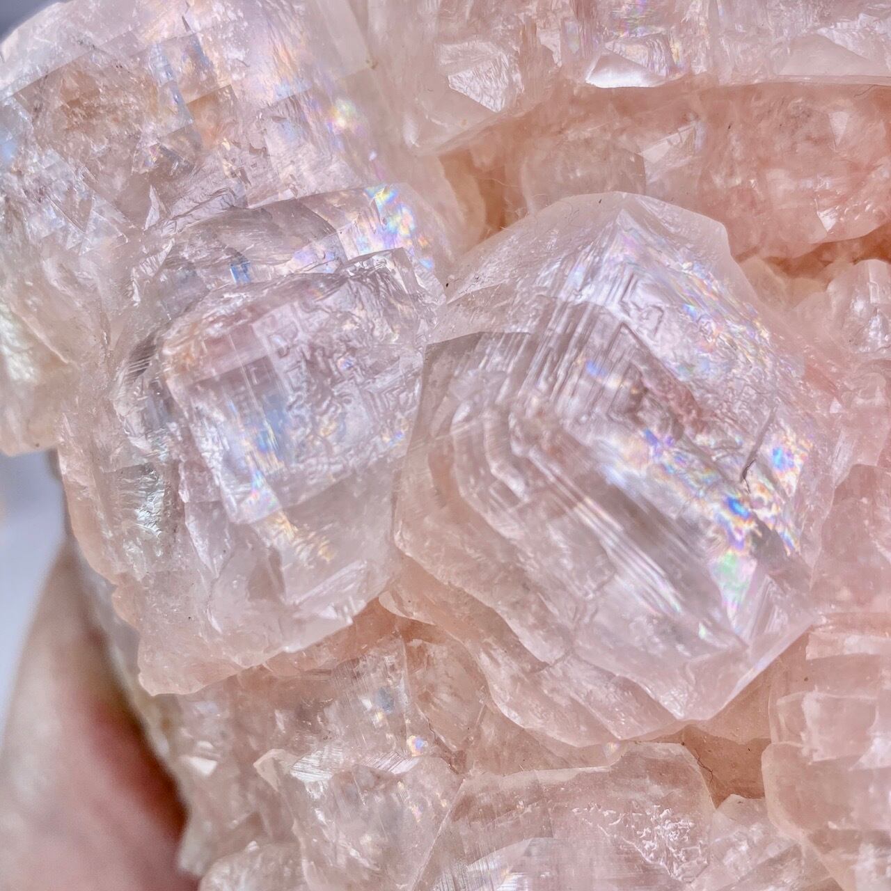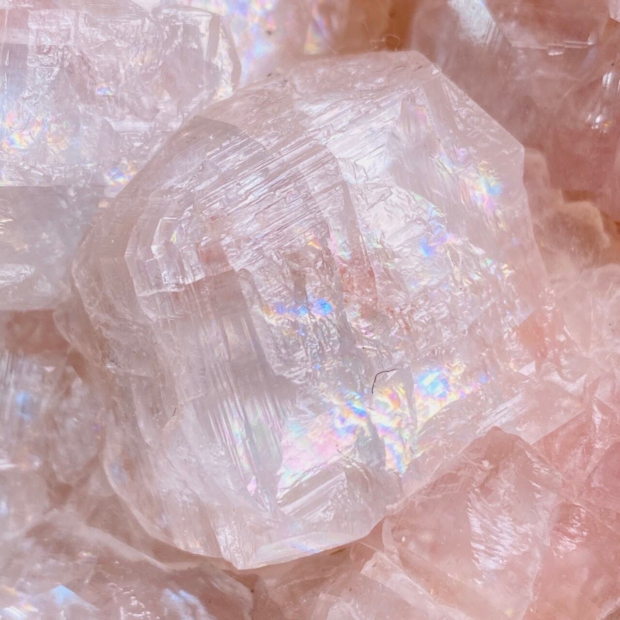 カルサイトだけに半透明な結晶から母岩のピンク色が薄らと見え、結晶の輝きの中にところどころ虹が見えます。底面は一面母岩に覆われています。