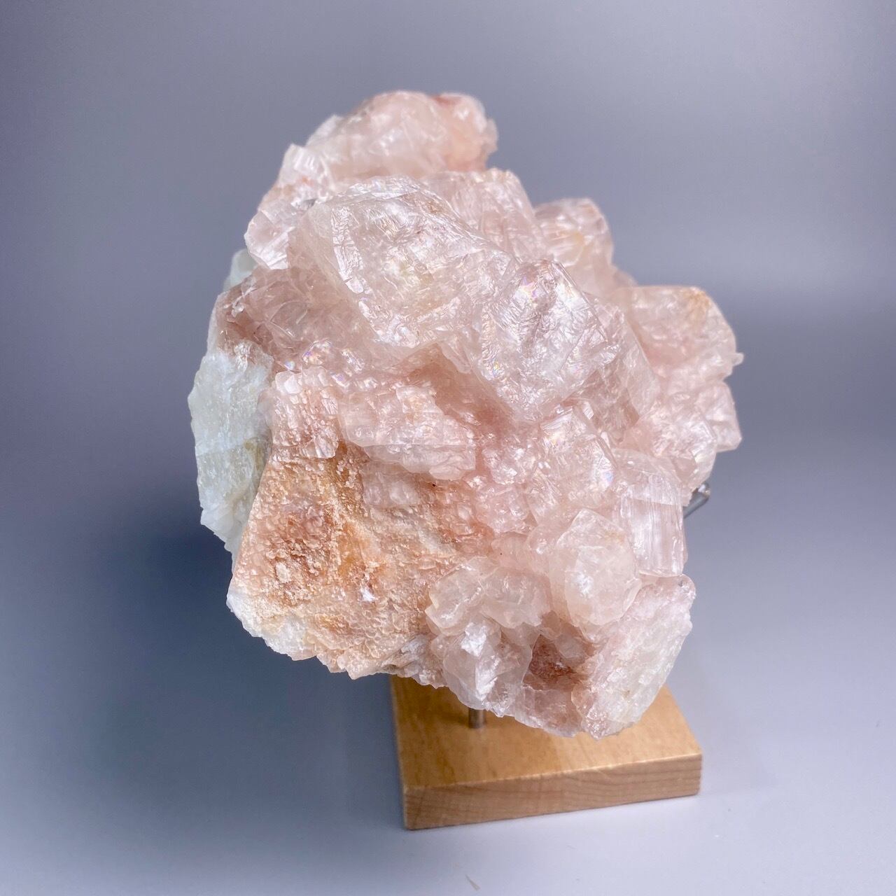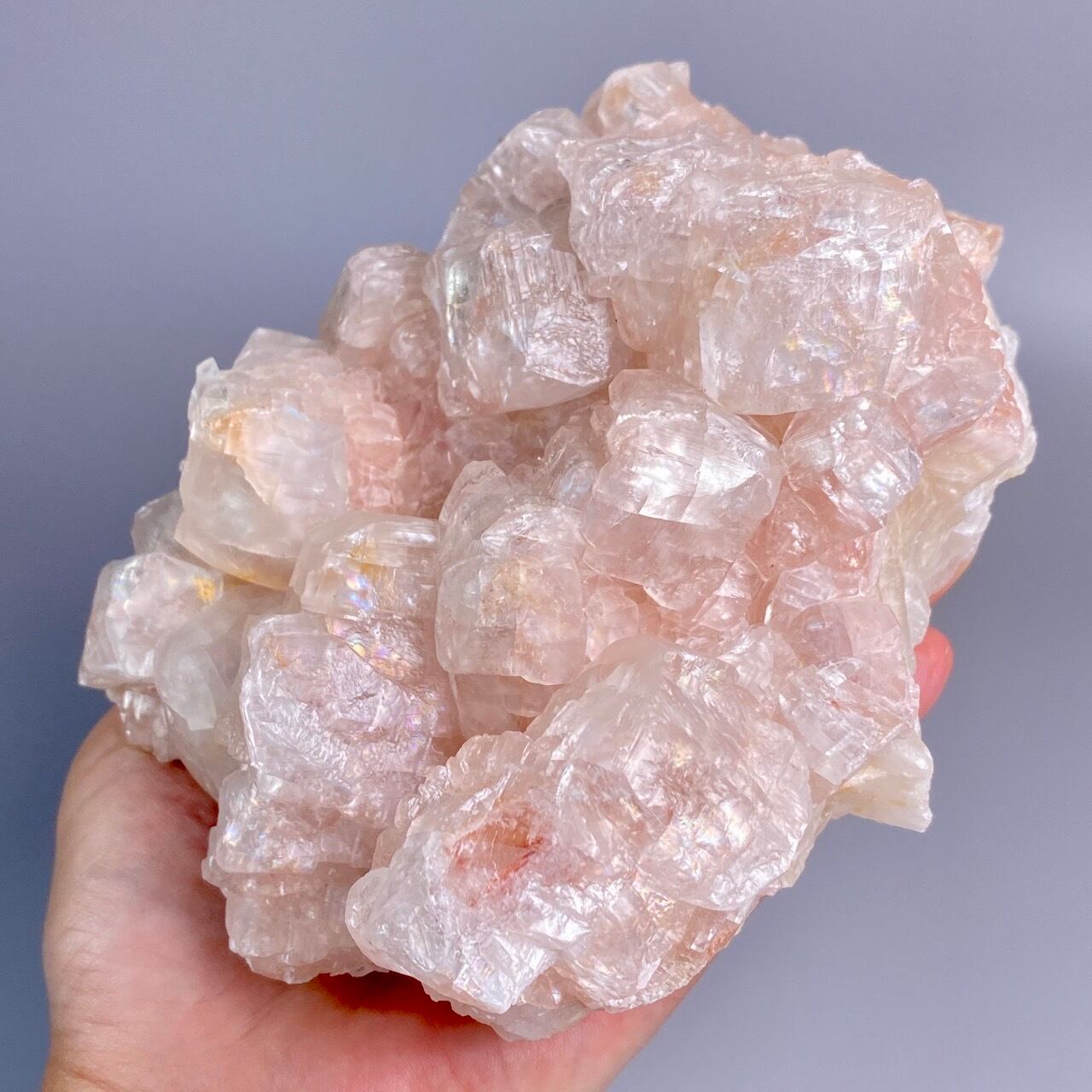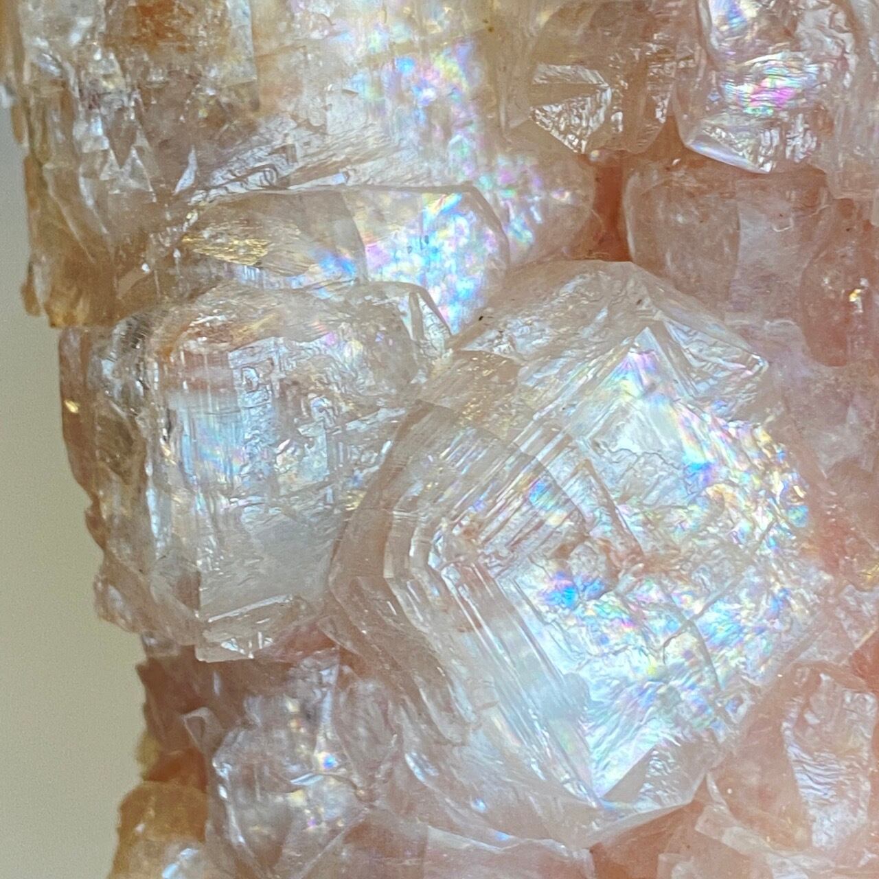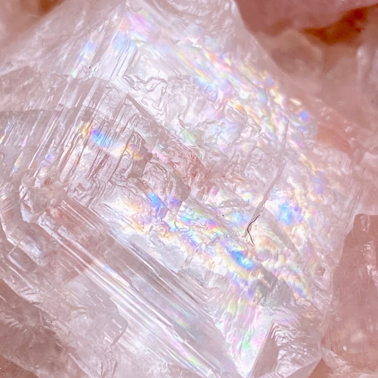 カルサイトだけに半透明な結晶から母岩のピンク色が薄らと見え、結晶の輝きの中にところどころ虹が見えます。底面は一面母岩に覆われています。