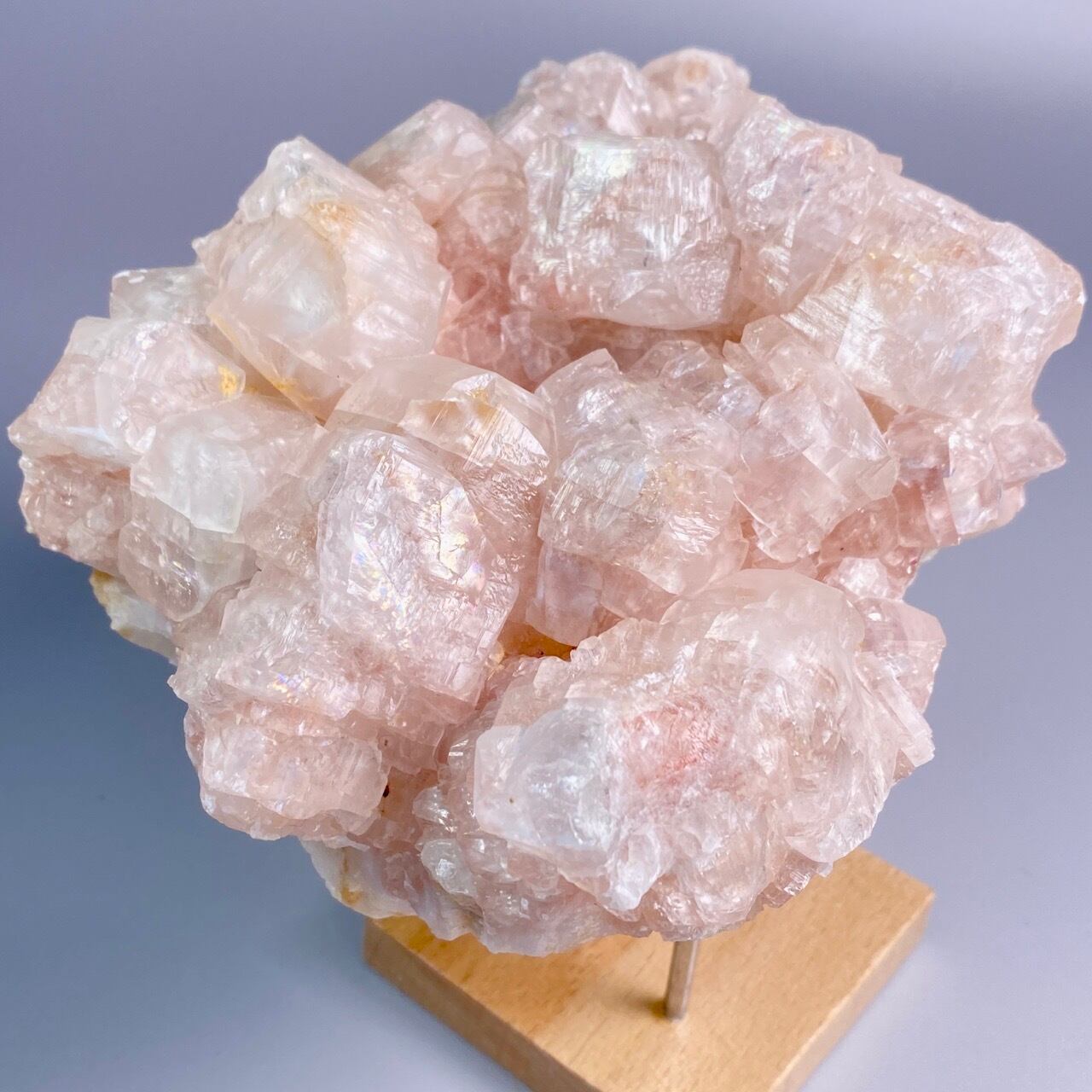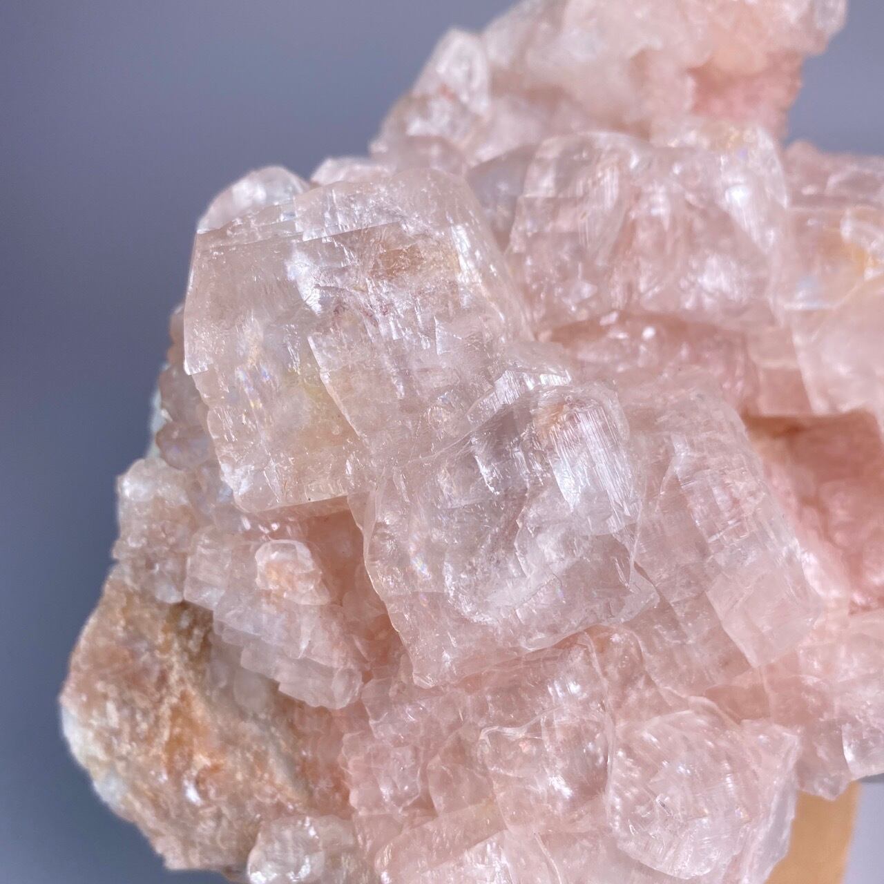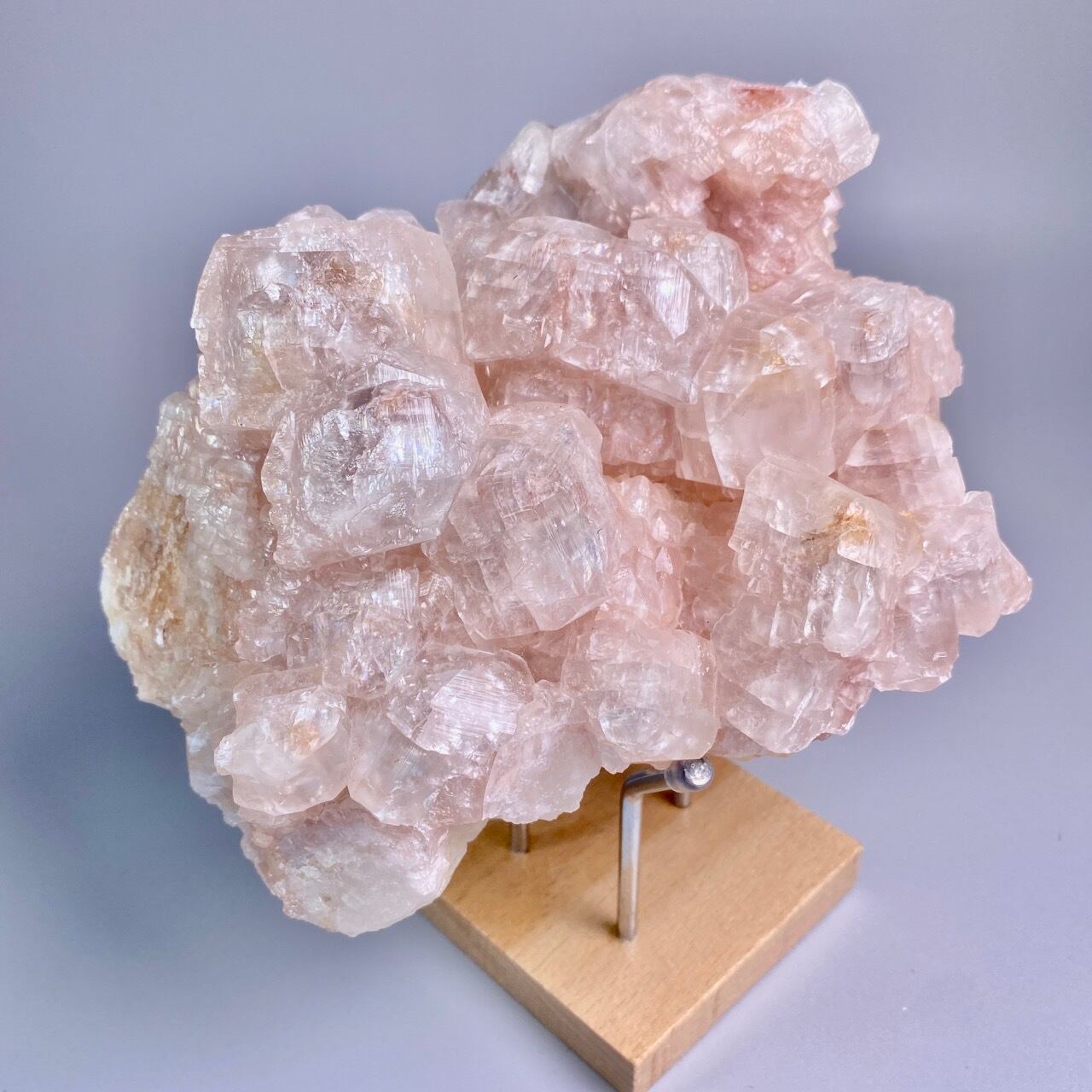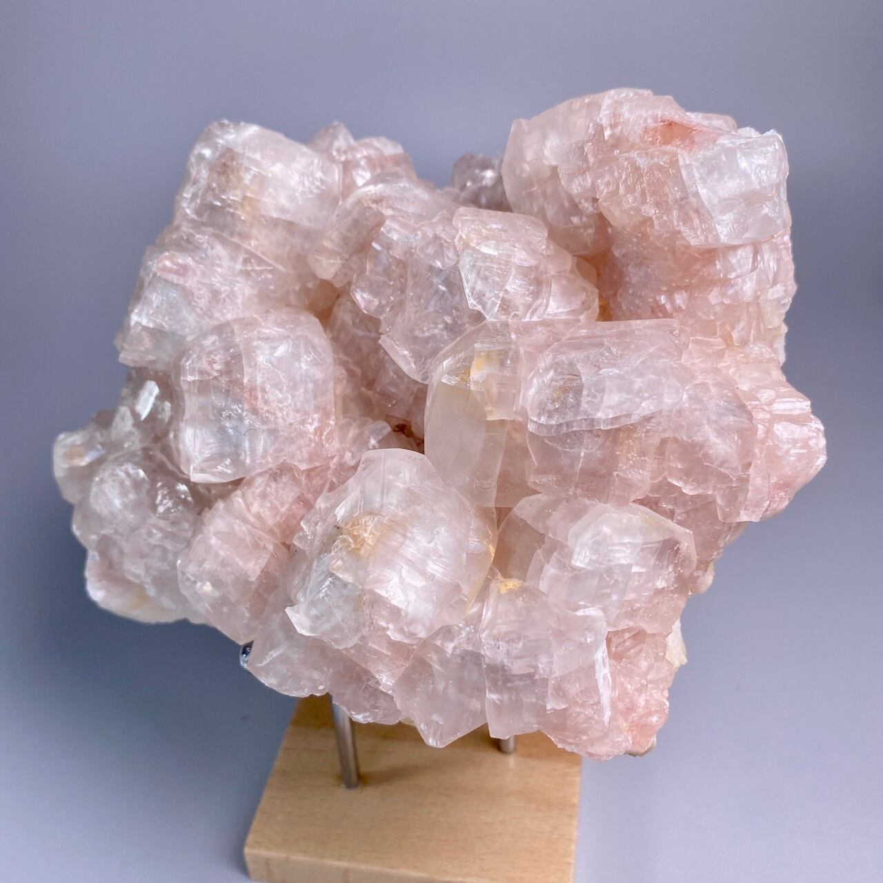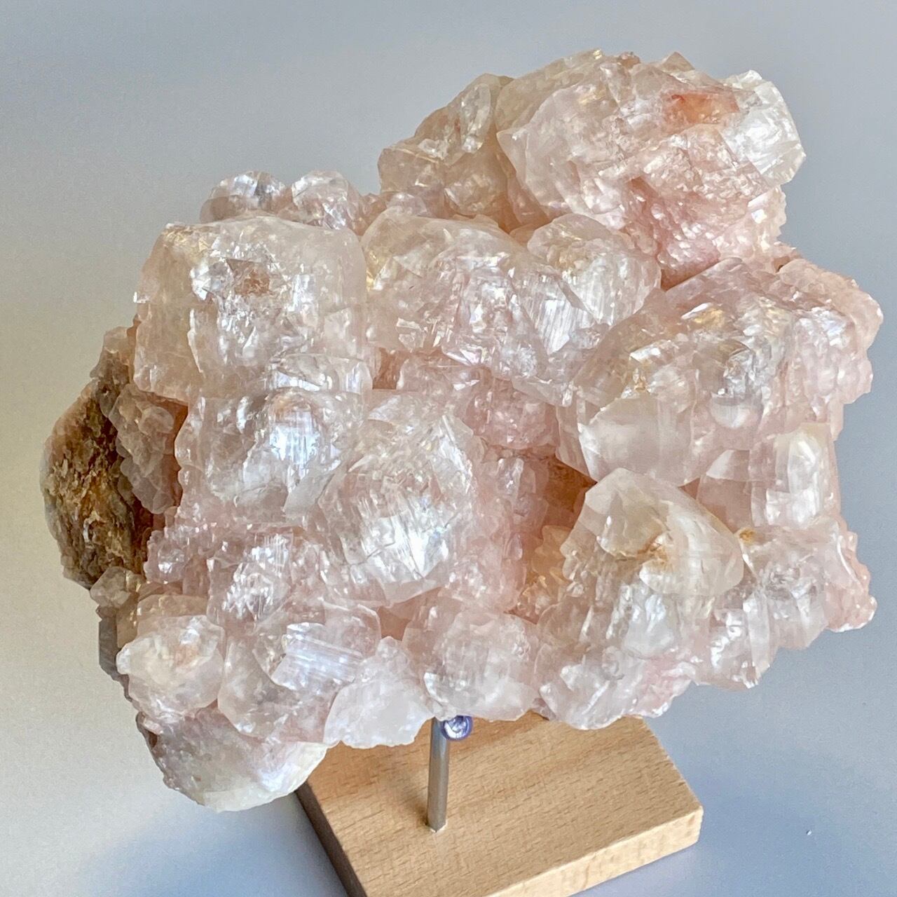 マーケットに良く出回っている、歯の様な硬さのギザギザとした硬い結晶のピンクカルサイトとは異なり、数ヶ月前に少量のみ市場に出た、ピンク色を帯びた母岩に共生する立体的な結晶が魅惑的な光沢を放つクラスターをお迎えしました。