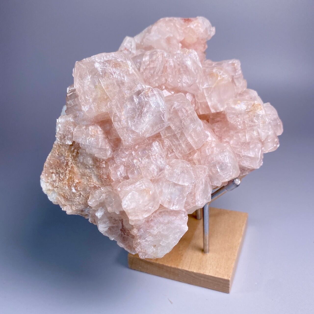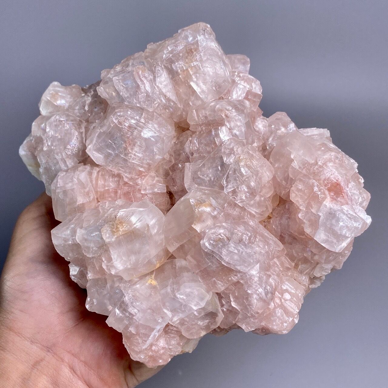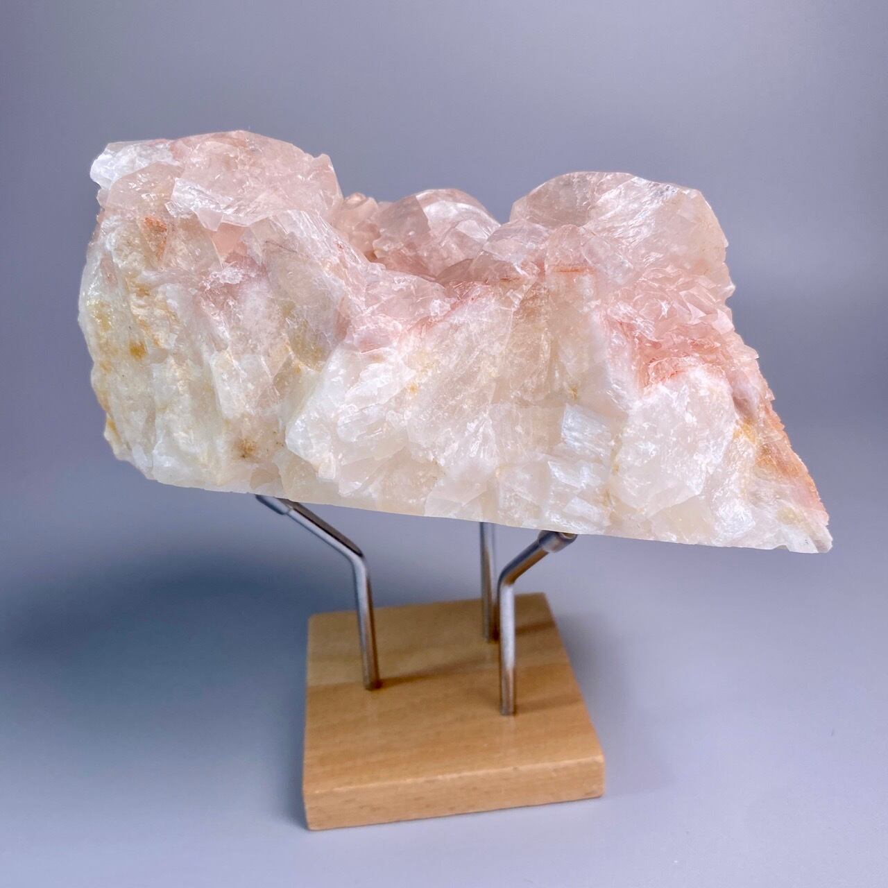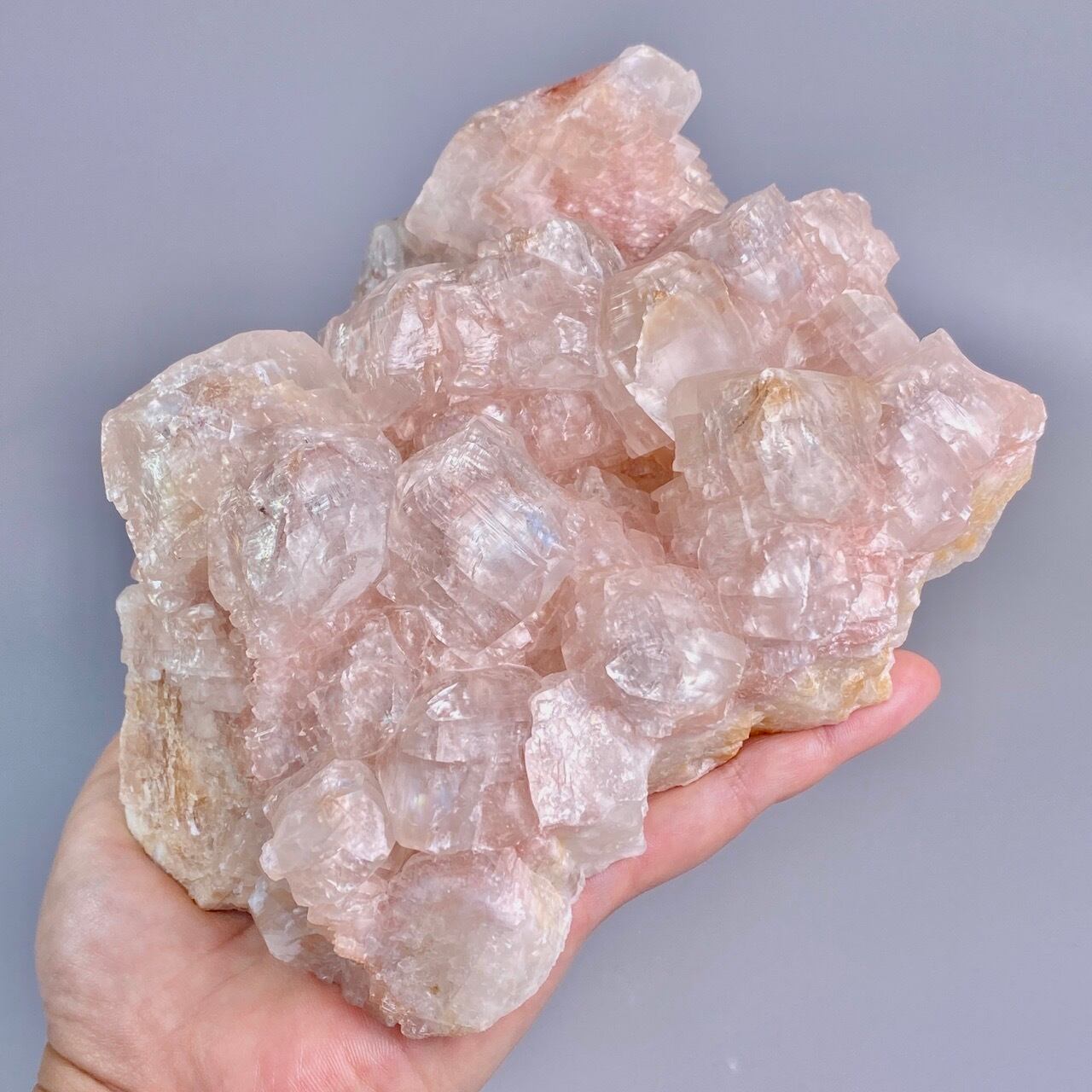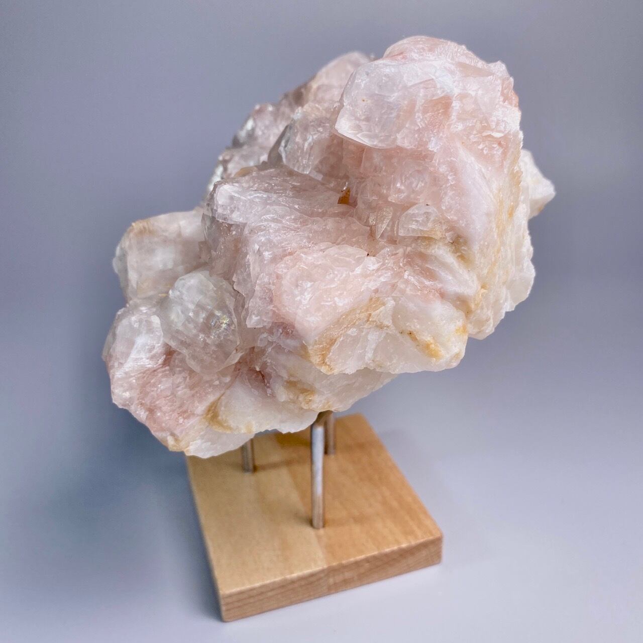マーケットに良く出回っている、歯の様な硬さのギザギザとした硬い結晶のピンクカルサイトとは異なり、数ヶ月前に少量のみ市場に出た、ピンク色を帯びた母岩に共生する立体的な結晶が魅惑的な光沢を放つクラスターをお迎えしました。