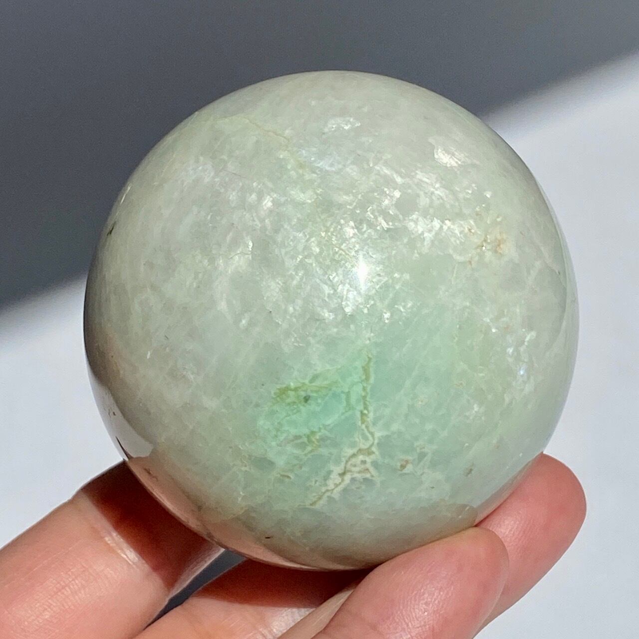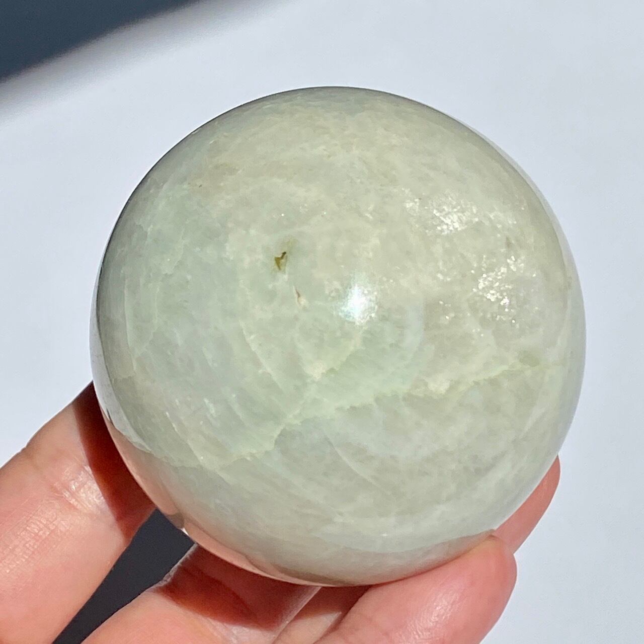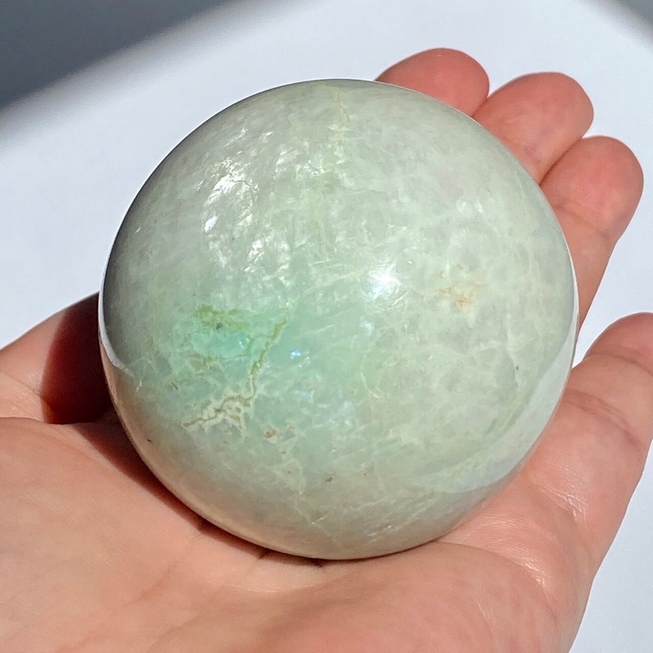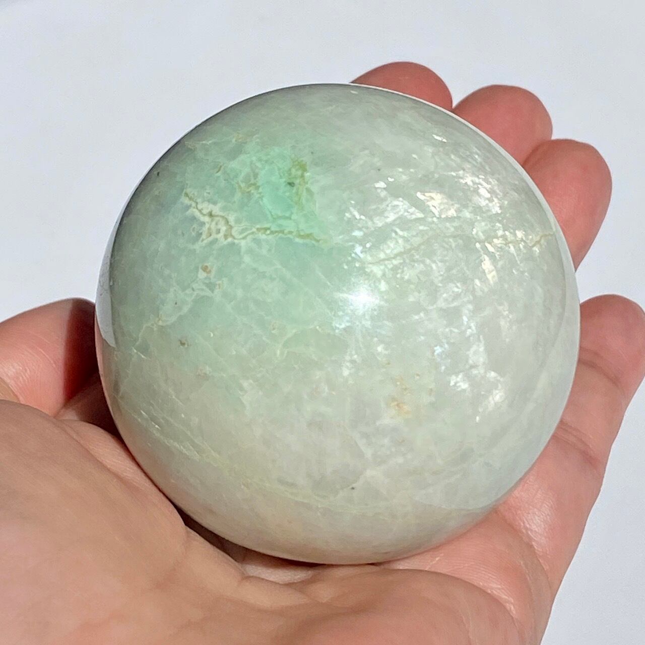 この子は、セラーの子がガーニエライトを探して見せてくれた時、む?普通のムーンストーンでは?と正直思いました。その子がスフィアを回転し始めて、青と白が混じったシラーがフラッシュした次の瞬間、控えめなミントグリーンの箇所が現れた途端、心が萌えるのを感じました。