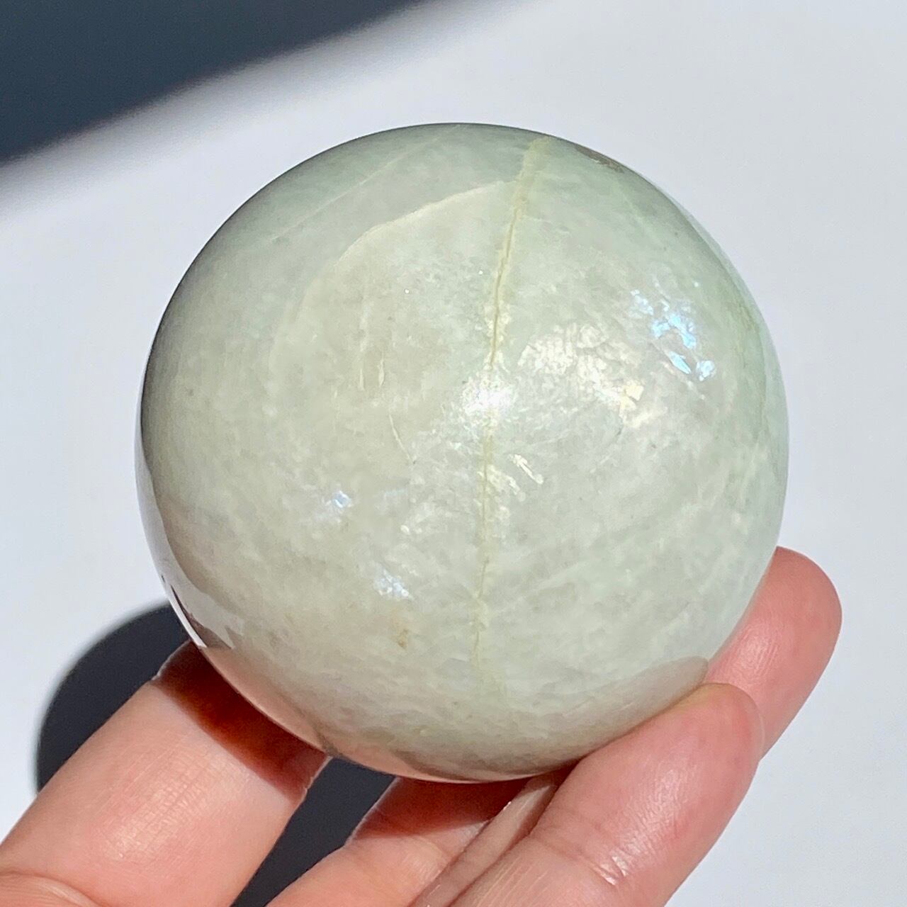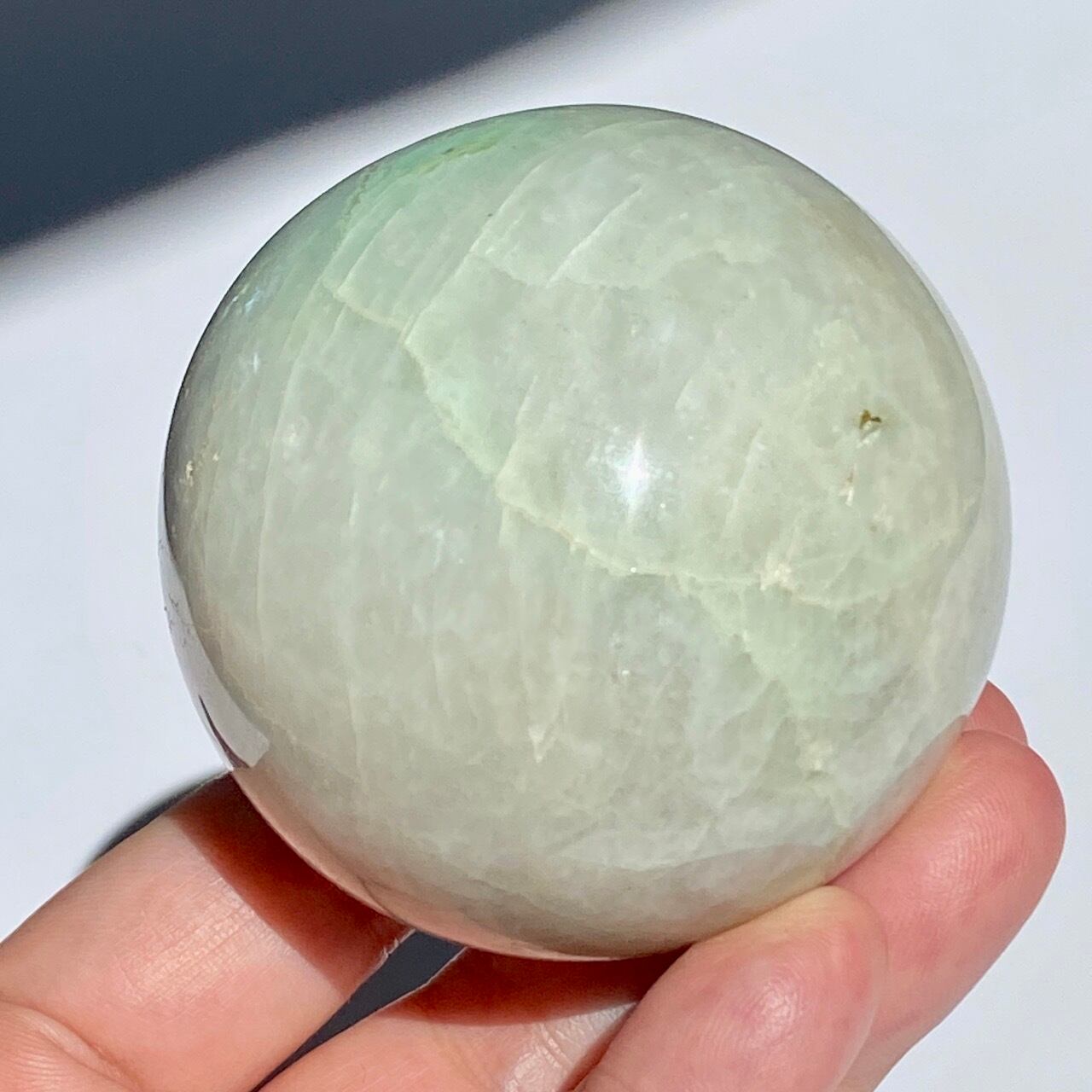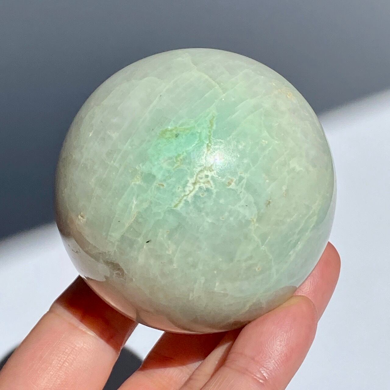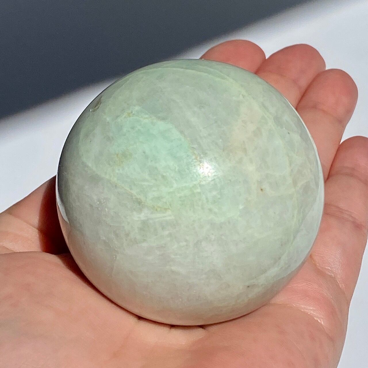 この子は、セラーの子がガーニエライトを探して見せてくれた時、む?普通のムーンストーンでは?と正直思いました。その子がスフィアを回転し始めて、青と白が混じったシラーがフラッシュした次の瞬間、控えめなミントグリーンの箇所が現れた途端、心が萌えるのを感じました。