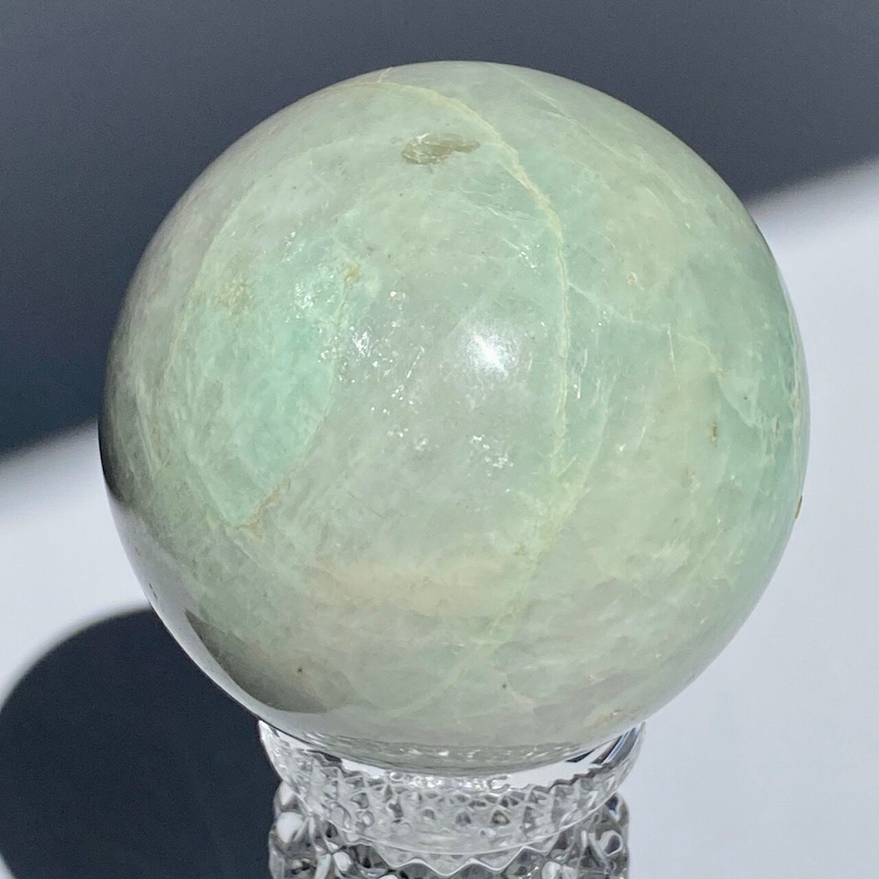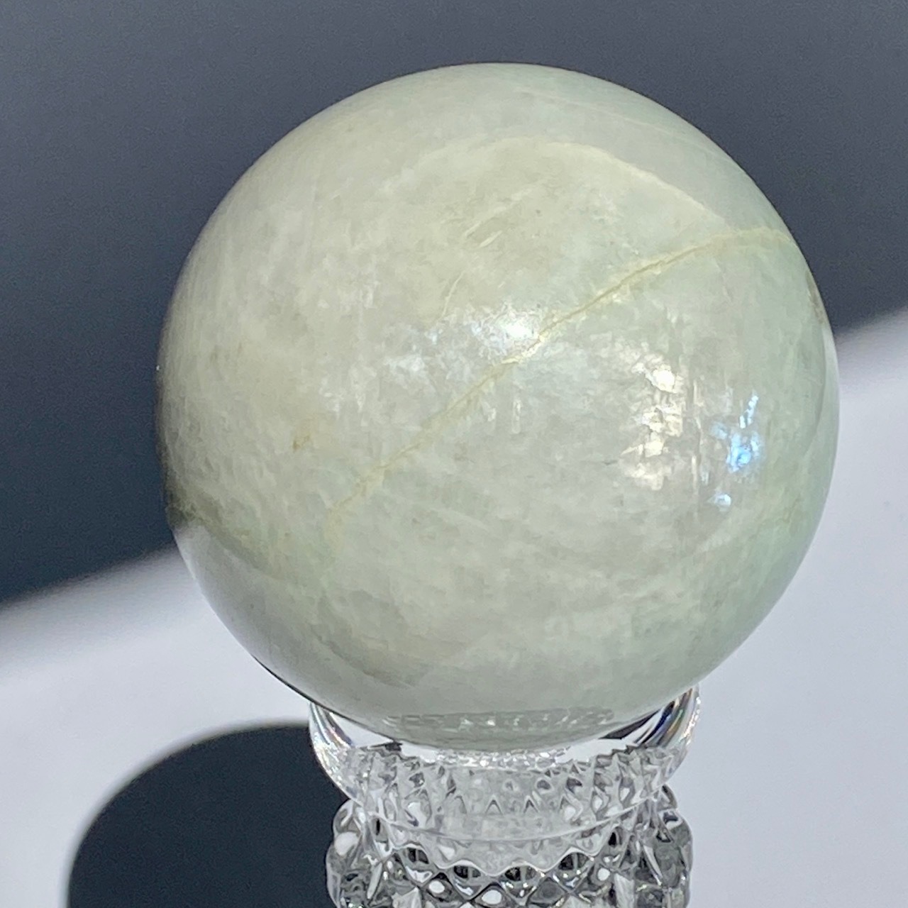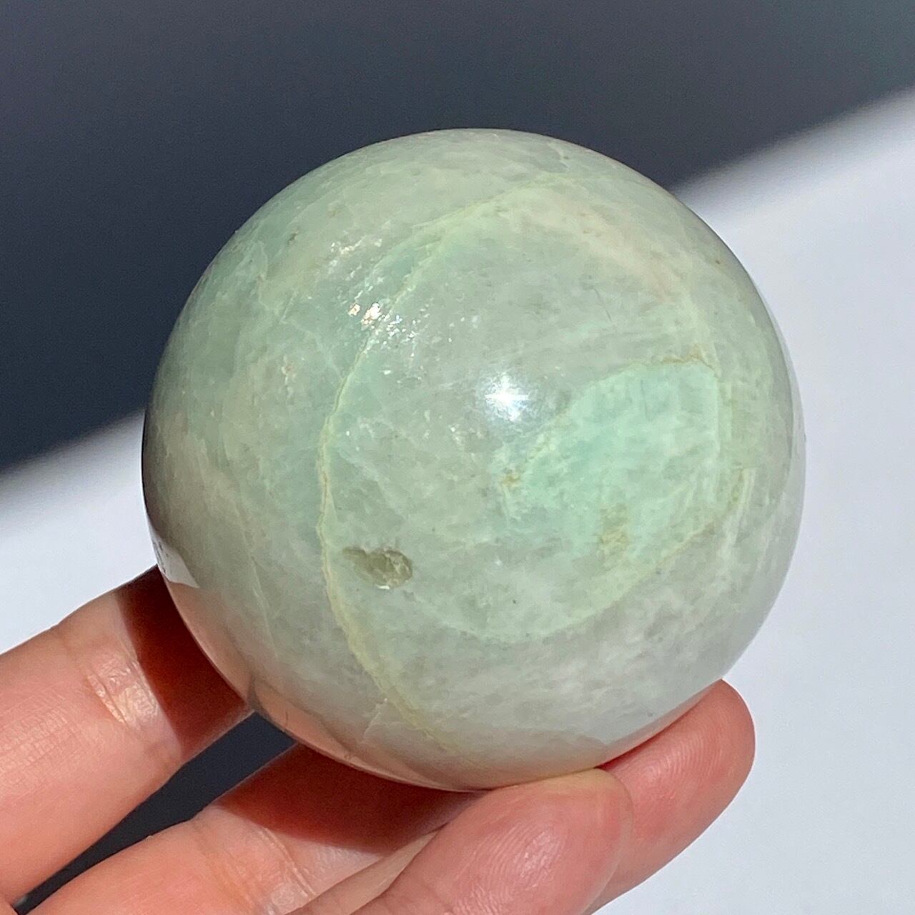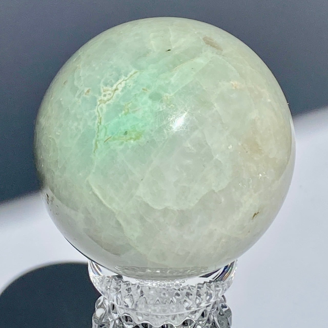 この子は、セラーの子がガーニエライトを探して見せてくれた時、む?普通のムーンストーンでは?と正直思いました。その子がスフィアを回転し始めて、青と白が混じったシラーがフラッシュした次の瞬間、控えめなミントグリーンの箇所が現れた途端、心が萌えるのを感じました。
