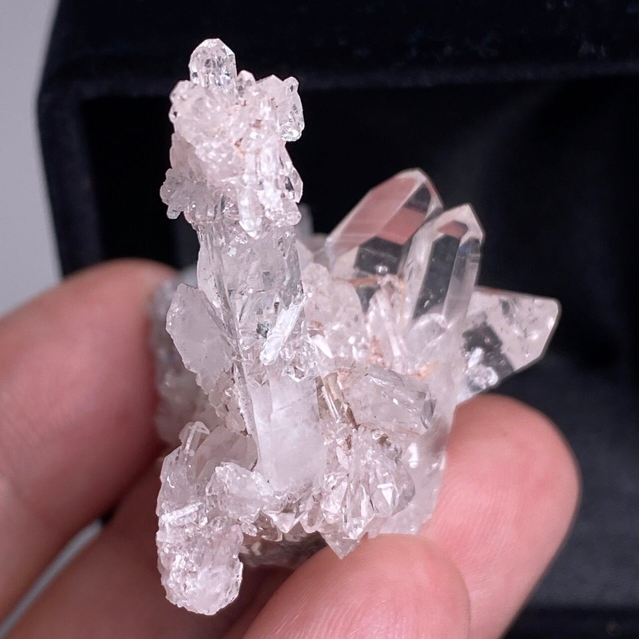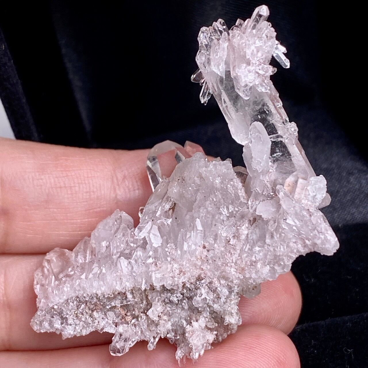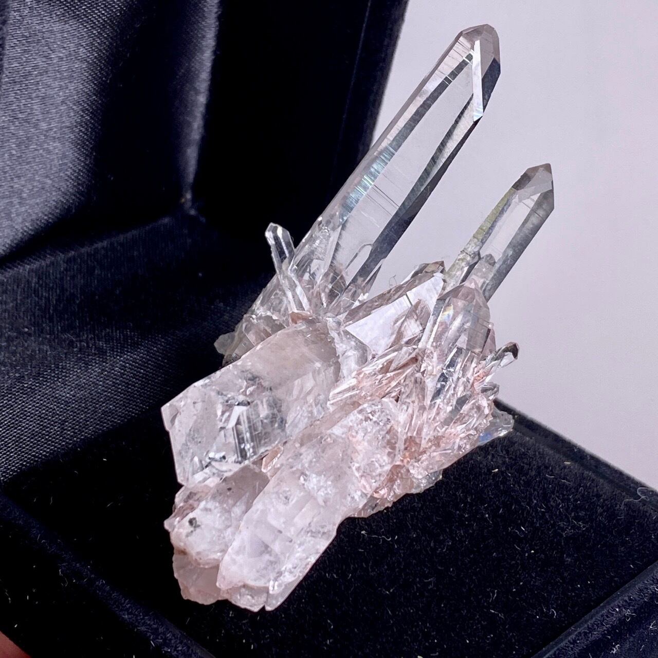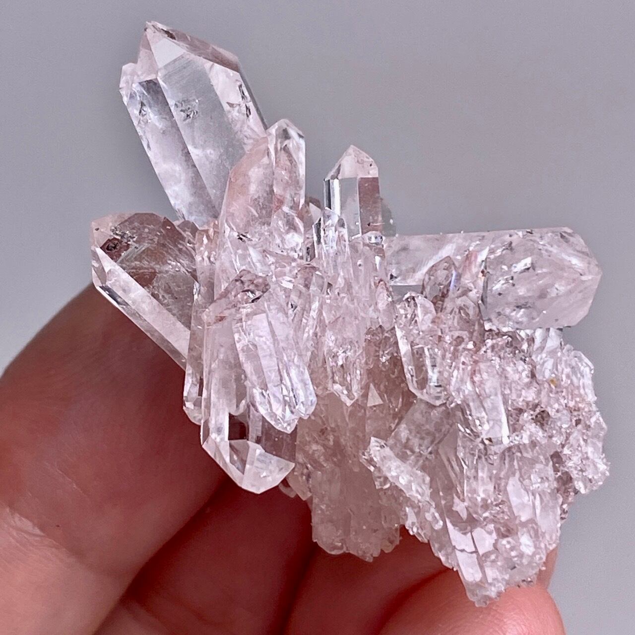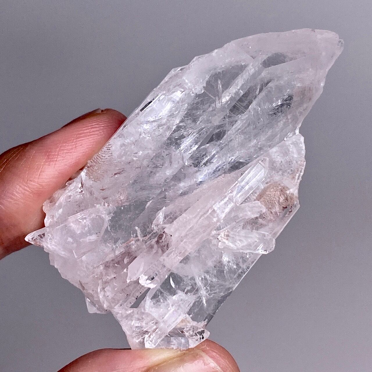 透明度は個体によって異なります。ピンクレムリアンに関しては、形状も一般的なクラスターに加え、沢山のポイントが折り重なっている形状や、非常にレアなタビュラー型のファーデンクォーツのフォーメンションから成ります。