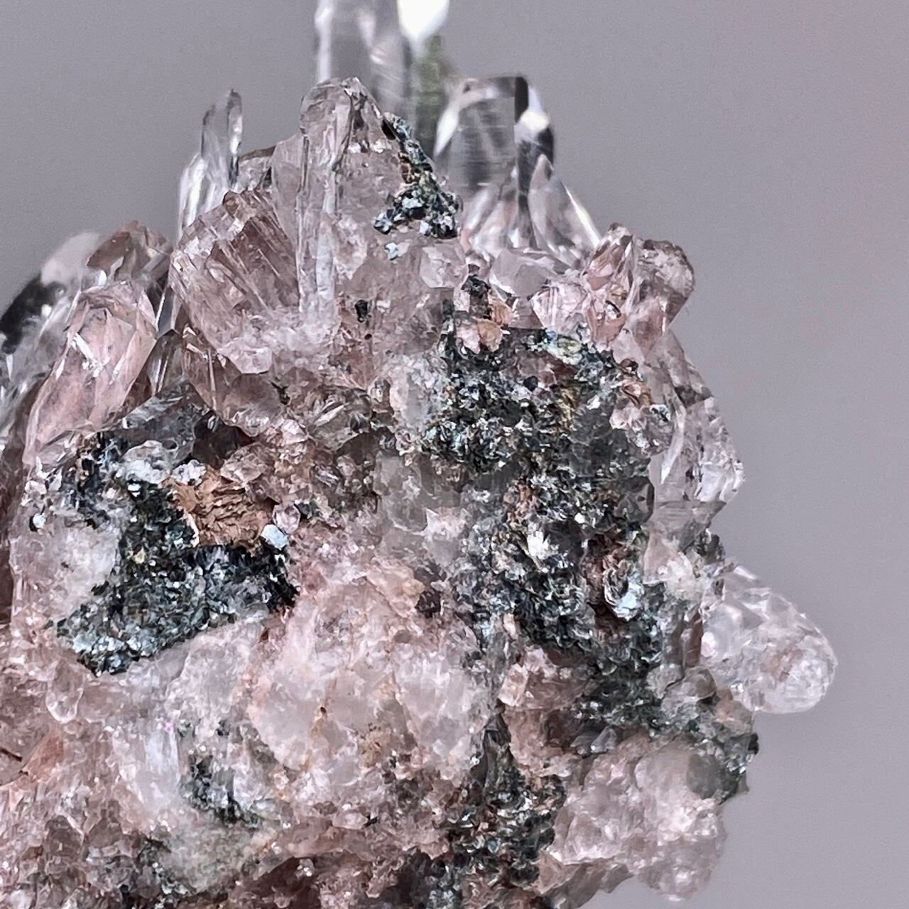 そして、緑色(黒)っぽいインクルージョンはクリノクロア(斜緑泥石)で、緑泥石グループに属する粘土鉱物です。