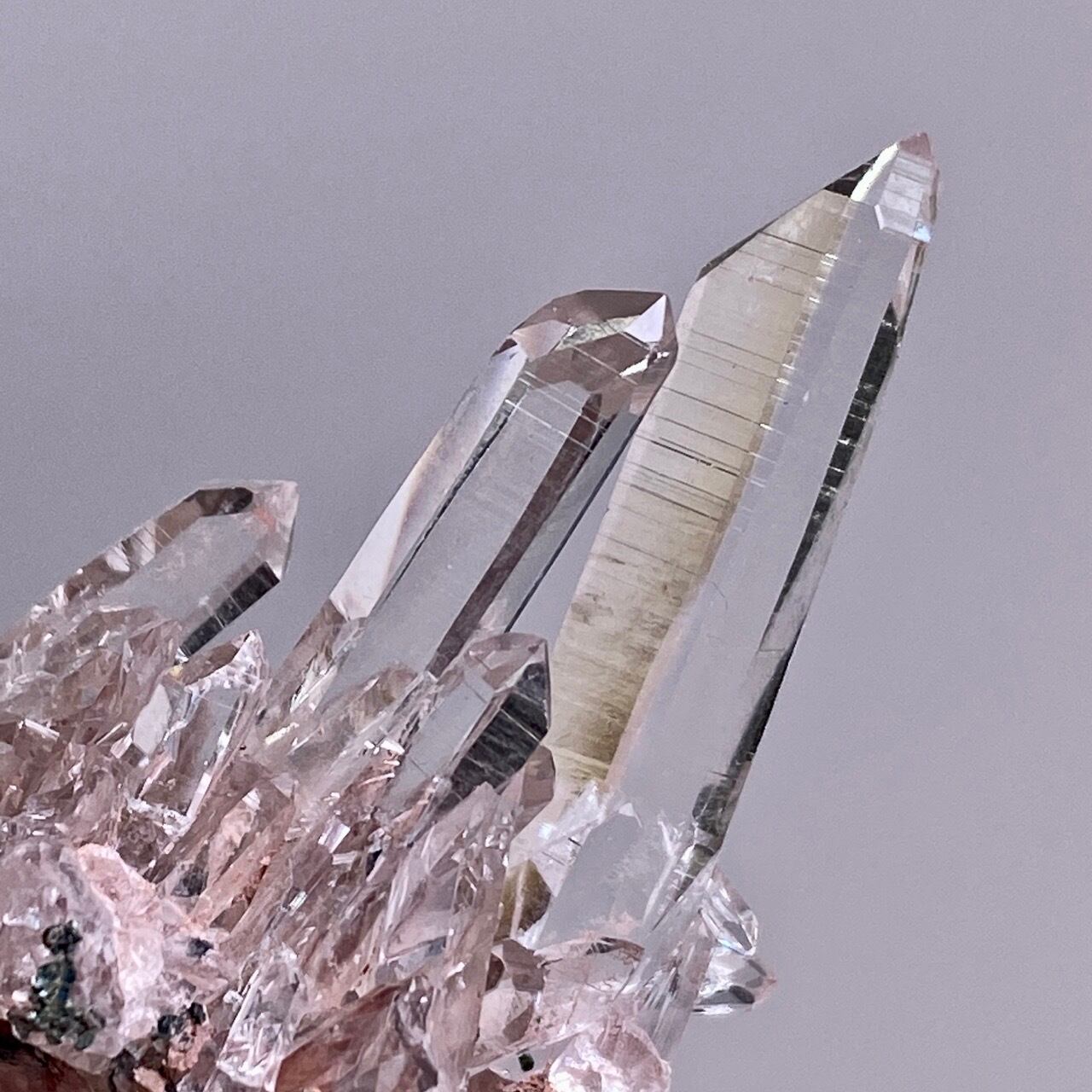 2番目の子:流石コロンビア産と納得の、高透明度のポイントが2本そびえ立ち、レムリアンリッジも見られます。その根本の小さいポイント達も美しいですし、こちらも自立します。ベース部分にクリノクロア(クローライト)も共生しています。