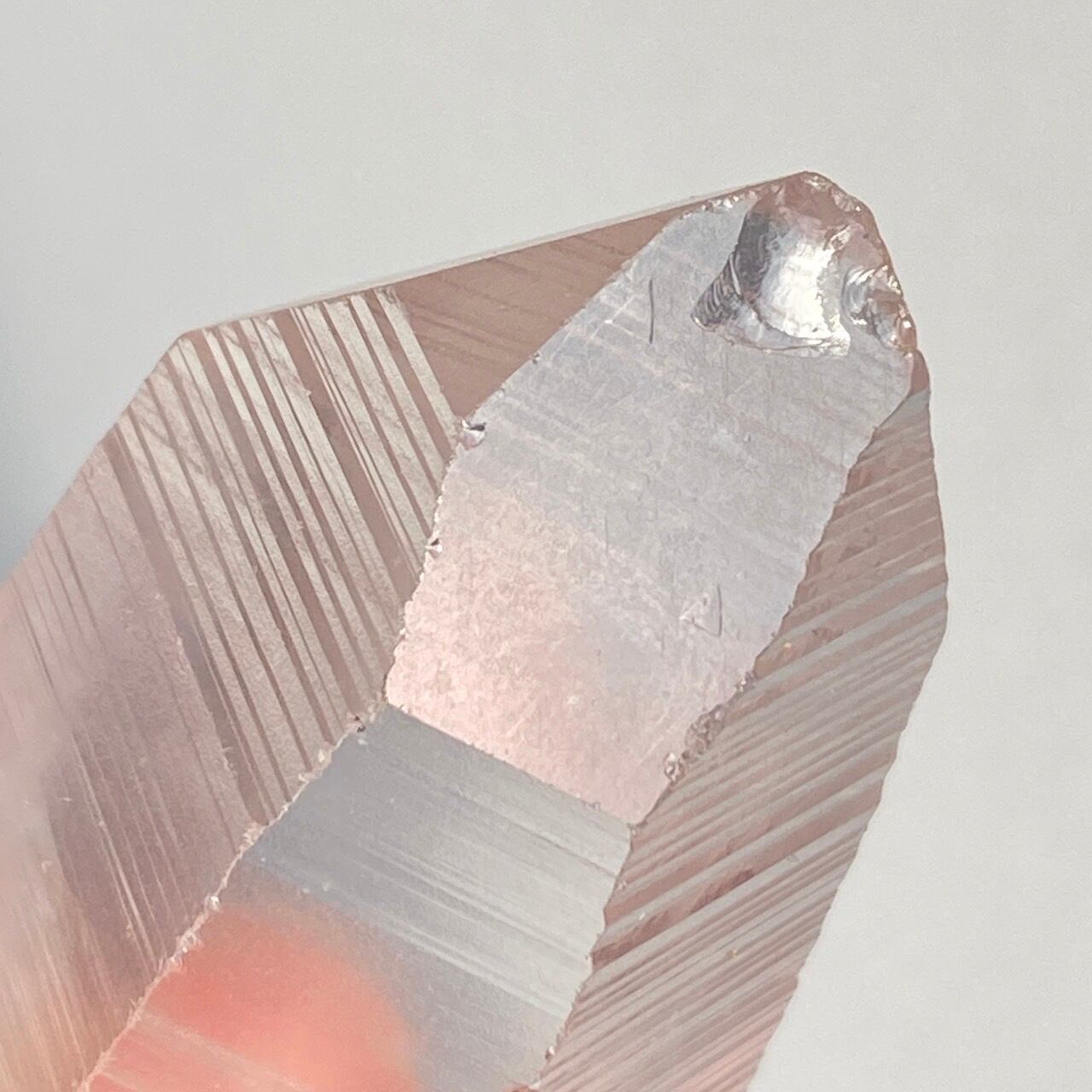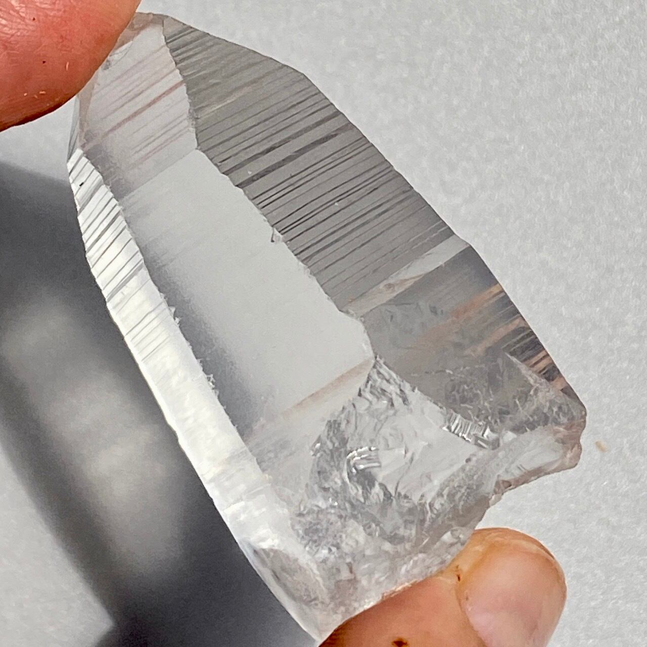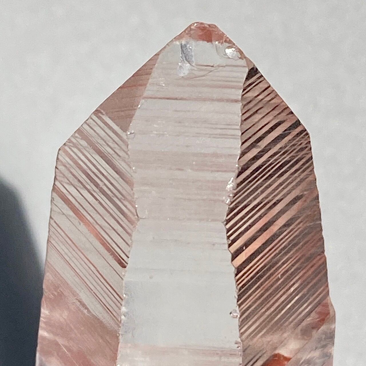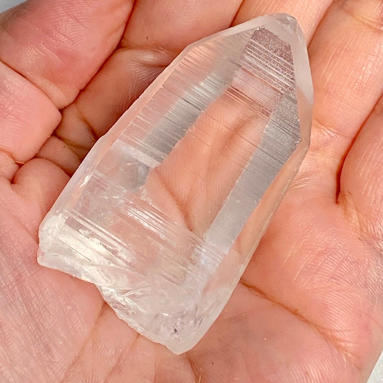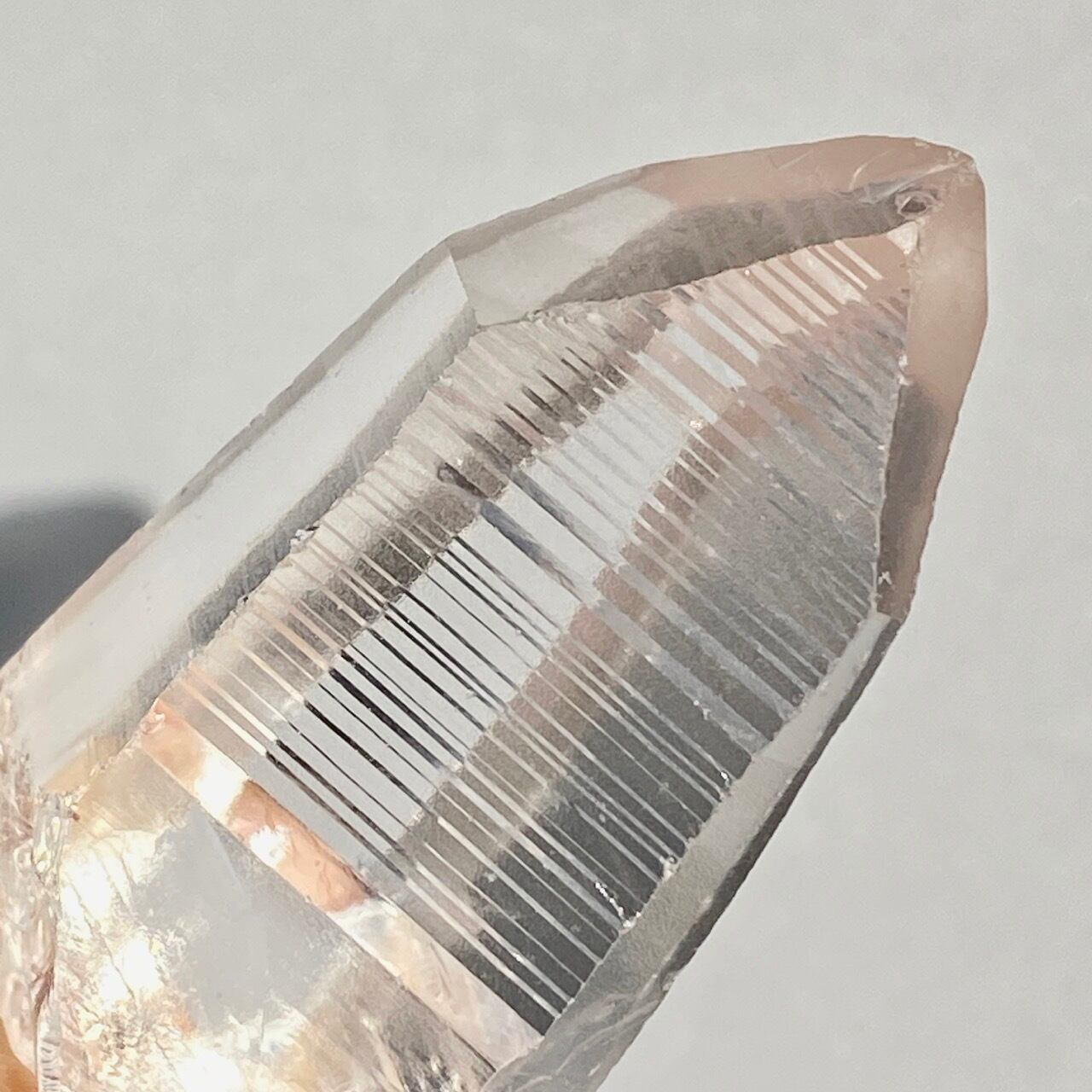 高透明度の子で、柱面3面にはっきりとしたレムリアンリッジが見られます。柱面から中を覗き込むと、下部の方が白い光を放っている感じが美しい子です。