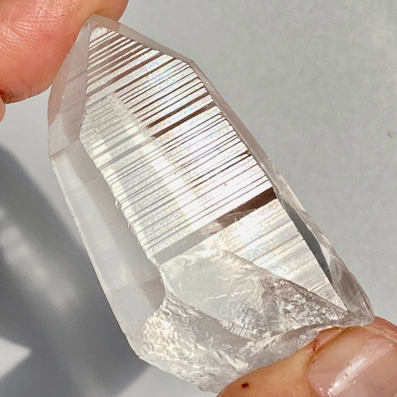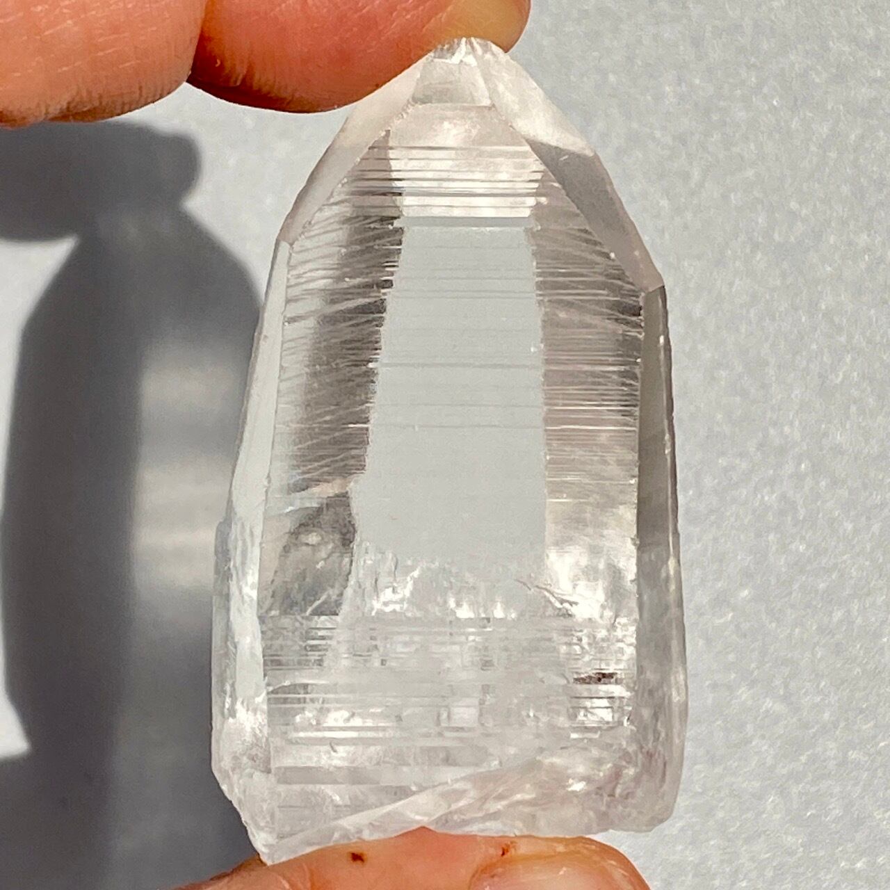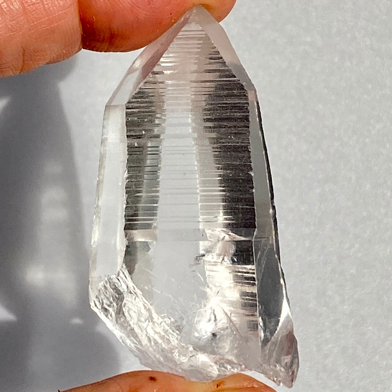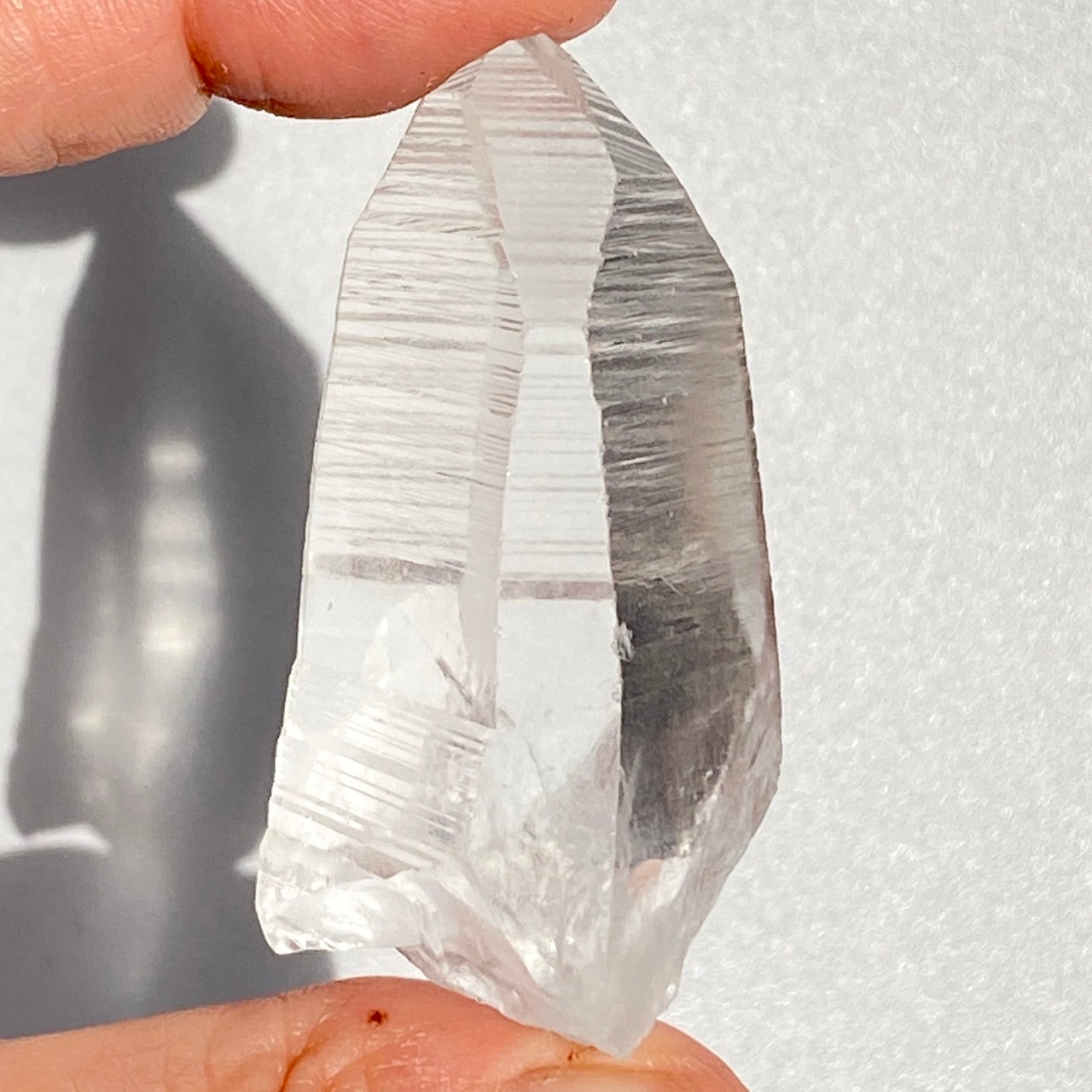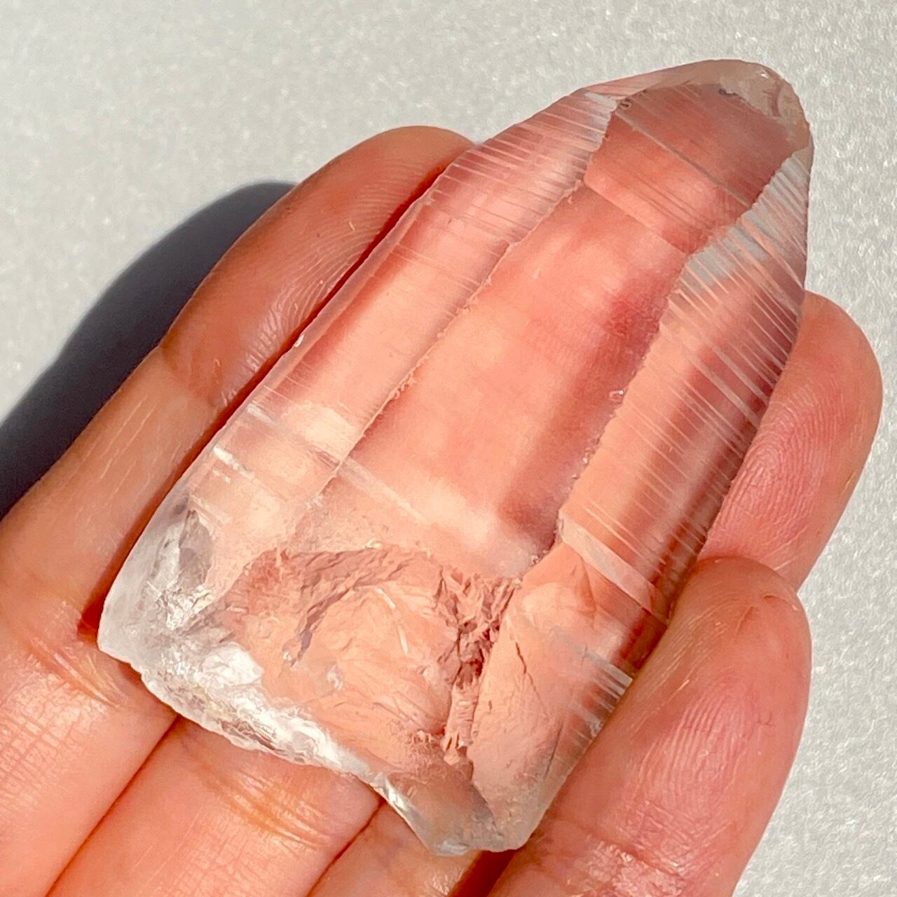 高透明度の子で、柱面3面にはっきりとしたレムリアンリッジが見られます。柱面から中を覗き込むと、下部の方が白い光を放っている感じが美しい子です。