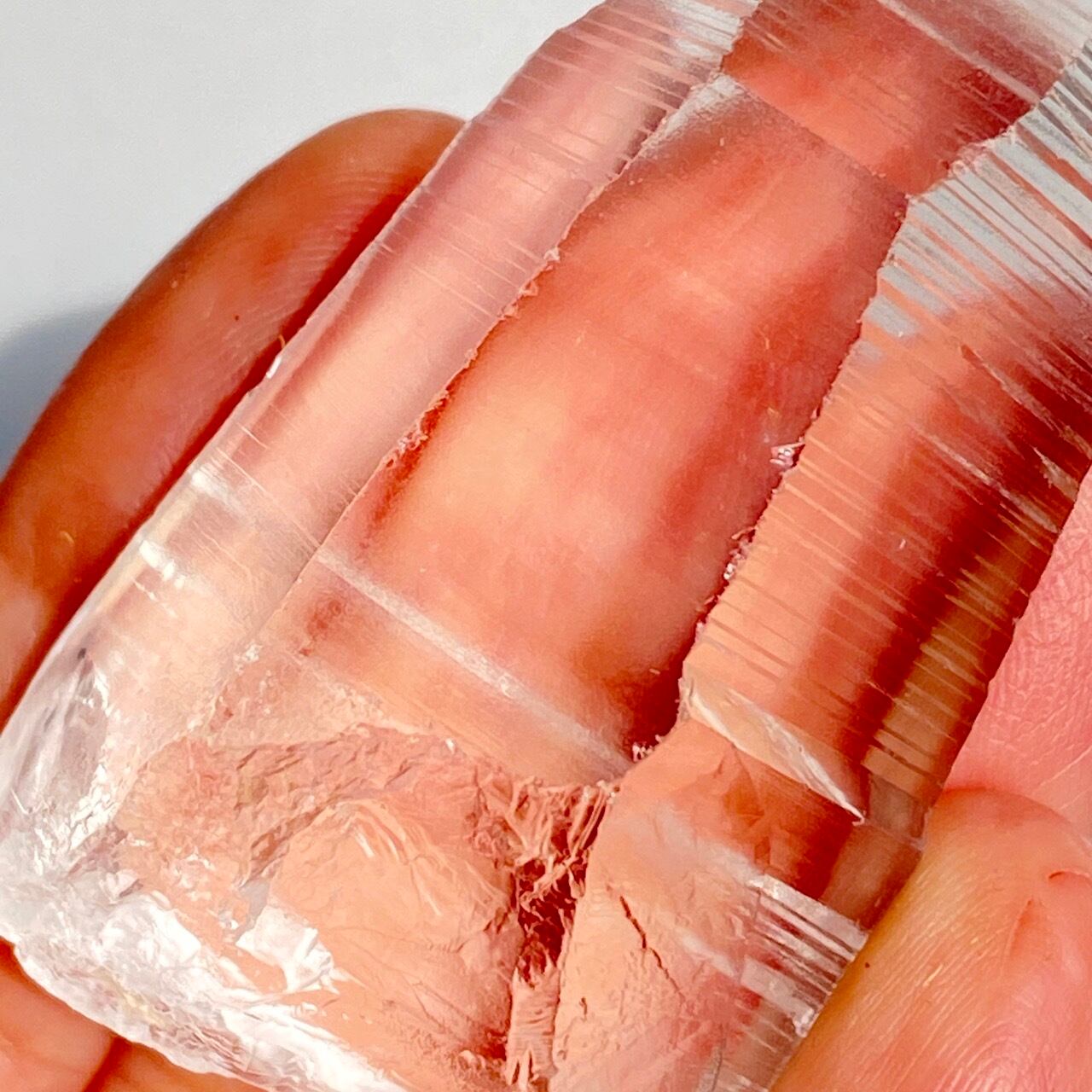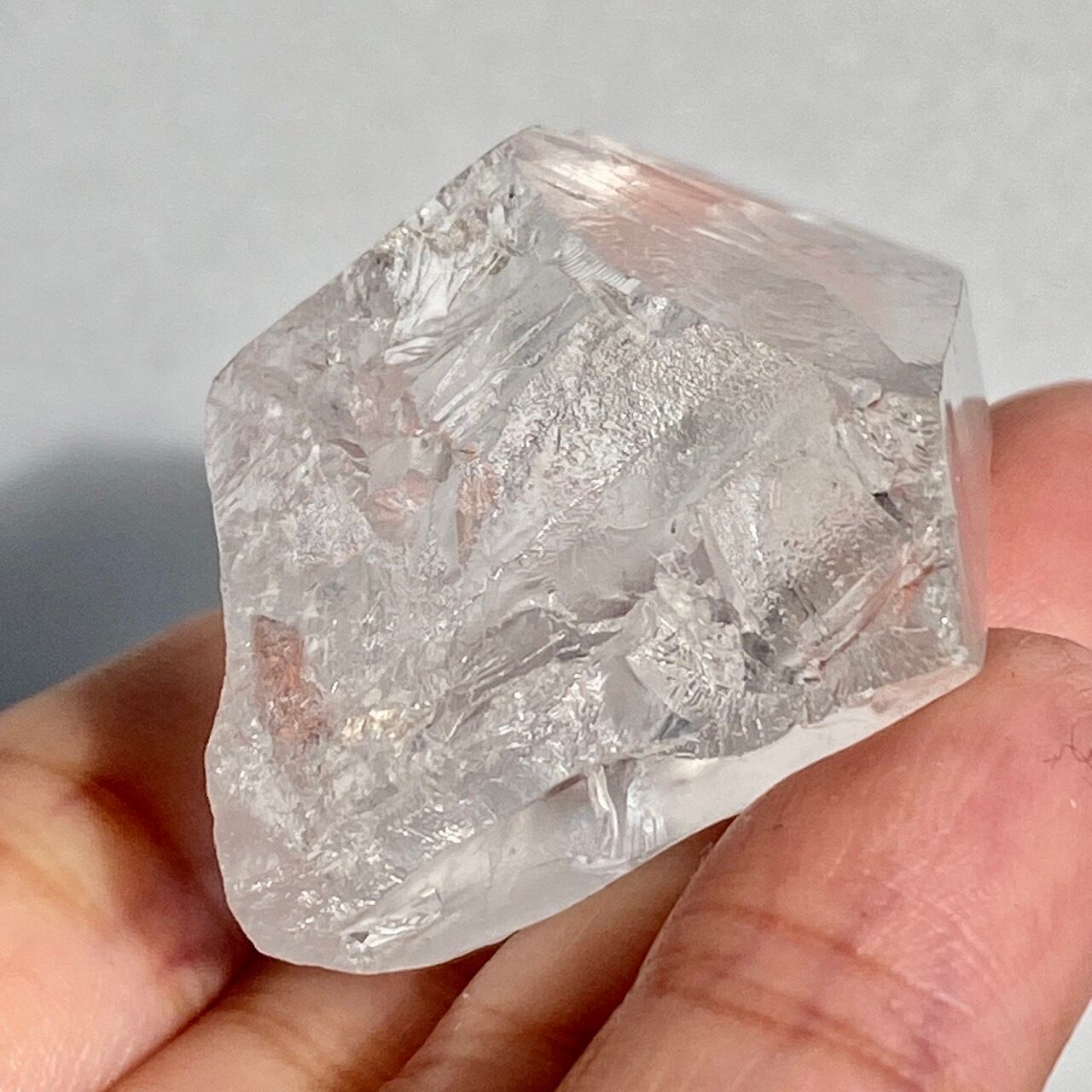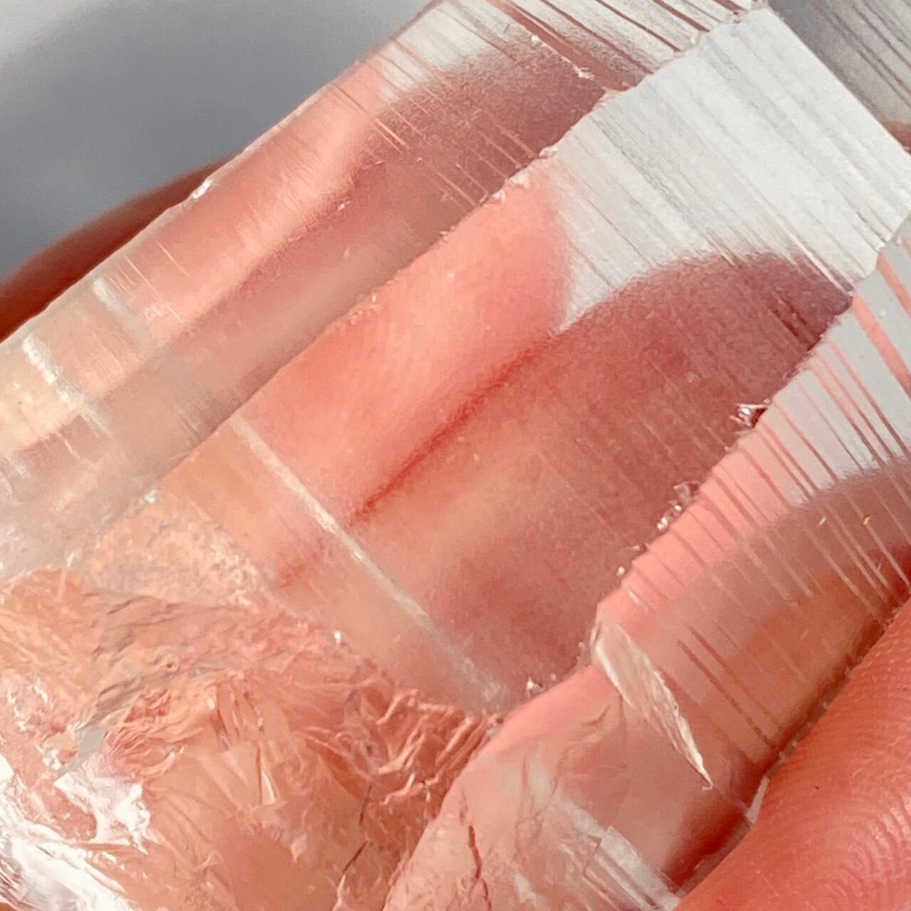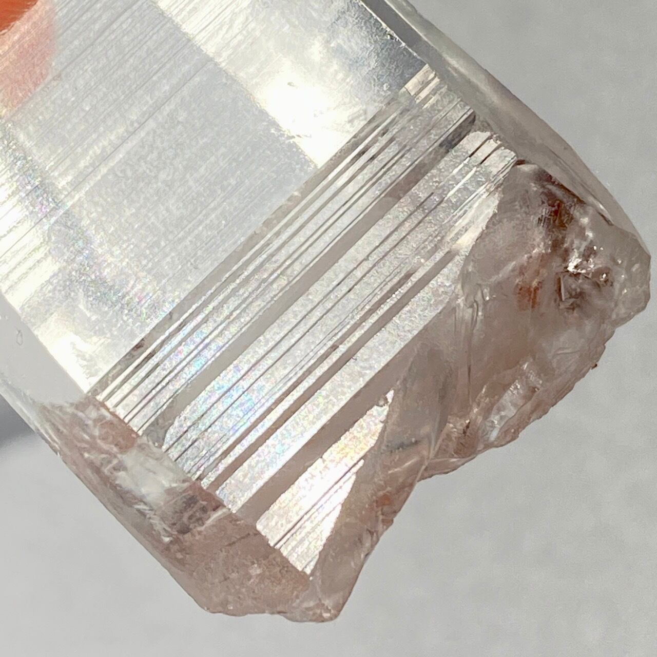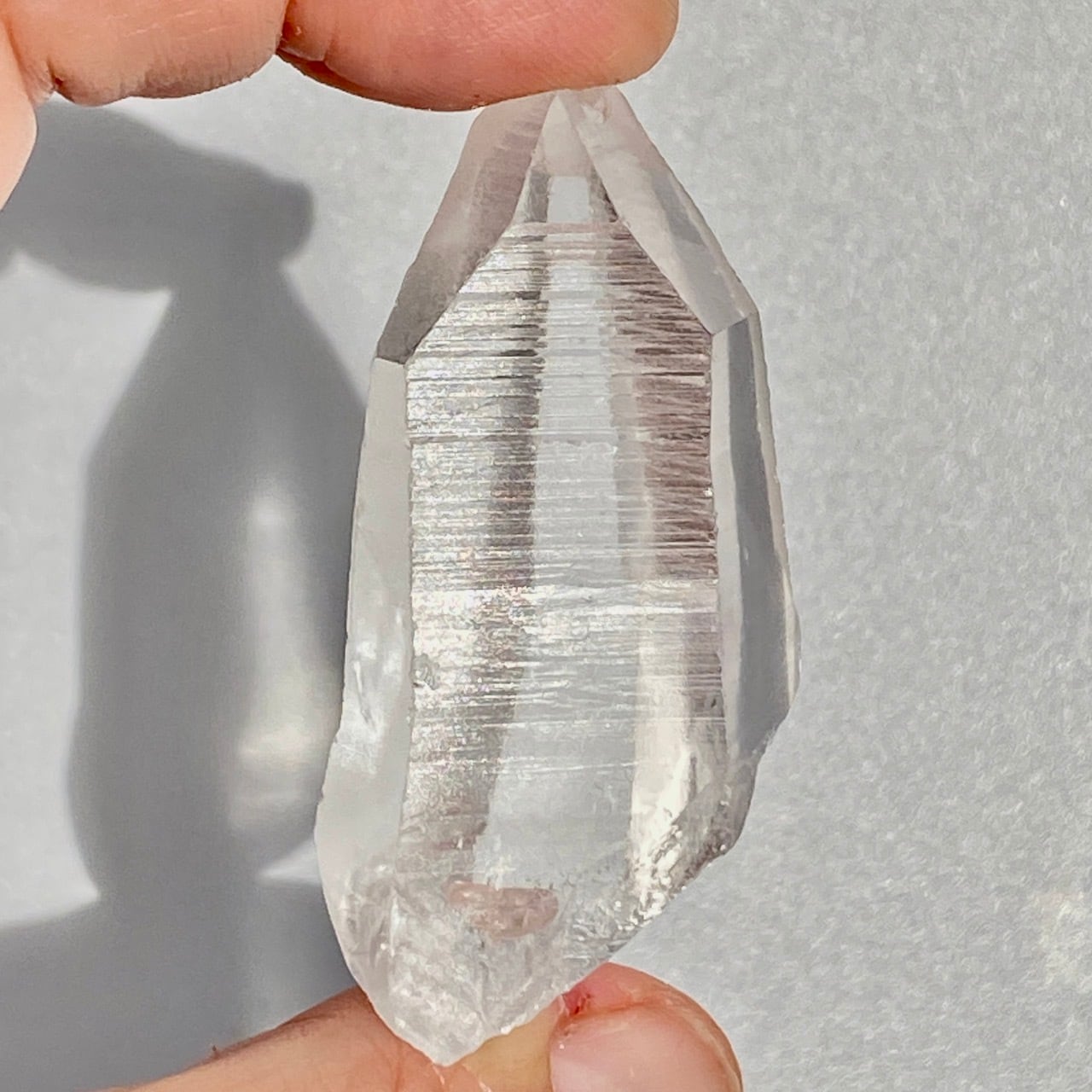 高透明度の子で、柱面3面にはっきりとしたレムリアンリッジが見られます。柱面から中を覗き込むと、下部の方が白い光を放っている感じが美しい子です。