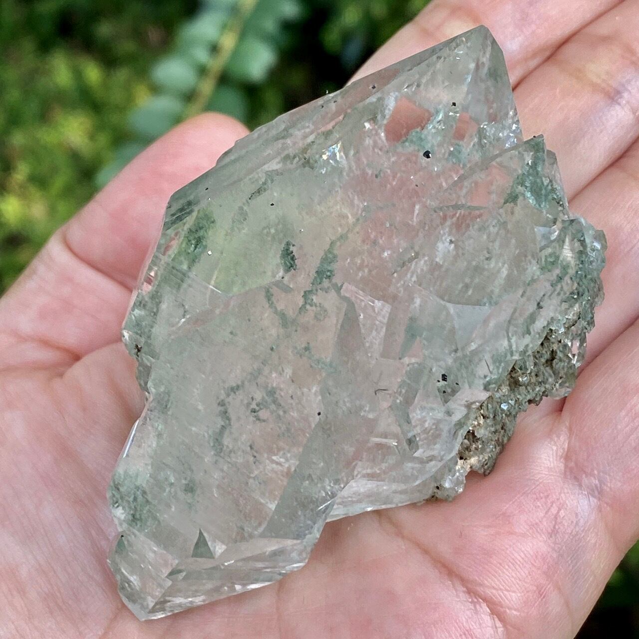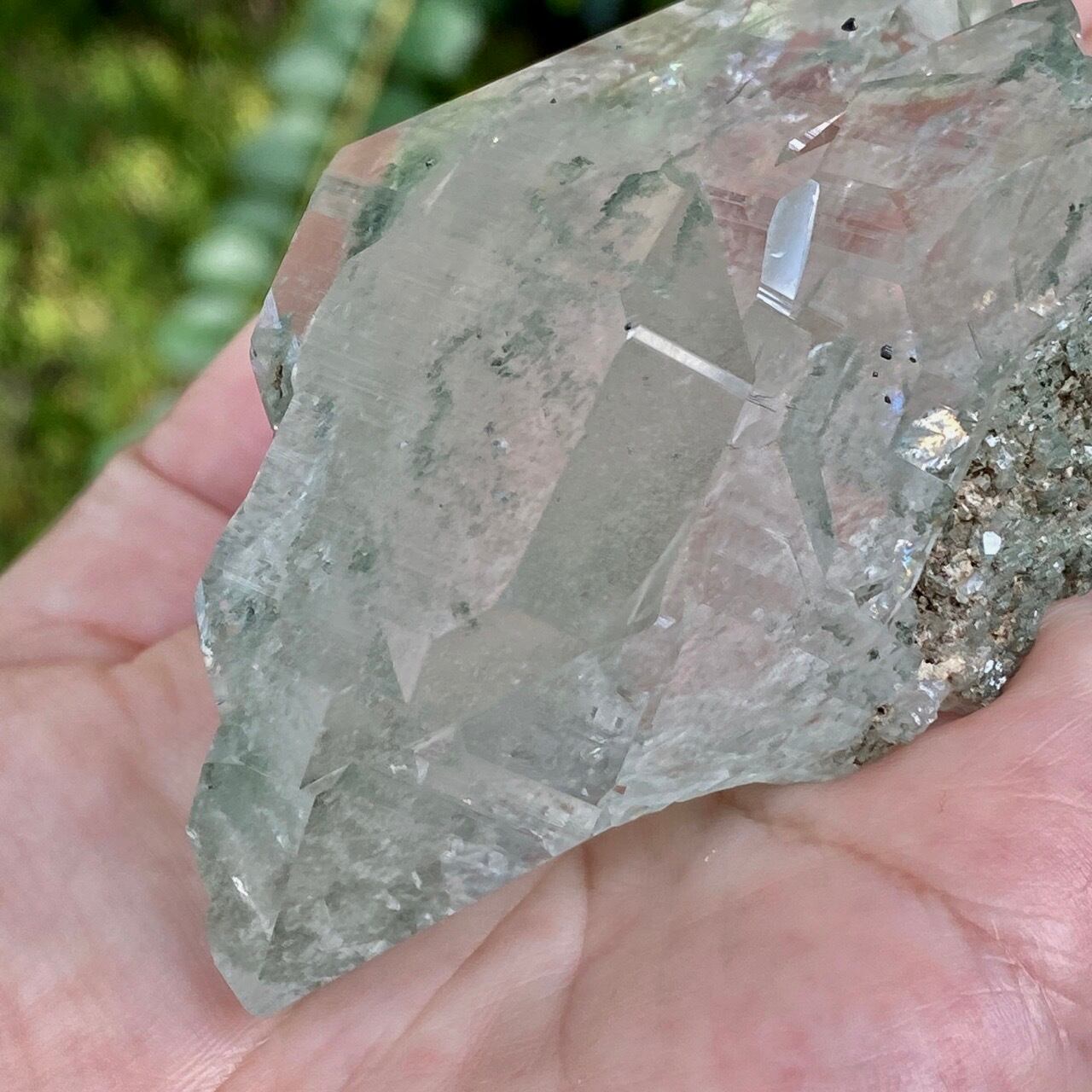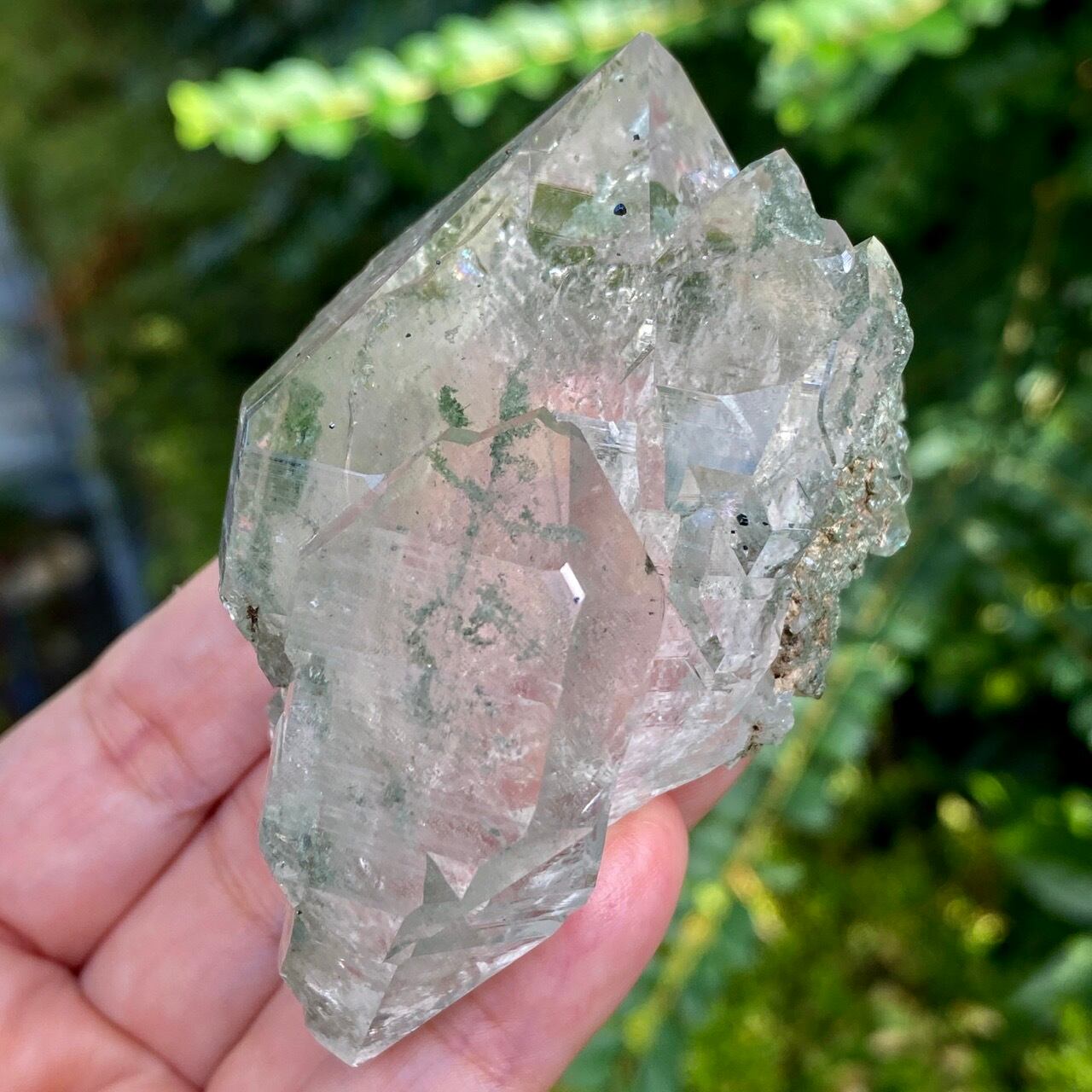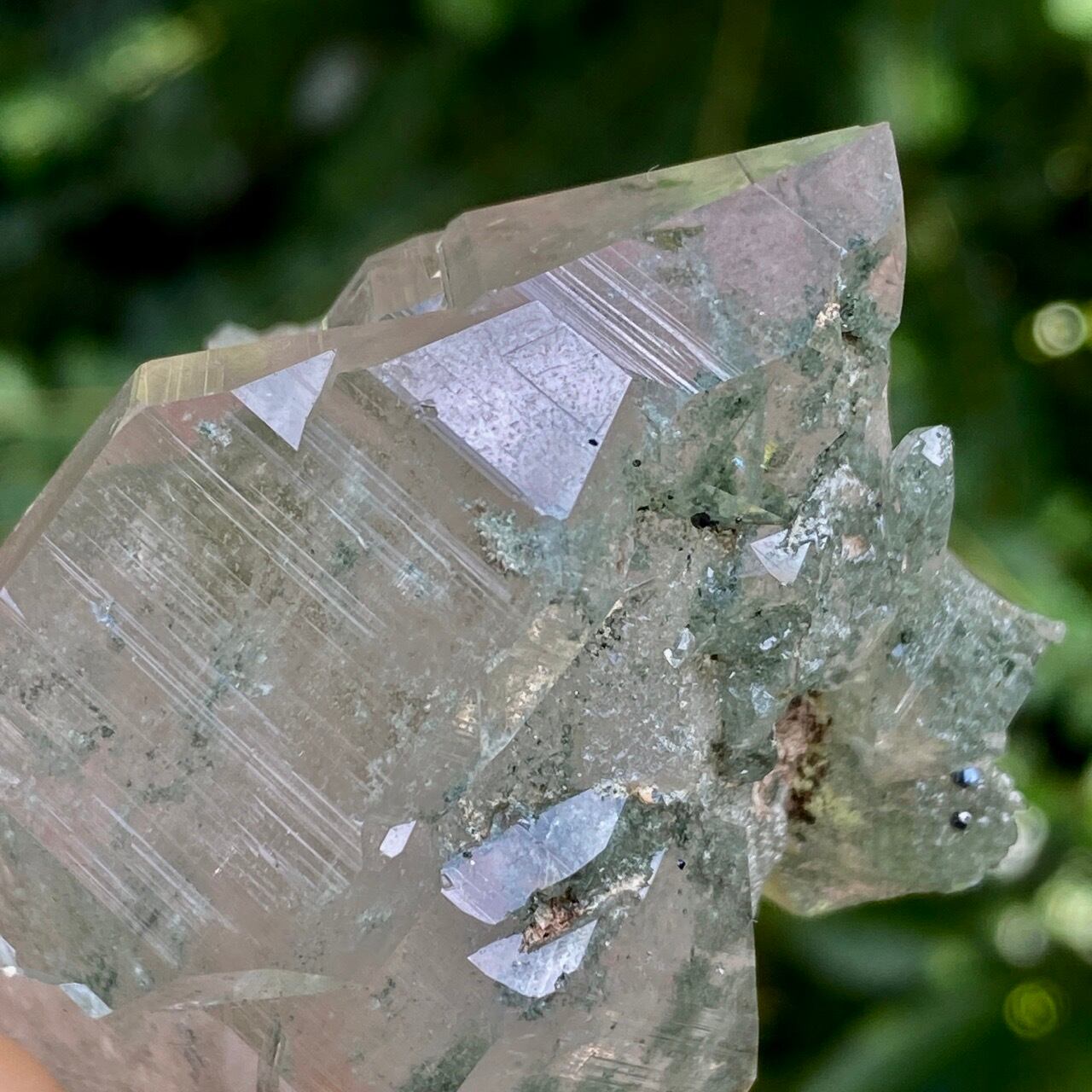画像によっては、全体的に緑ぽかったり不透明に写っているものがございますが、実際は、いわゆるクリアな水晶越しにところどころ緑色のクローライトのインクルージョンが見えたり、水晶表面にもクローライトが付着している感じです。裏面は剥離痕(最終画像)のためその部分は透過性がありませんが、前面のファセットや側柱(一部除く)から中を覗く事ができるような透け感があります。