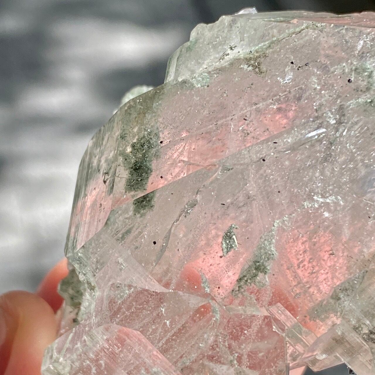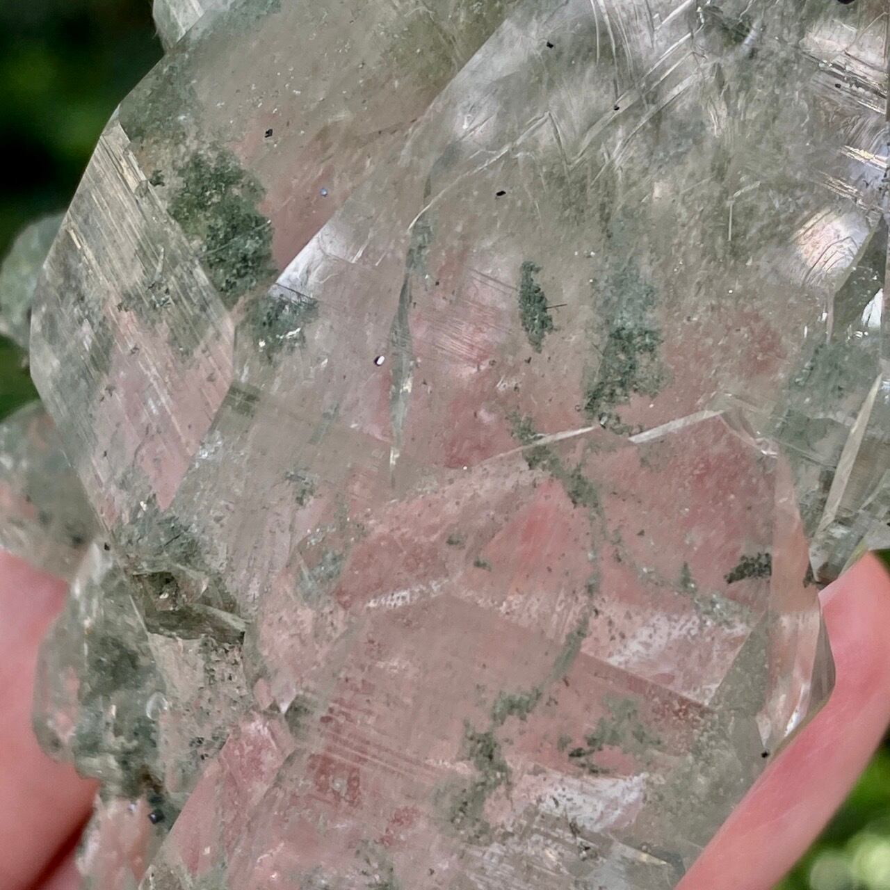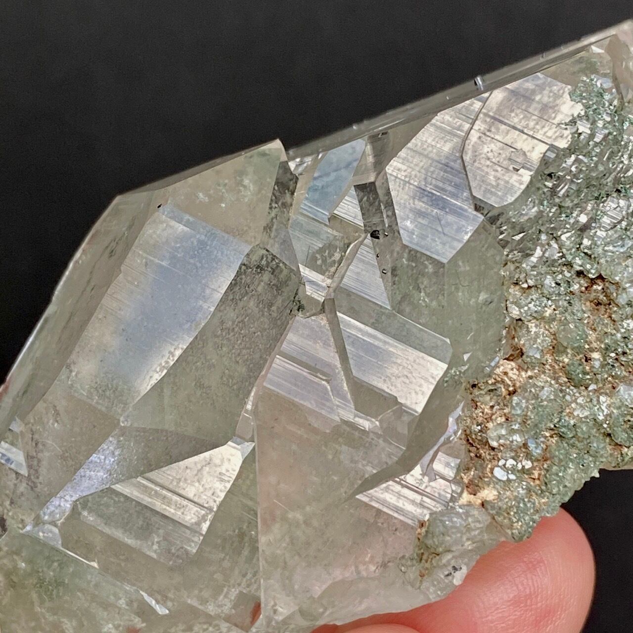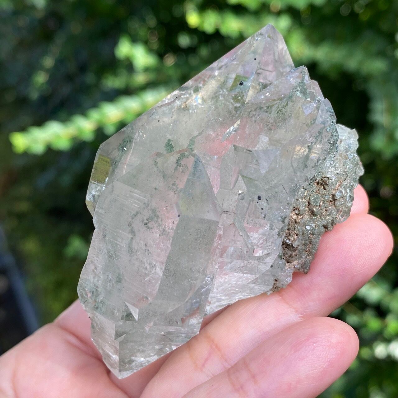 画像によっては、全体的に緑ぽかったり不透明に写っているものがございますが、実際は、いわゆるクリアな水晶越しにところどころ緑色のクローライトのインクルージョンが見えたり、水晶表面にもクローライトが付着している感じです。裏面は剥離痕(最終画像)のためその部分は透過性がありませんが、前面のファセットや側柱(一部除く)から中を覗く事ができるような透け感があります。