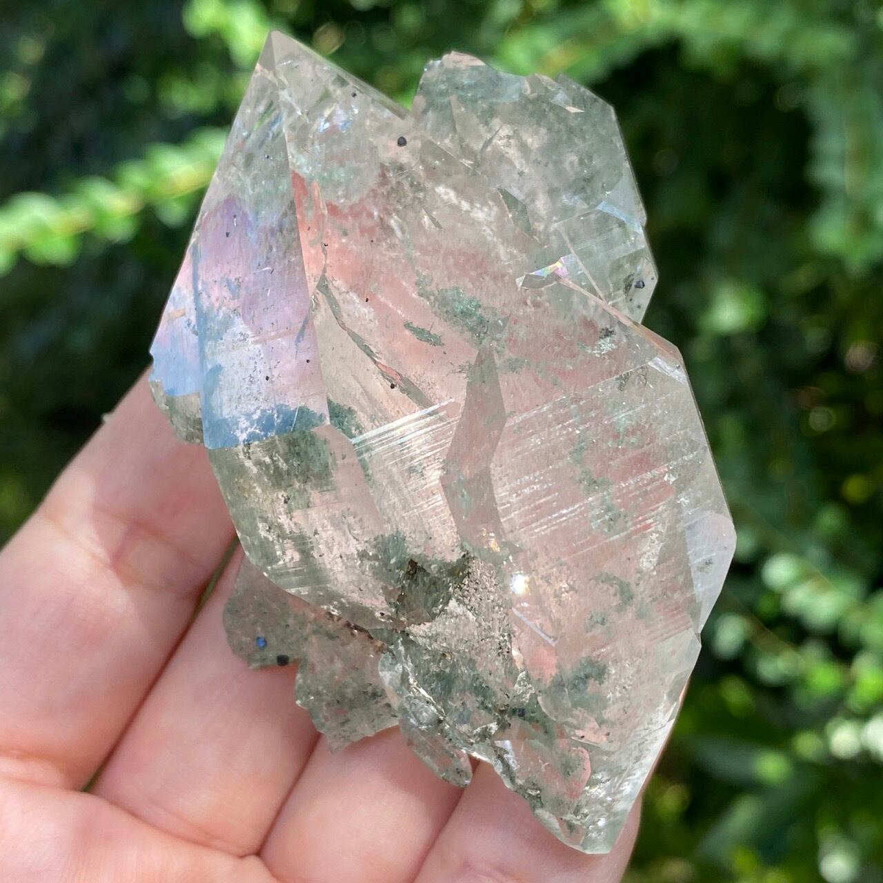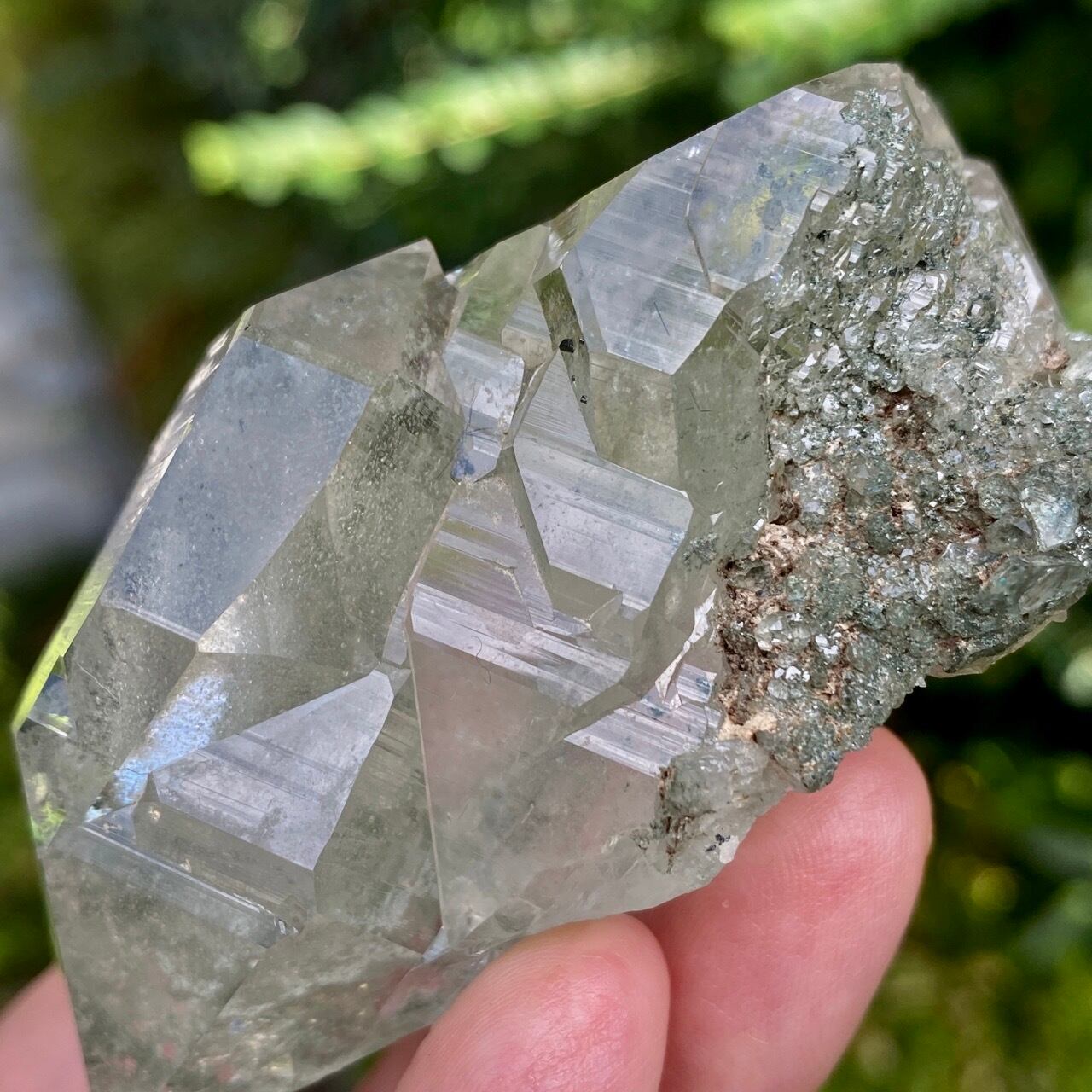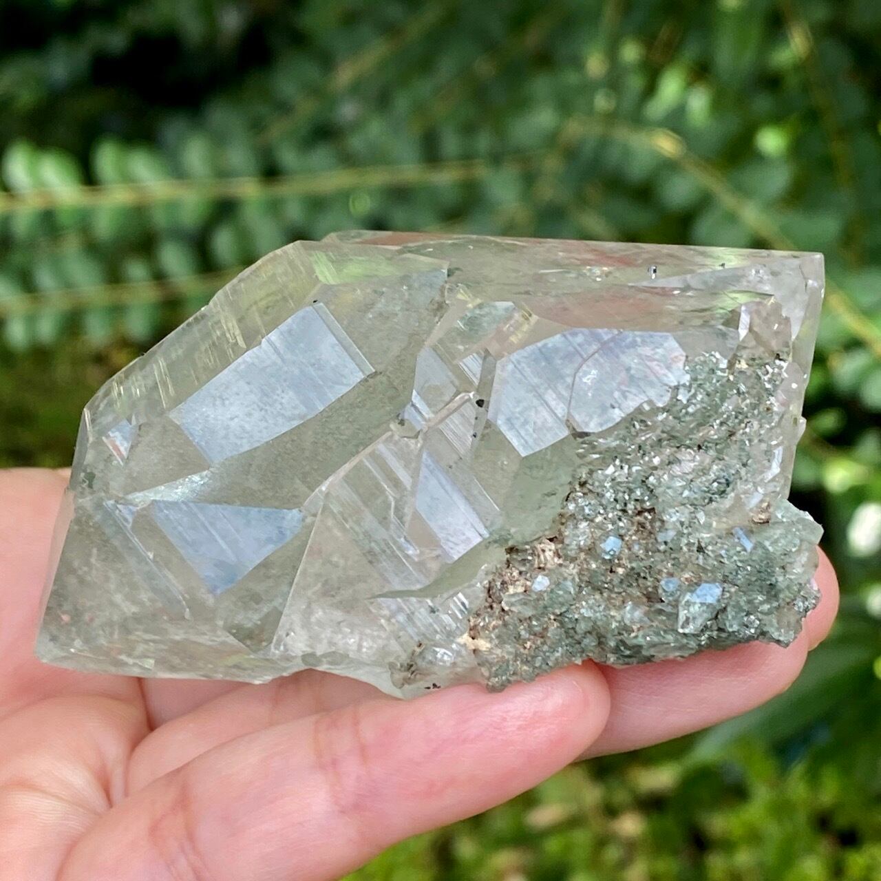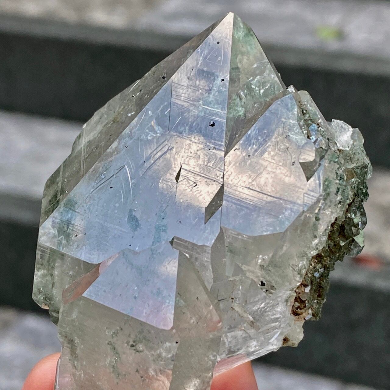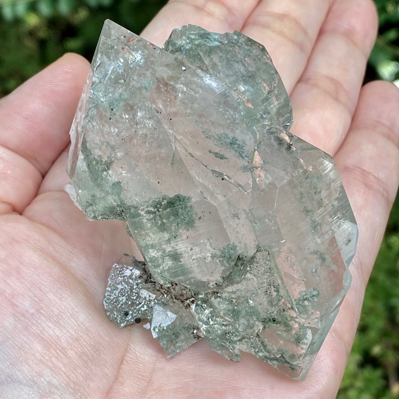 画像によっては、全体的に緑ぽかったり不透明に写っているものがございますが、実際は、いわゆるクリアな水晶越しにところどころ緑色のクローライトのインクルージョンが見えたり、水晶表面にもクローライトが付着している感じです。裏面は剥離痕(最終画像)のためその部分は透過性がありませんが、前面のファセットや側柱(一部除く)から中を覗く事ができるような透け感があります。