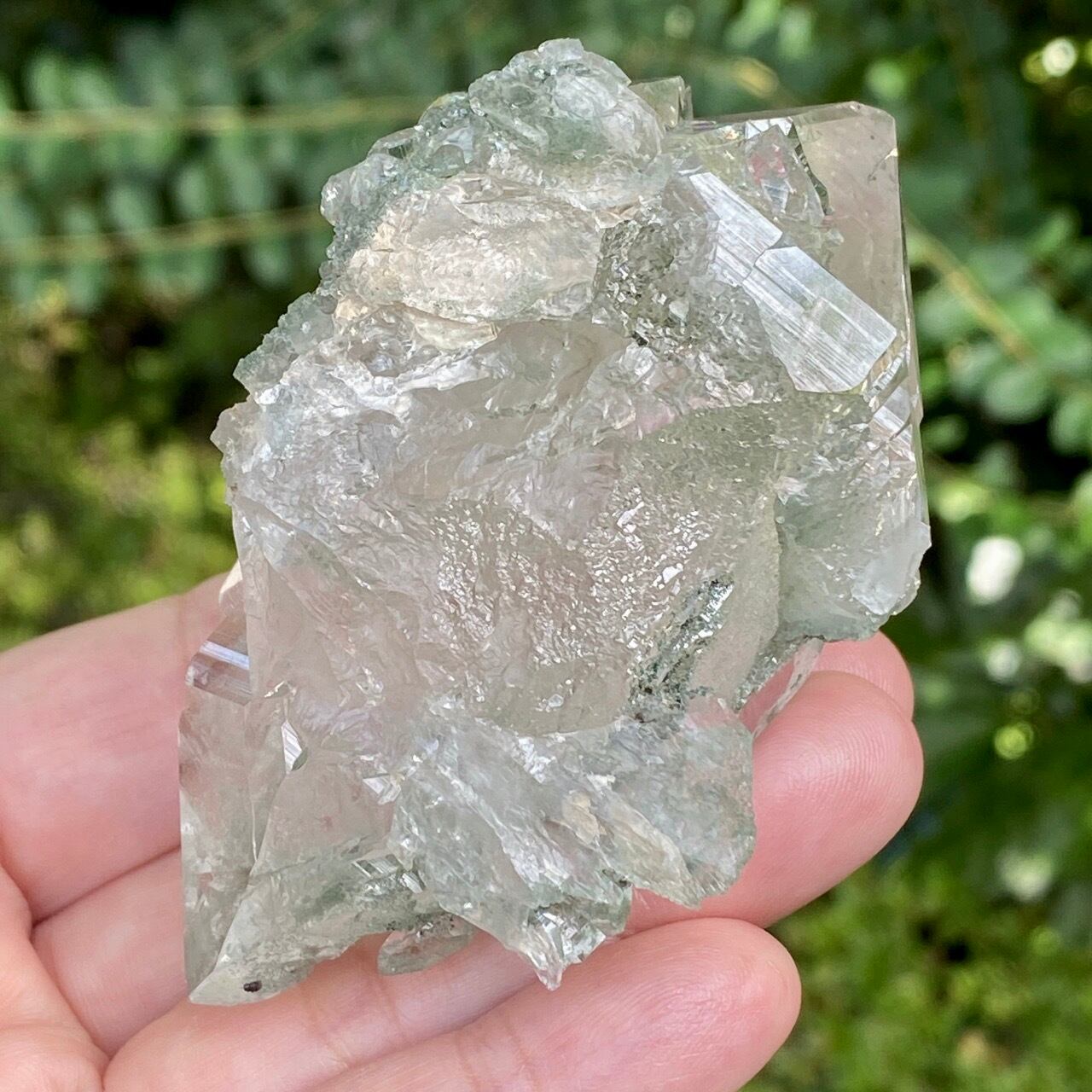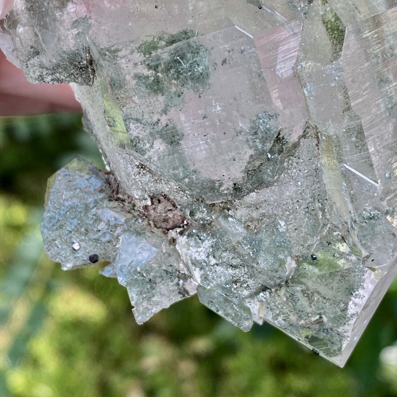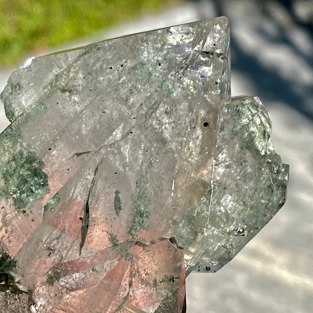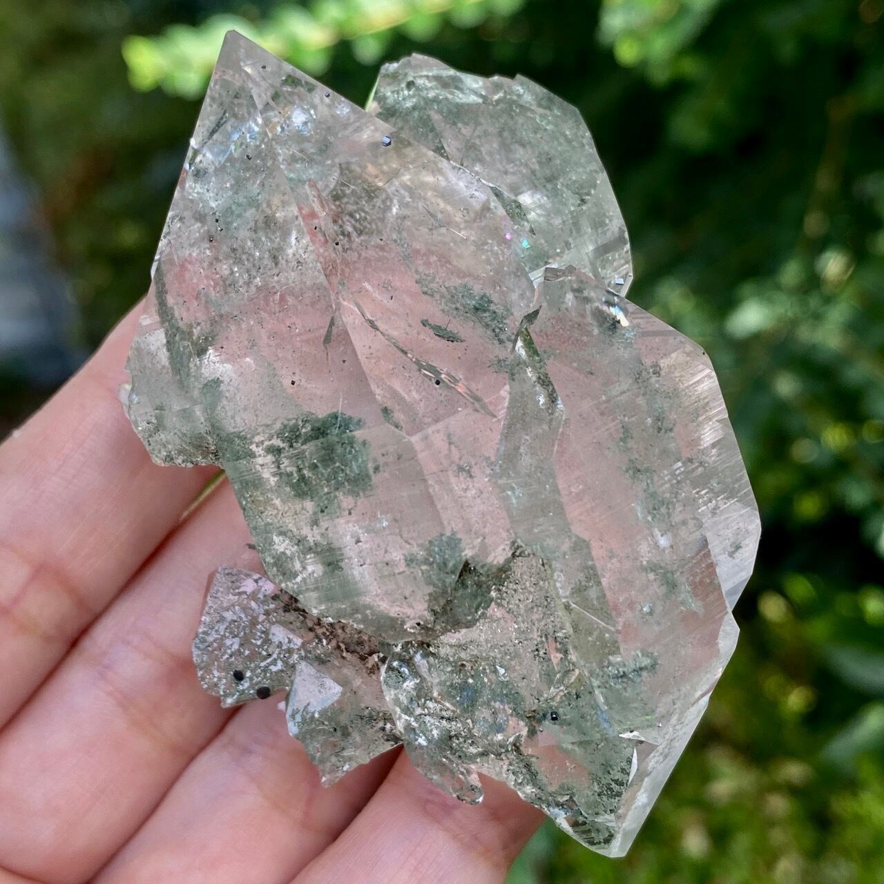 画像によっては、全体的に緑ぽかったり不透明に写っているものがございますが、実際は、いわゆるクリアな水晶越しにところどころ緑色のクローライトのインクルージョンが見えたり、水晶表面にもクローライトが付着している感じです。裏面は剥離痕(最終画像)のためその部分は透過性がありませんが、前面のファセットや側柱(一部除く)から中を覗く事ができるような透け感があります。