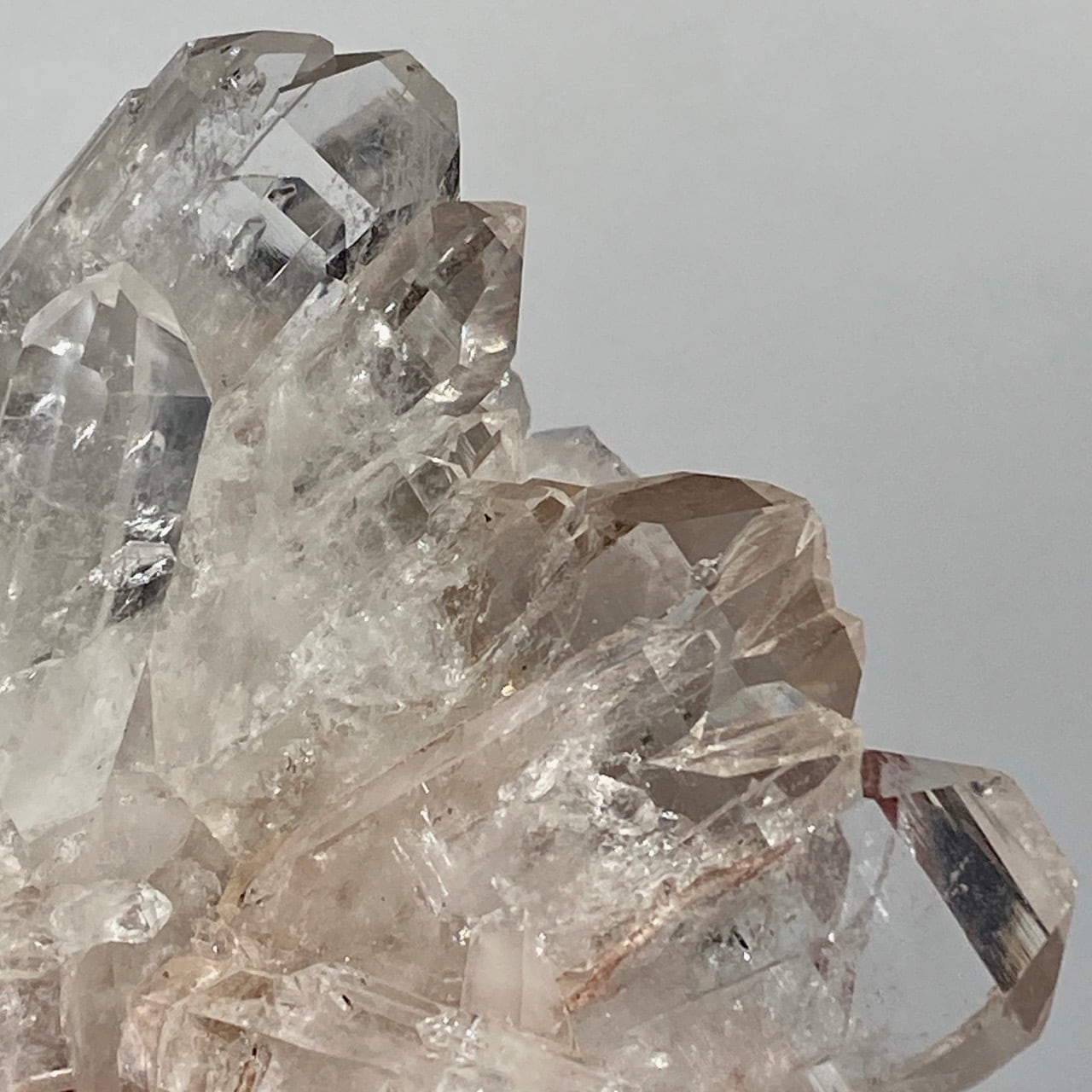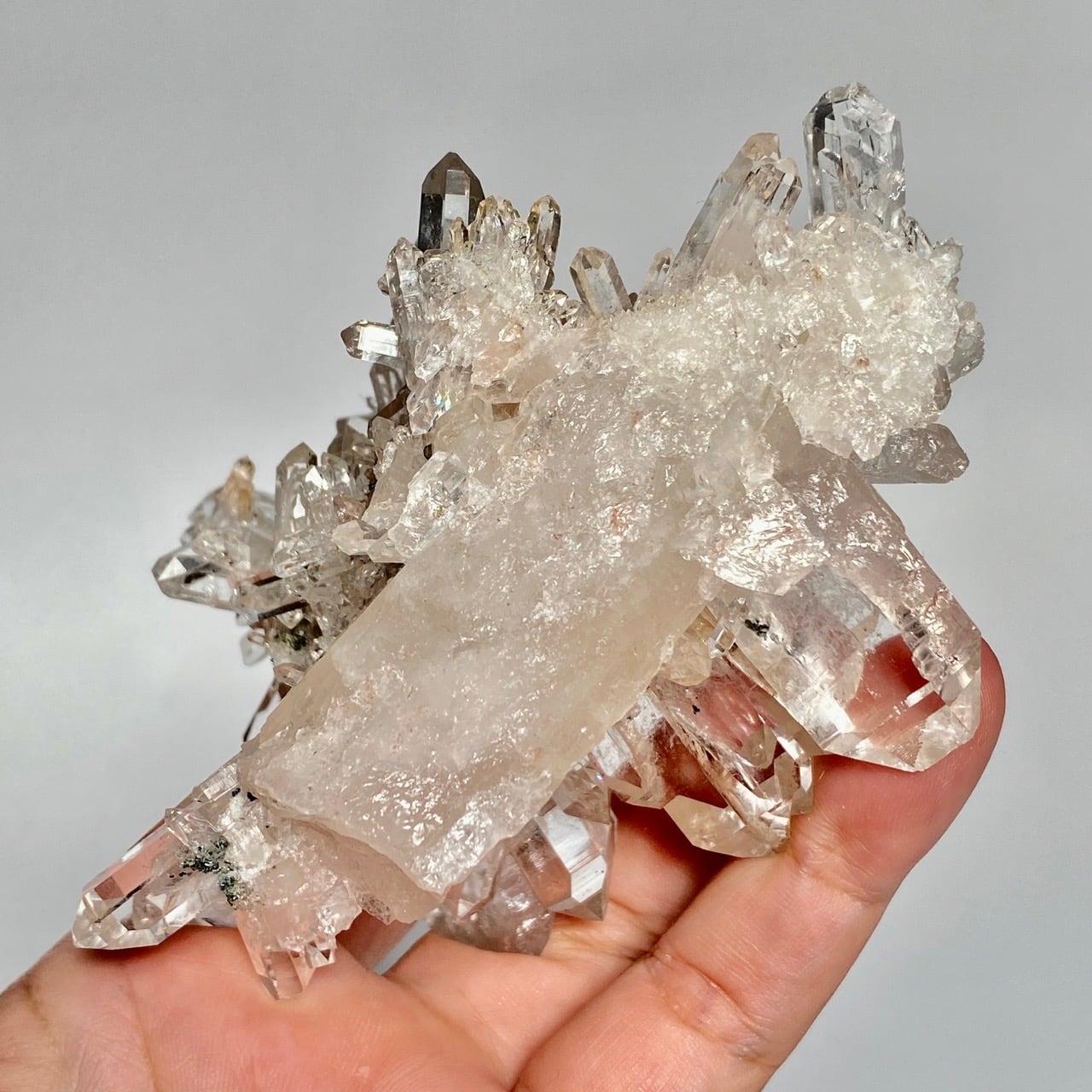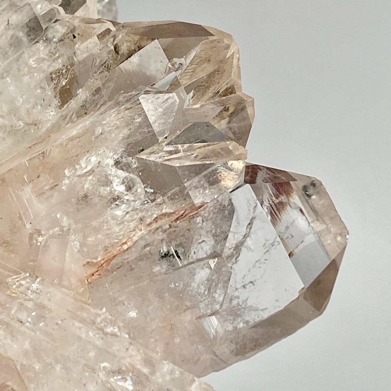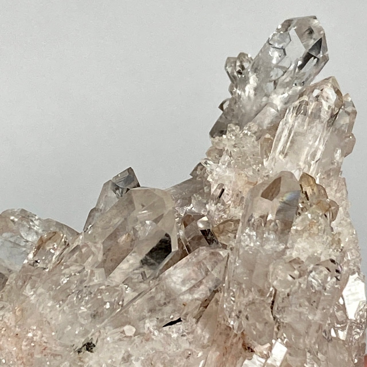 ピンクレムリアンと言っても見た目はクリアクォーツでところどころ僅かにピンクがかって見える箇所がある程度ですが、このサイズおよび重量でこの異次元の美しいフォーメーションは稀だと思いますので店主オススメの子です。