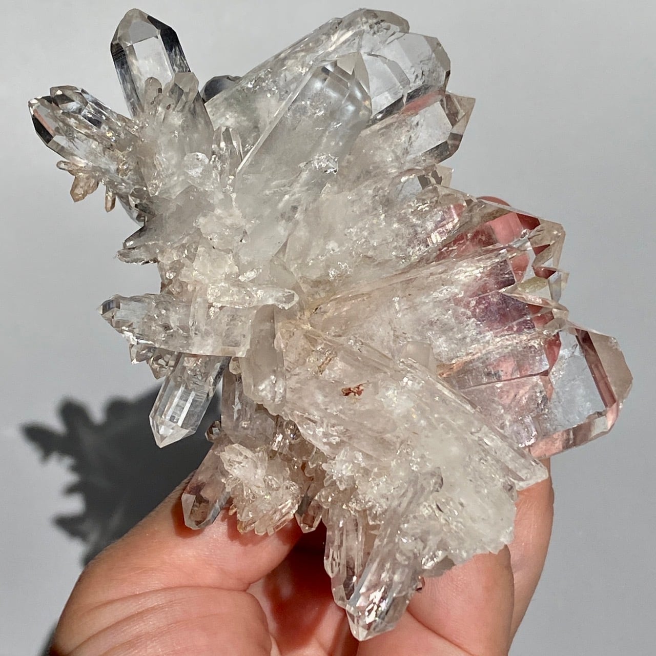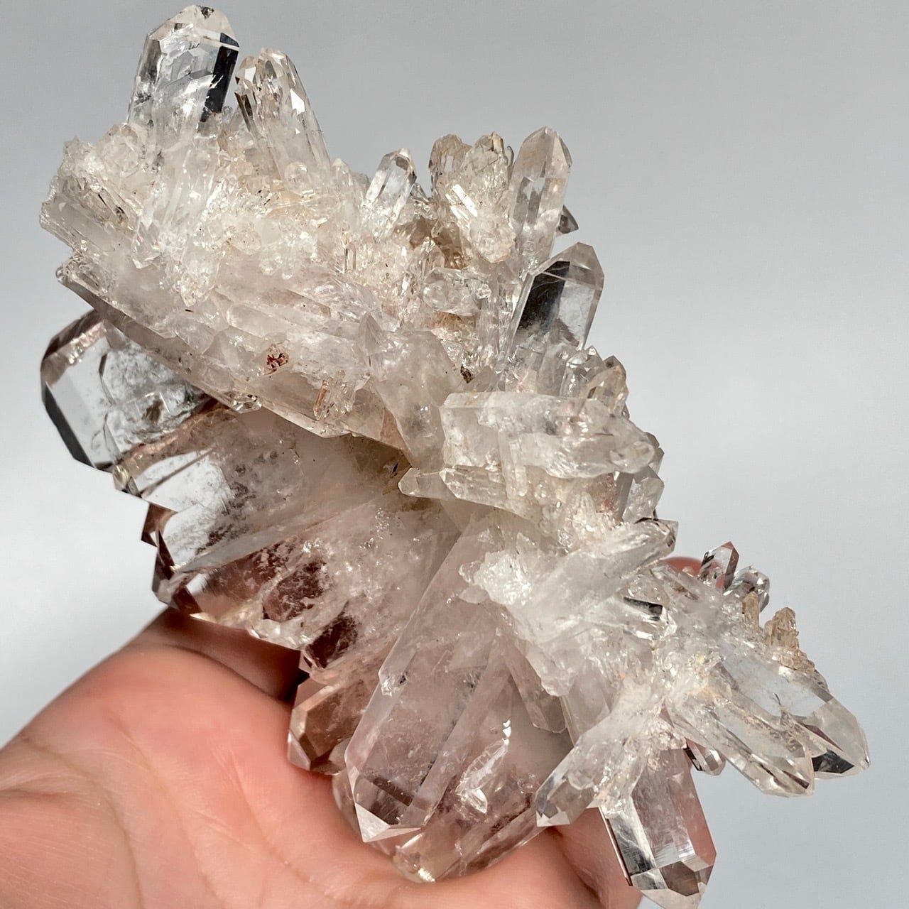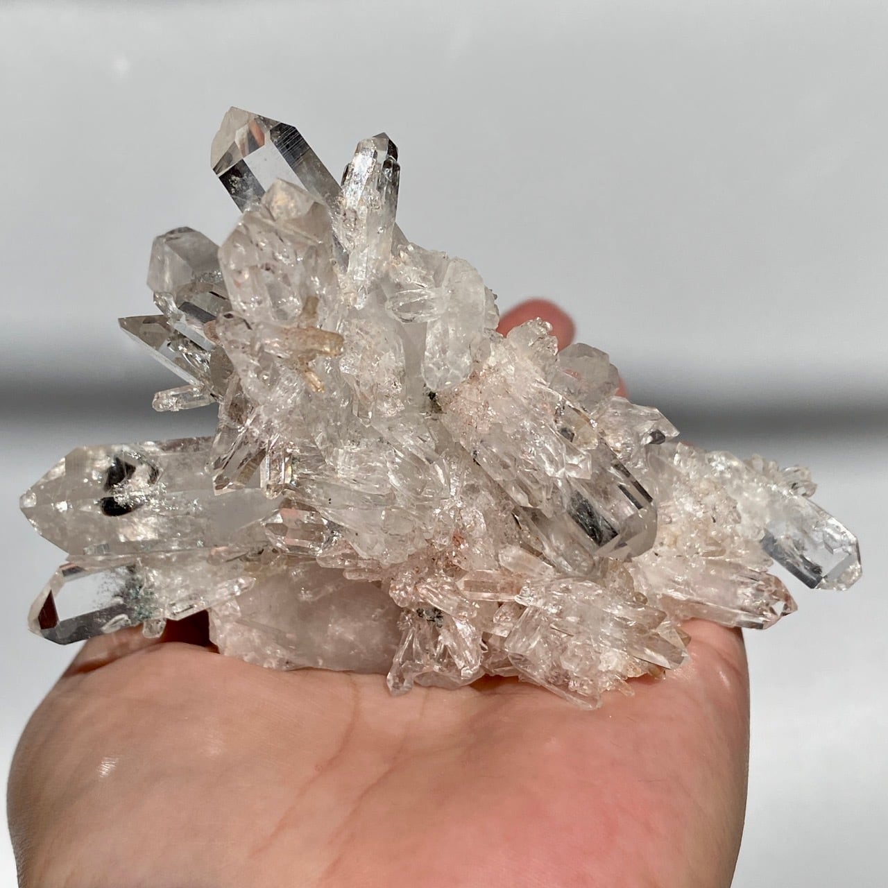 ピンクレムリアンと言っても見た目はクリアクォーツでところどころ僅かにピンクがかって見える箇所がある程度ですが、このサイズおよび重量でこの異次元の美しいフォーメーションは稀だと思いますので店主オススメの子です。
