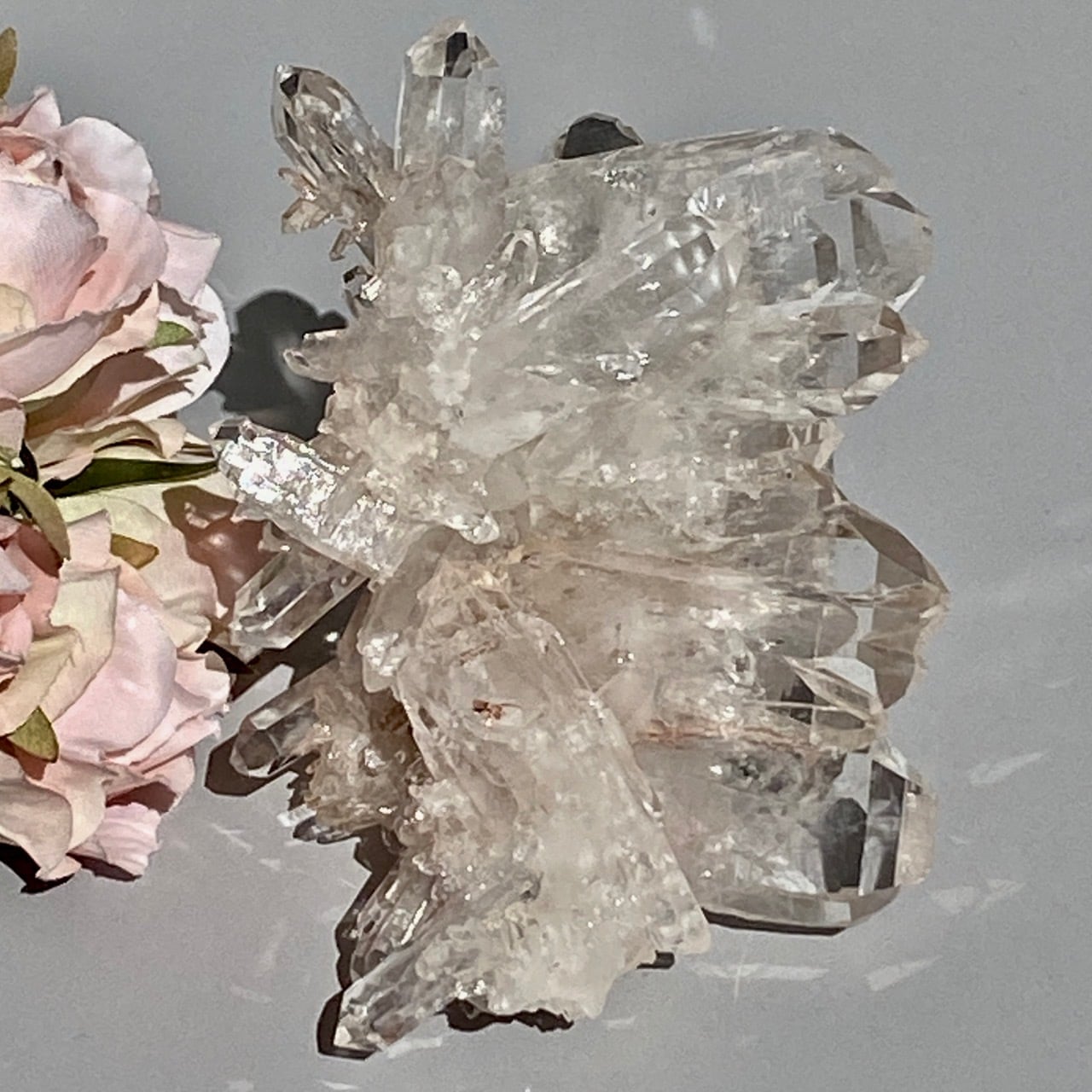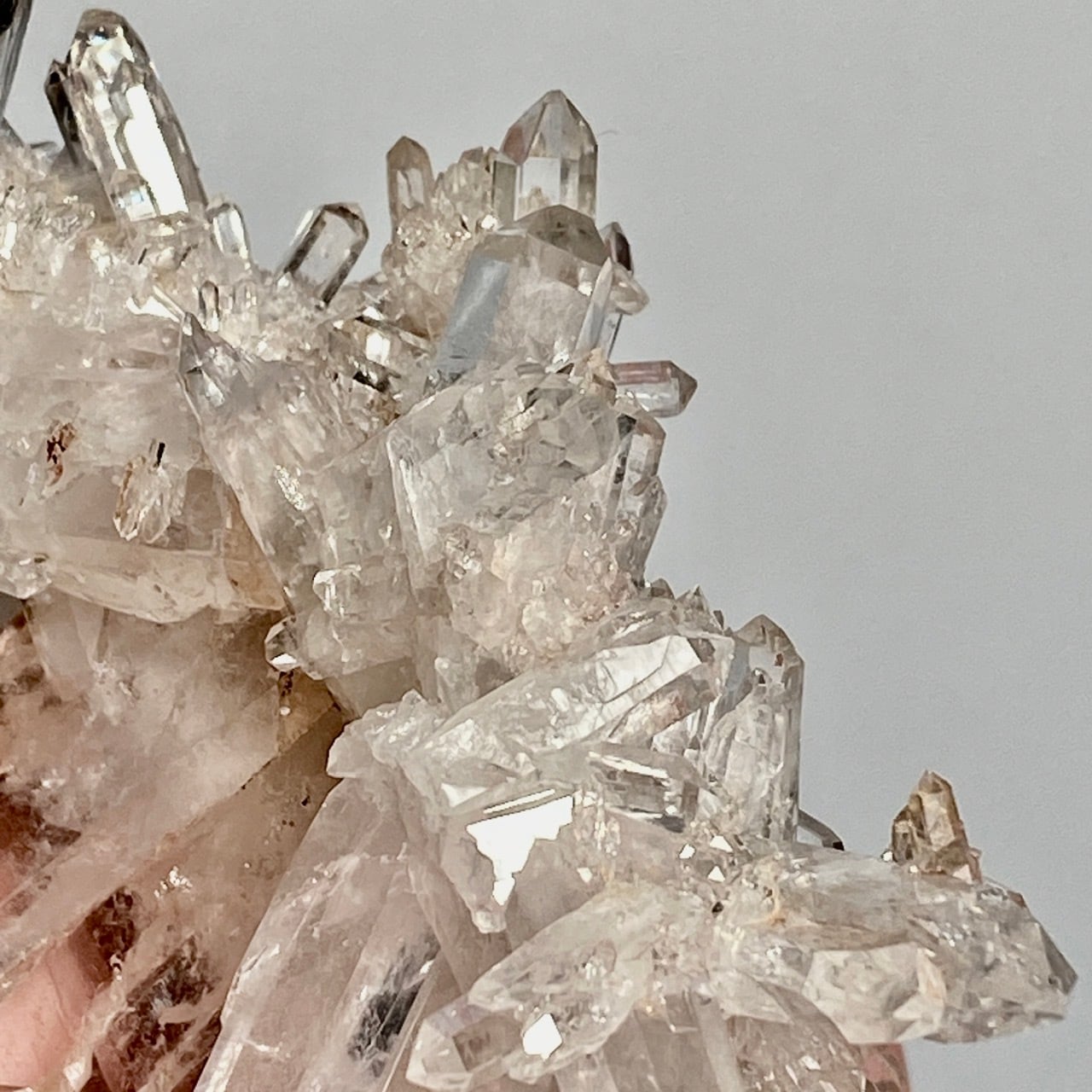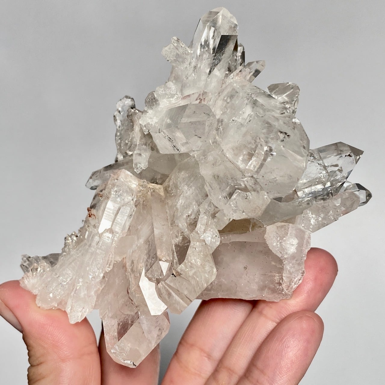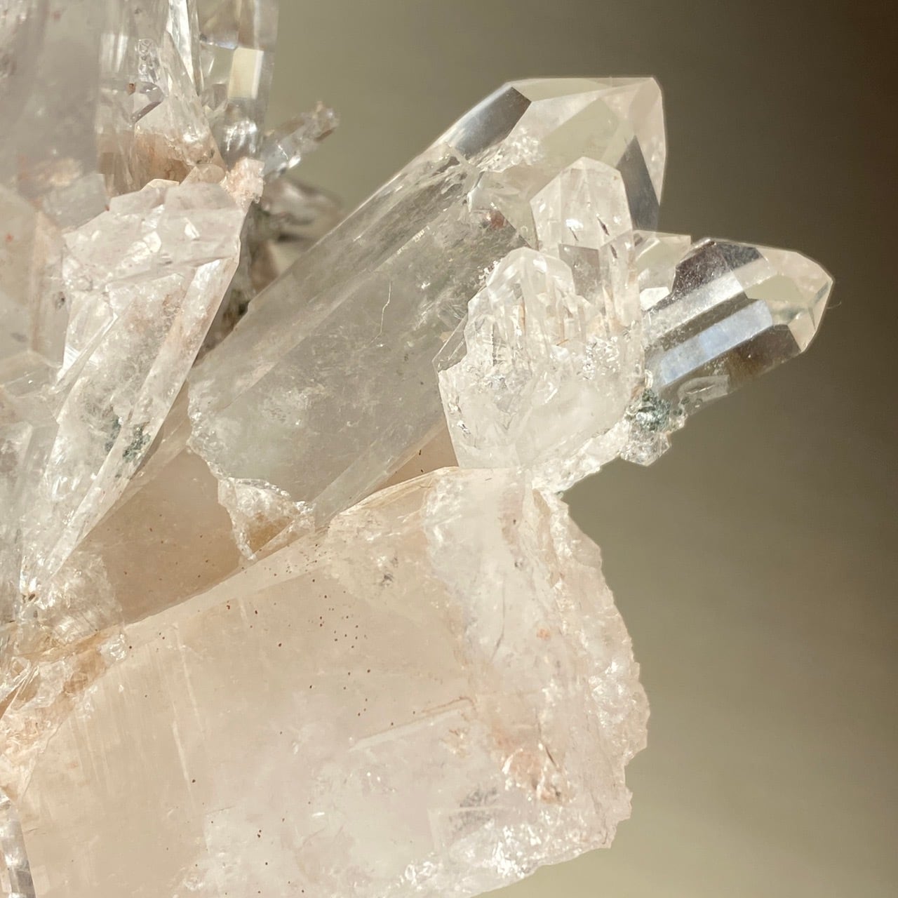 ピンクレムリアンと言っても見た目はクリアクォーツでところどころ僅かにピンクがかって見える箇所がある程度ですが、このサイズおよび重量でこの異次元の美しいフォーメーションは稀だと思いますので店主オススメの子です。