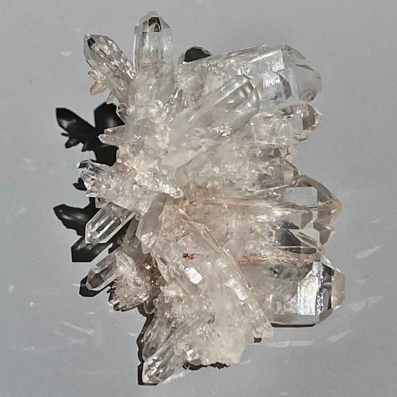 それもファーデンに多いのが、柱の様な不透明の太い結晶部分にタビュラーの結晶が付着して採掘される事が多く、この子もそのような太い結晶が付いているため、最後から2枚目の画像のように、そのおかげで独り立ちします(安定感はないので固定が必要です)。ファーデンクォーツは、何回見ても理解を超えた不思議なフォーメーションをしていて、色々な角度で全く違う表情を見せてくれます。