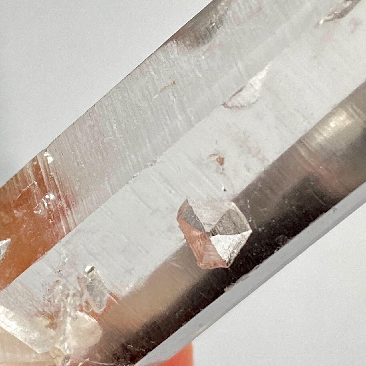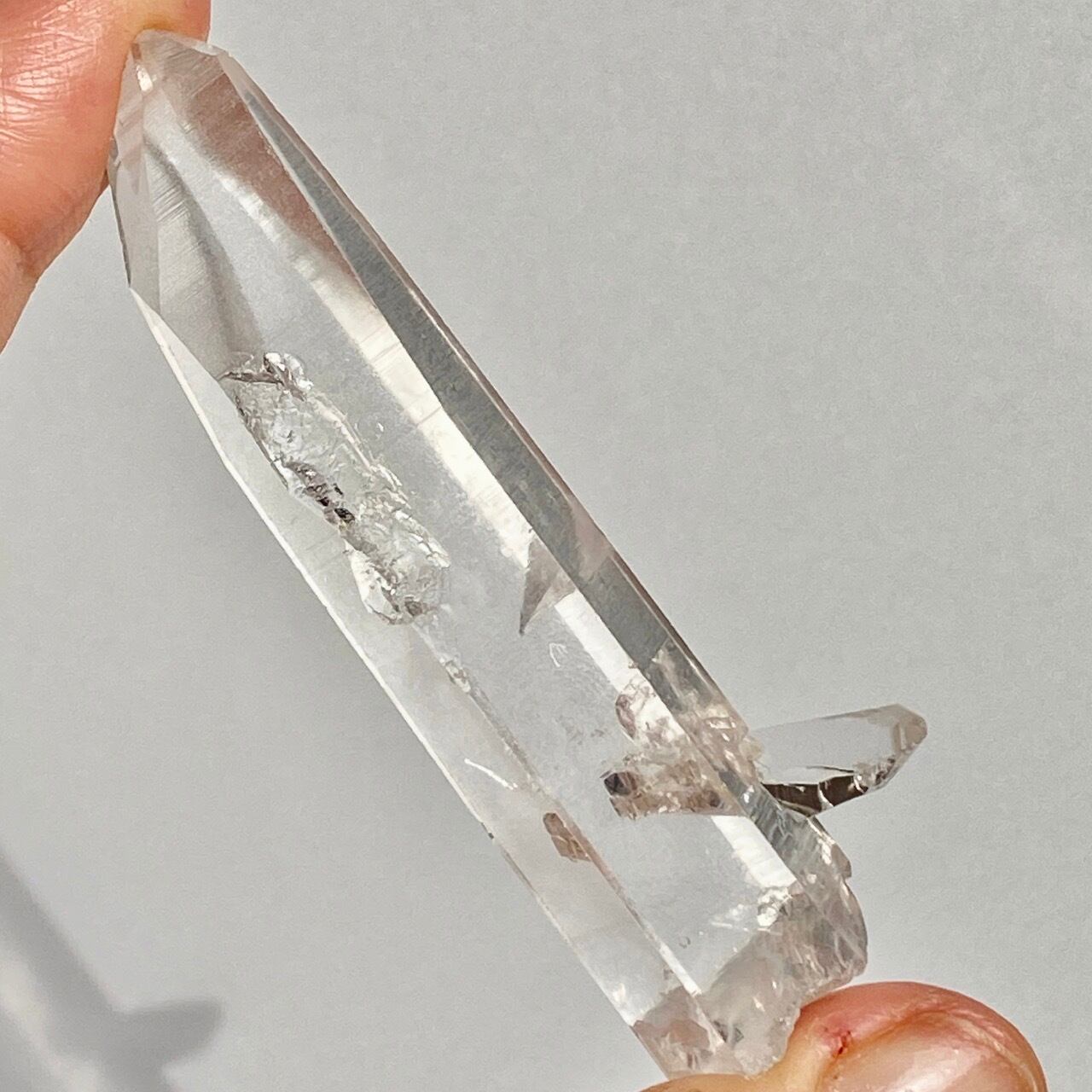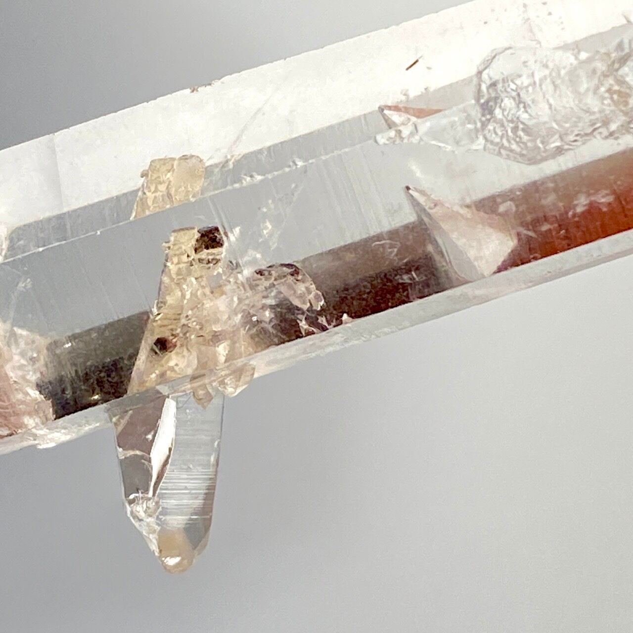 透明感抜群の貫入水晶で、貫入したミニポイントが良く見える子です。もう一本小さなポイントが貫入していた可愛すぎる穴(画像3枚目、9枚目)が見られ、こちらはゲートウェイ(※)と呼ばれます。