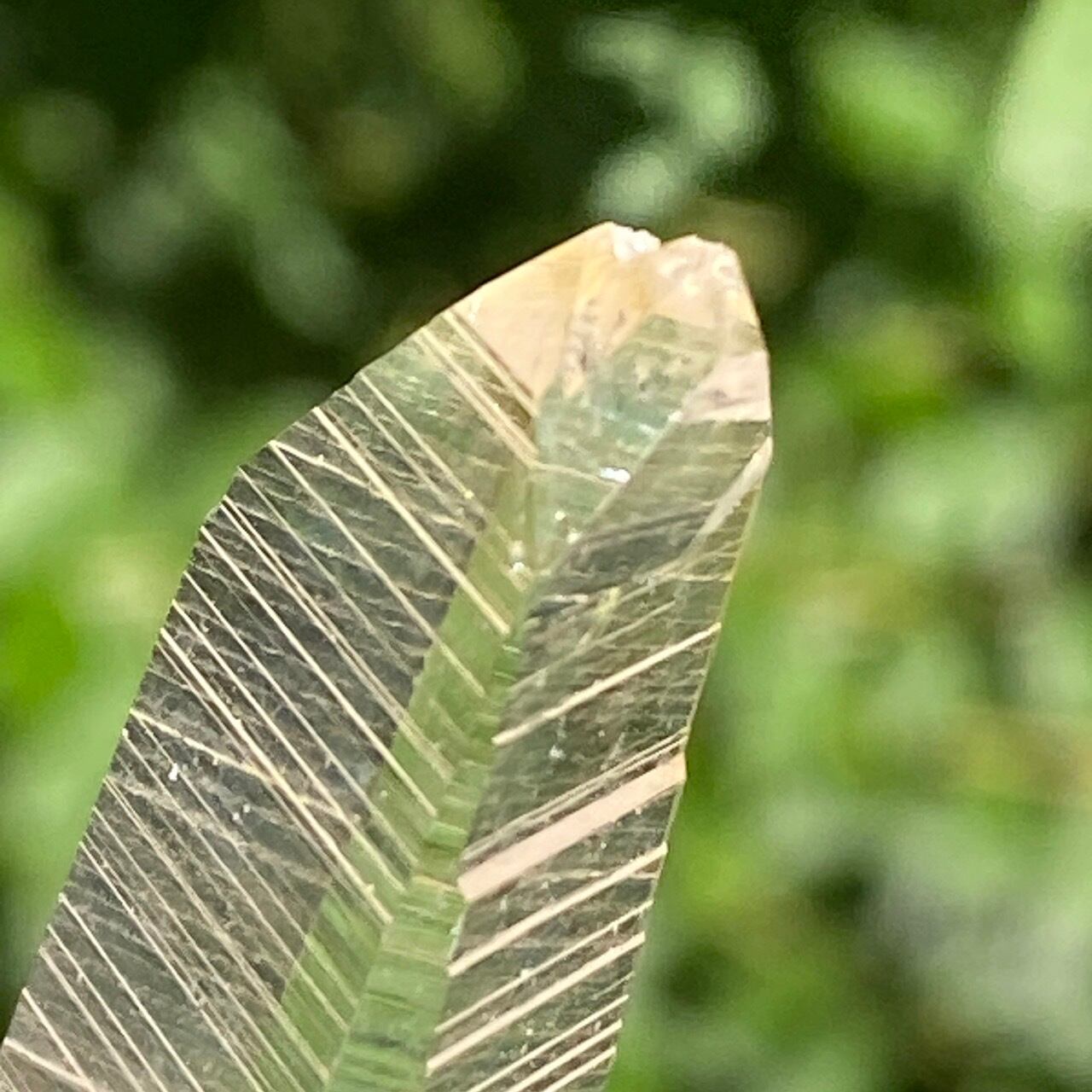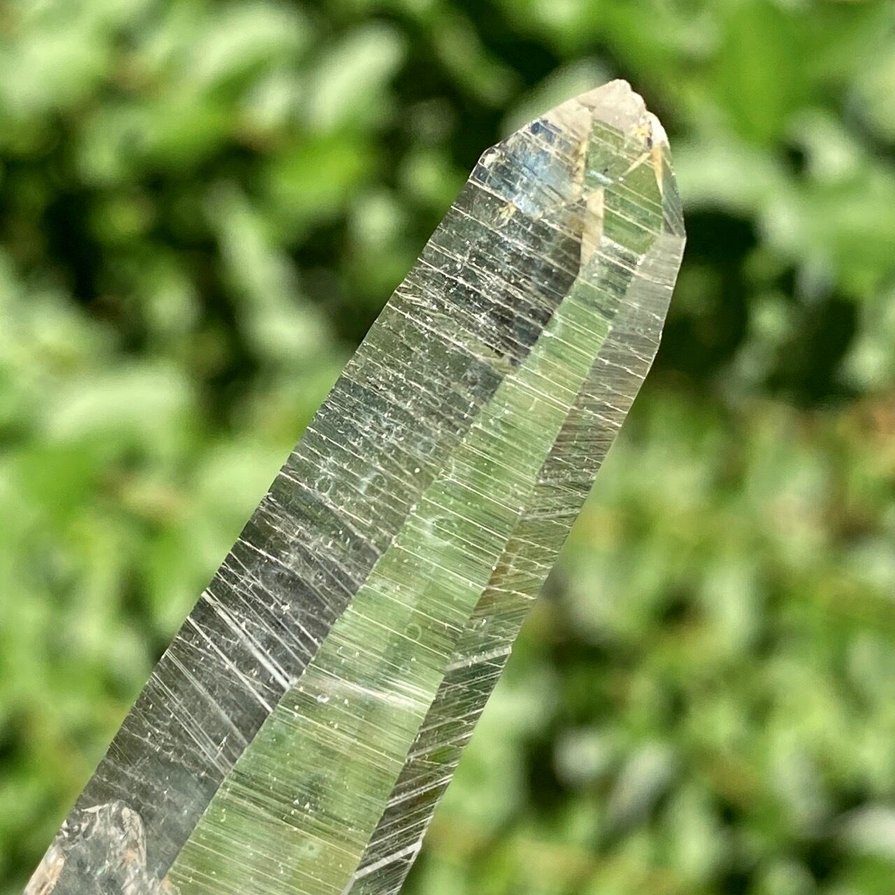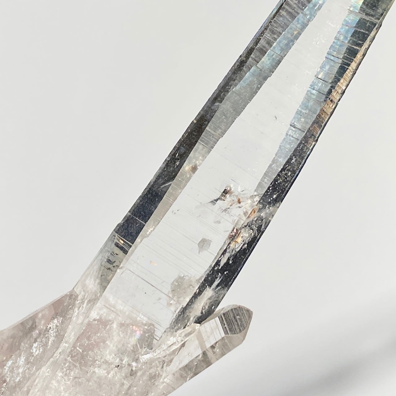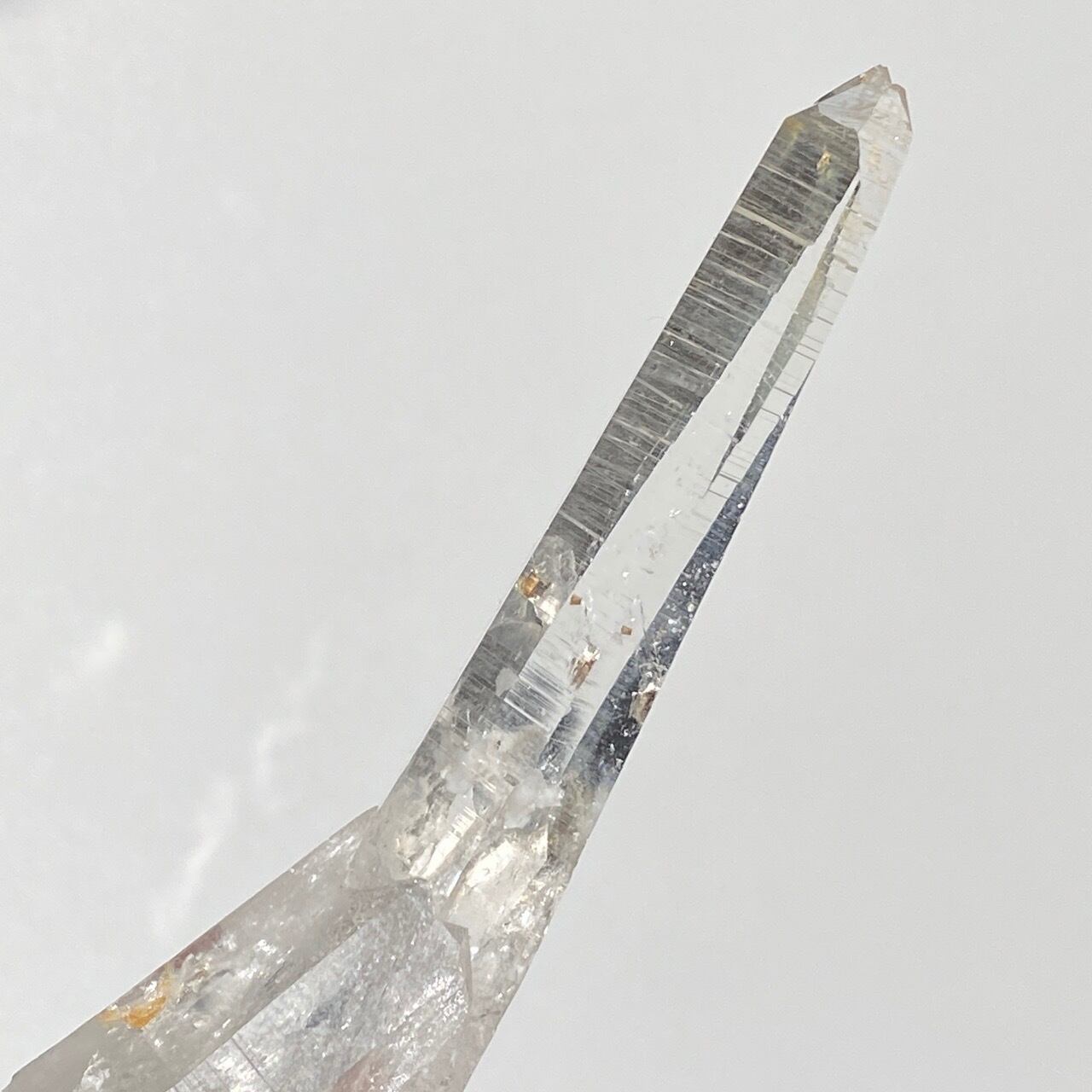 細くすらっとしたポイントの中に白っぽい可愛いインクルージョンが見られ(4枚目の画像のような)、くっきりとした柱面のレムリアンリッジがシャープな印象を与えます。