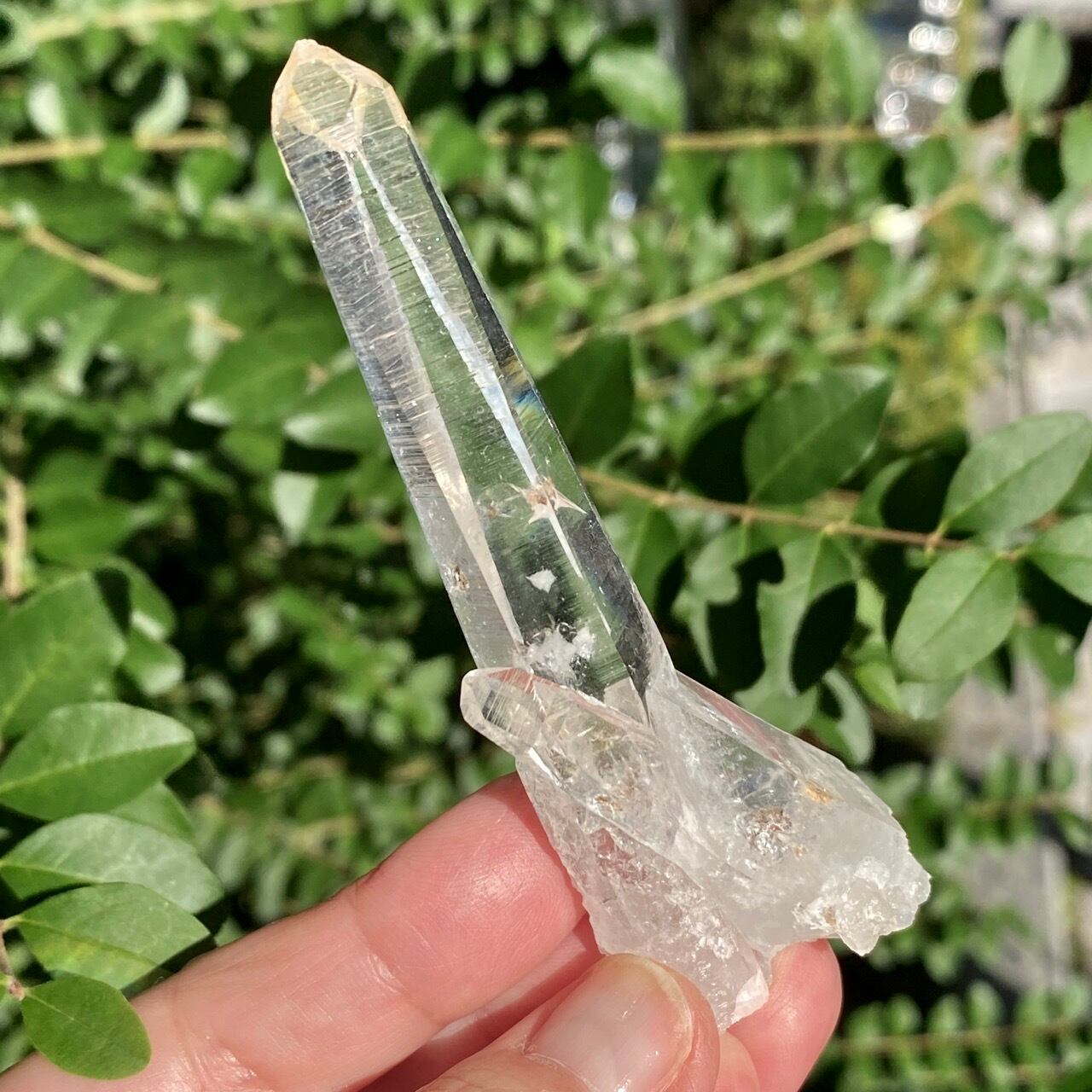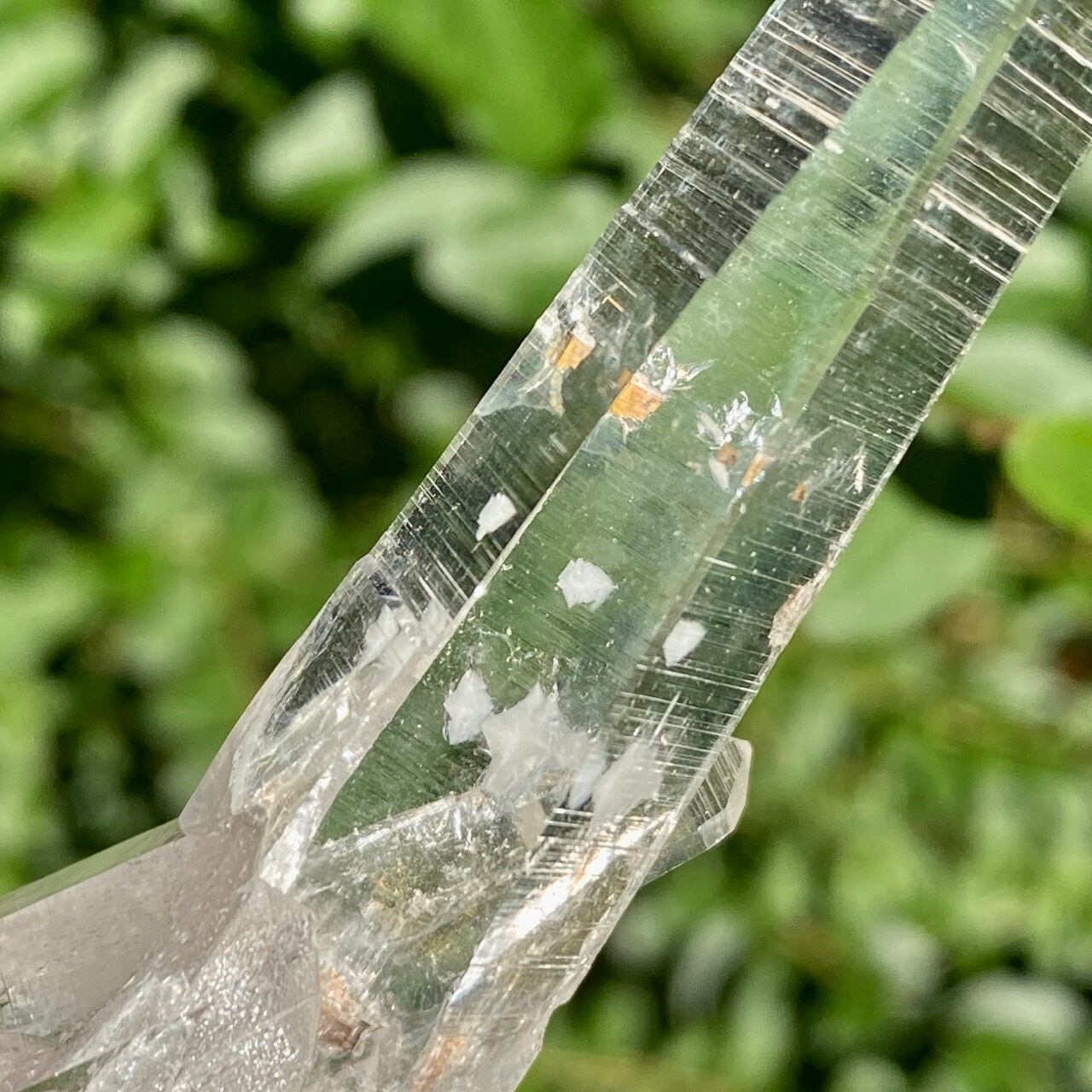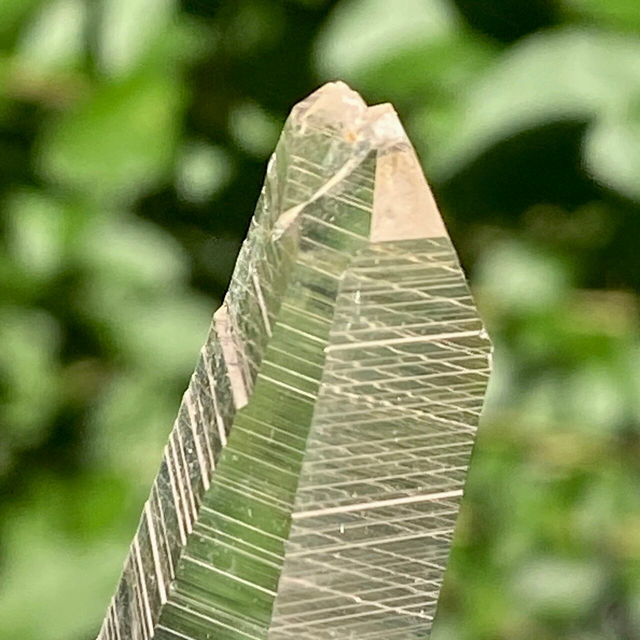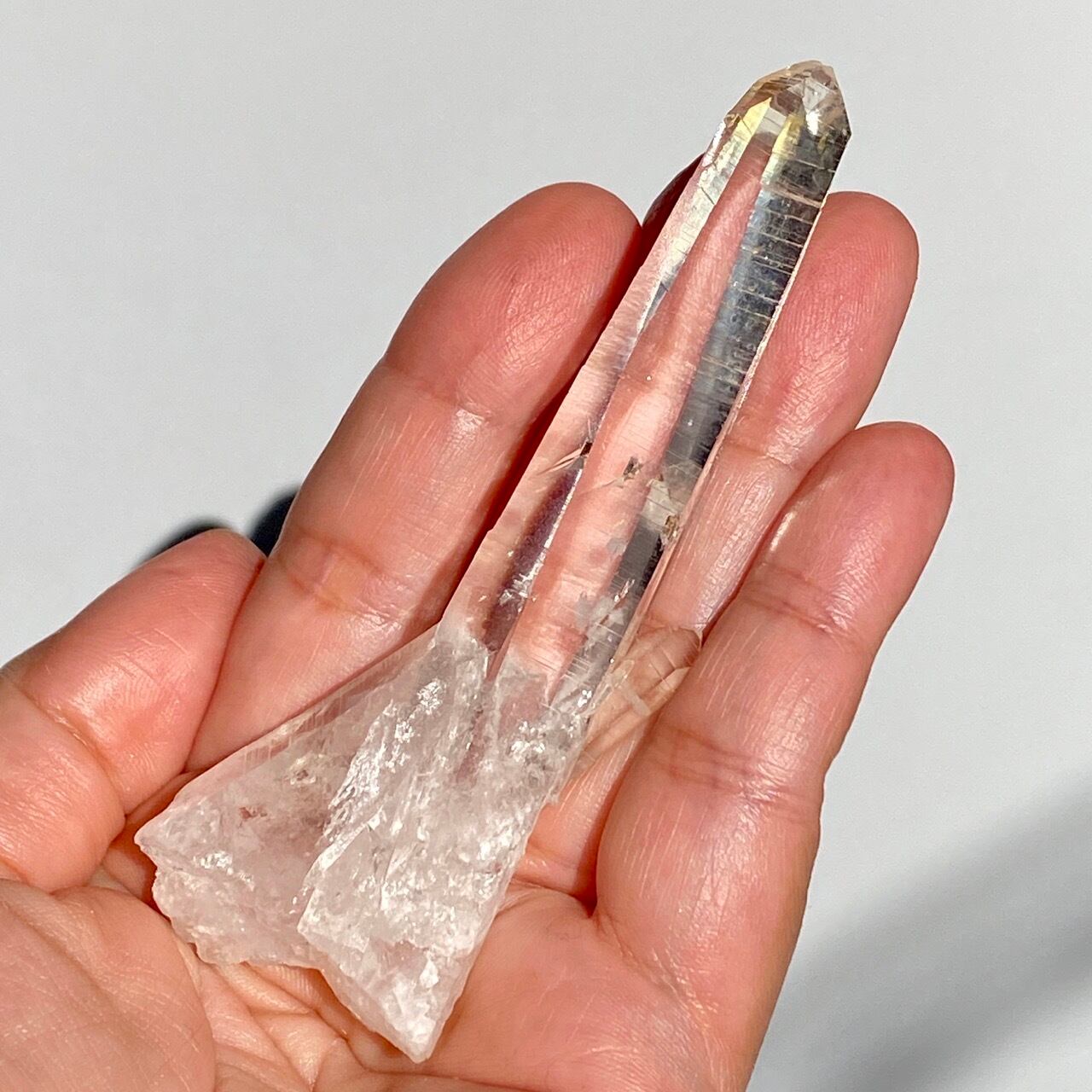 細くすらっとしたポイントの中に白っぽい可愛いインクルージョンが見られ(4枚目の画像のような)、くっきりとした柱面のレムリアンリッジがシャープな印象を与えます。
