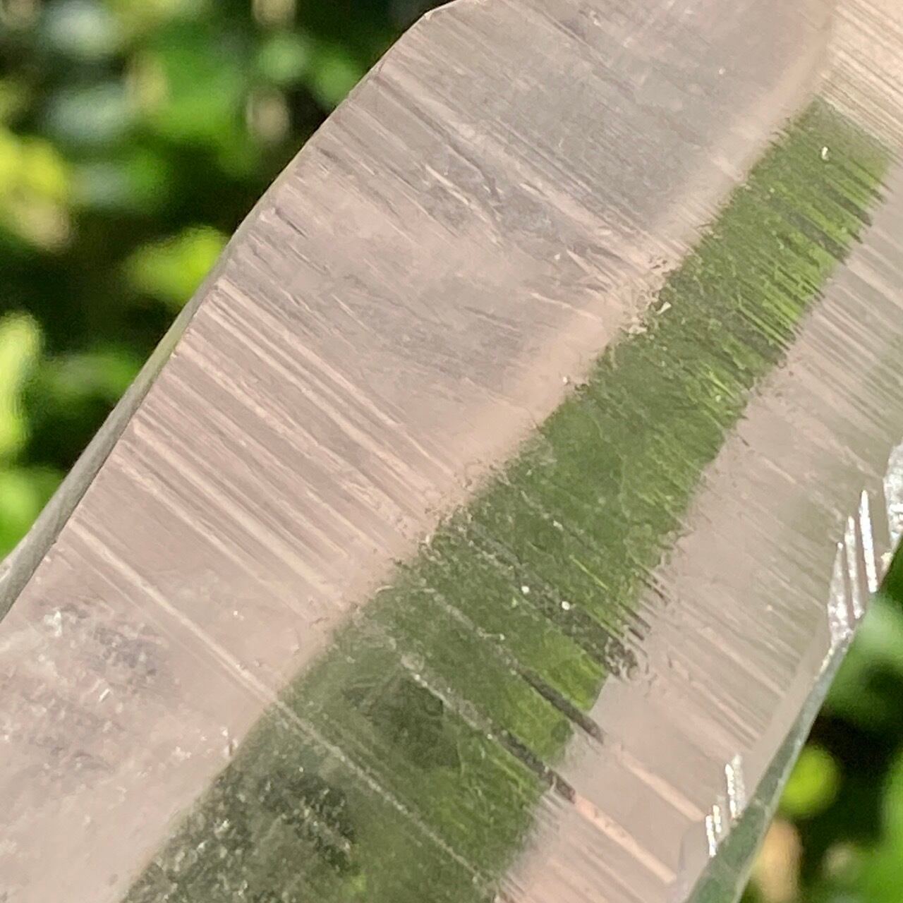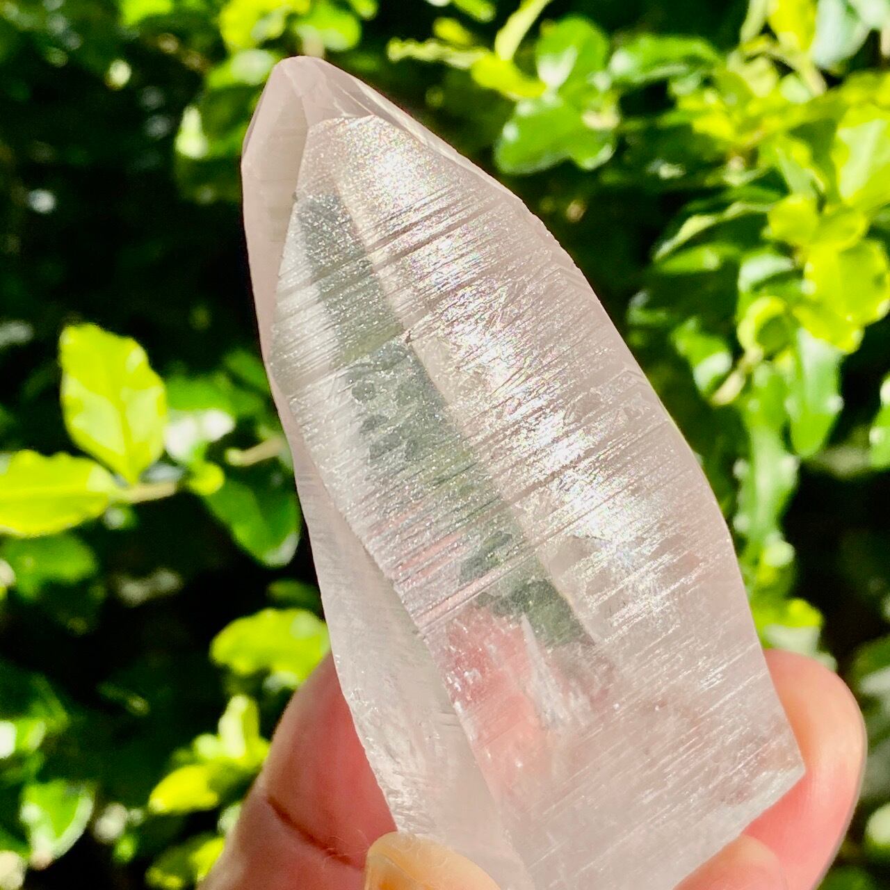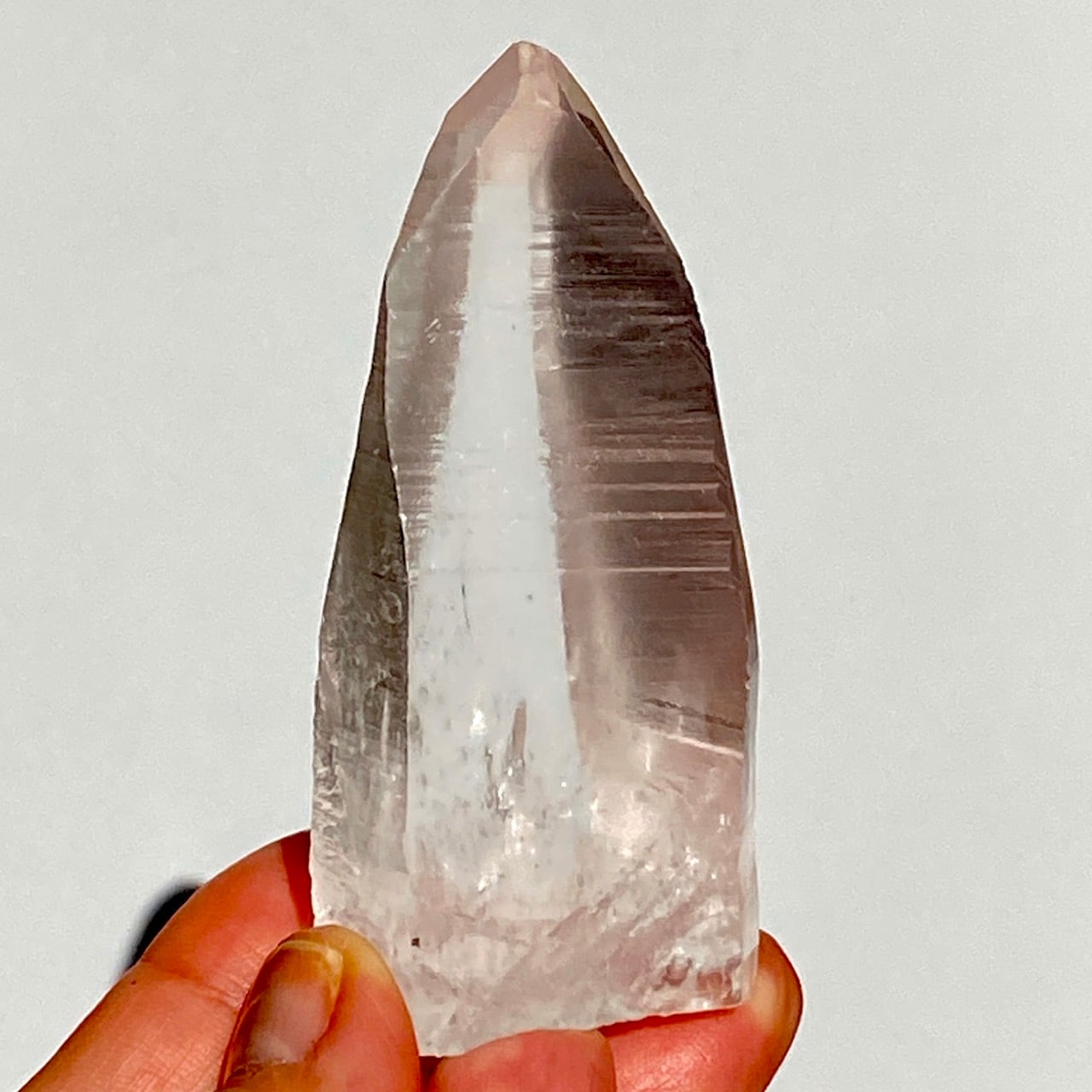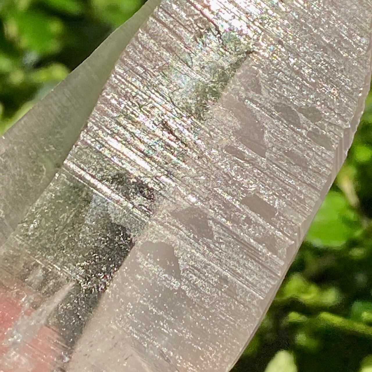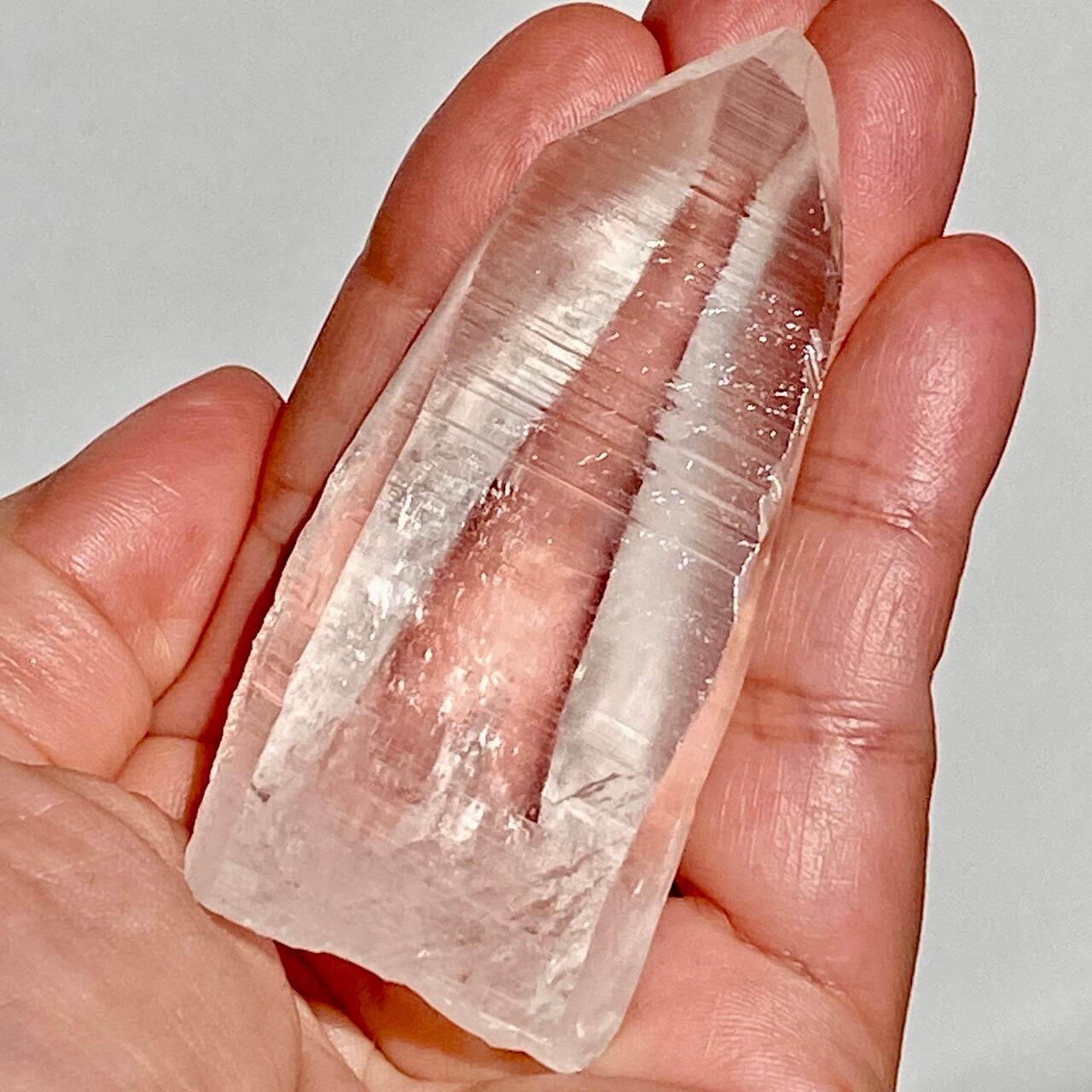 広い柱面から見える、天からスポットライトの光が降りてきているような2つラインが美しい子です。幾つかの面に最後から2枚目の画像のような模様が入っていて、光と見る角度によってその模様が浮かび上がります。