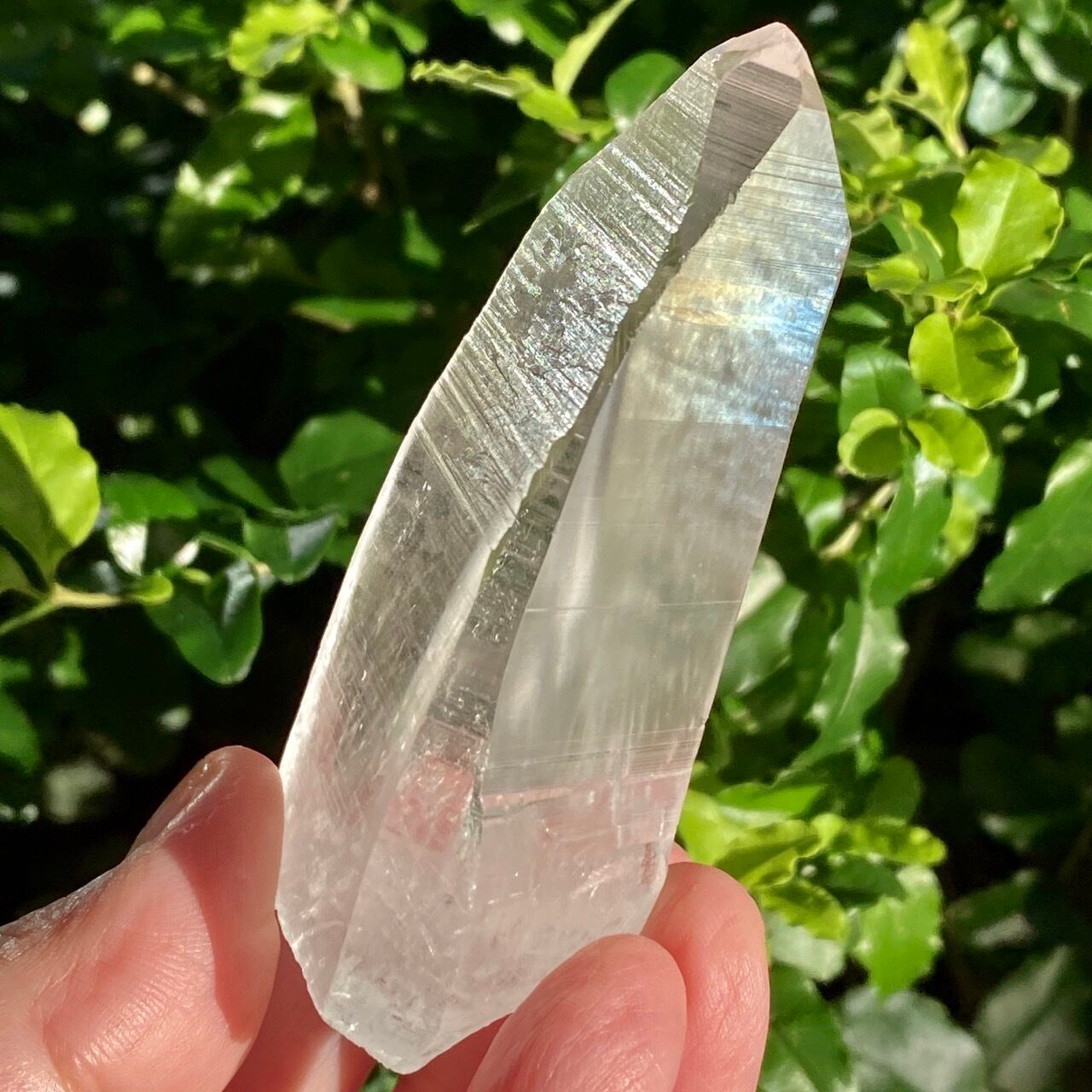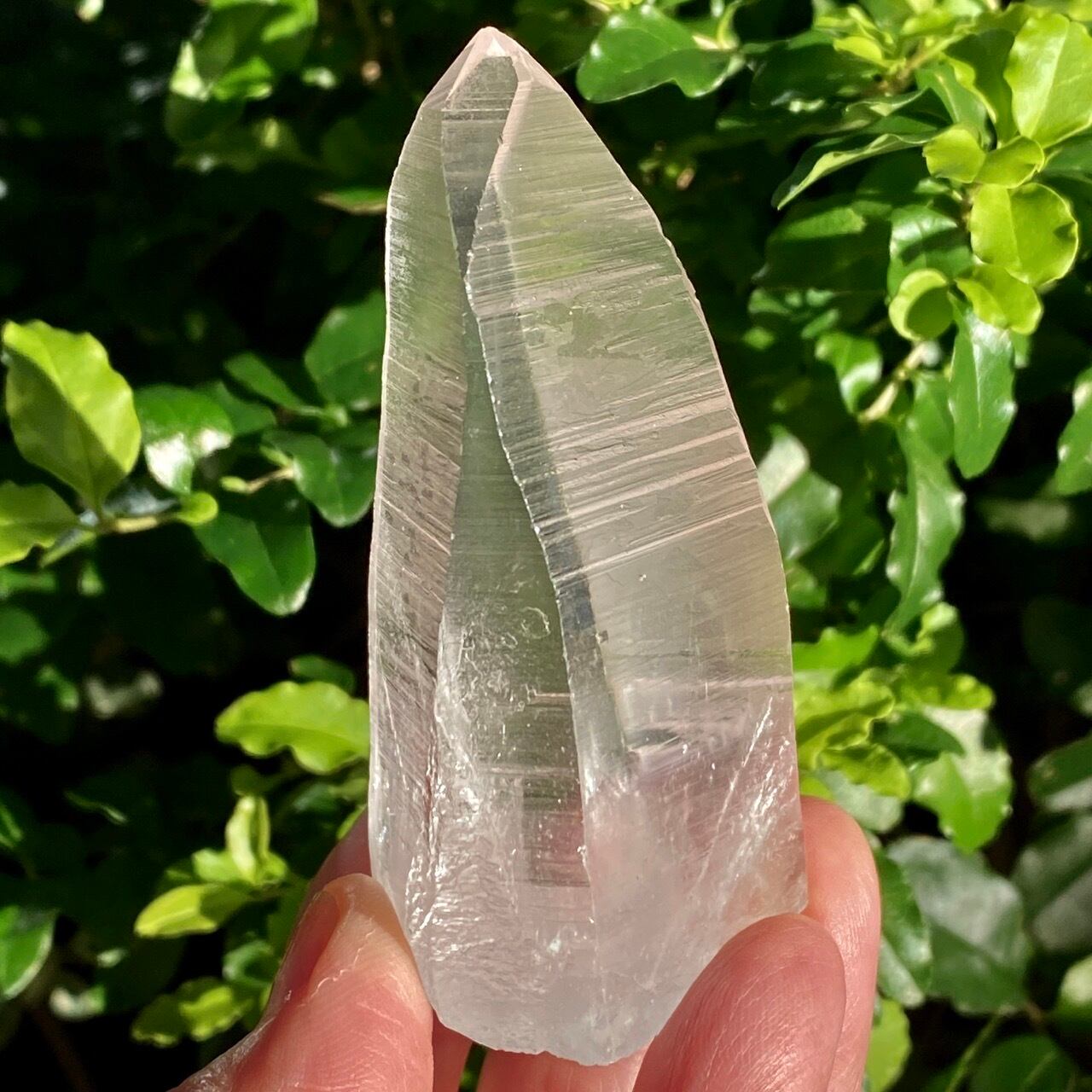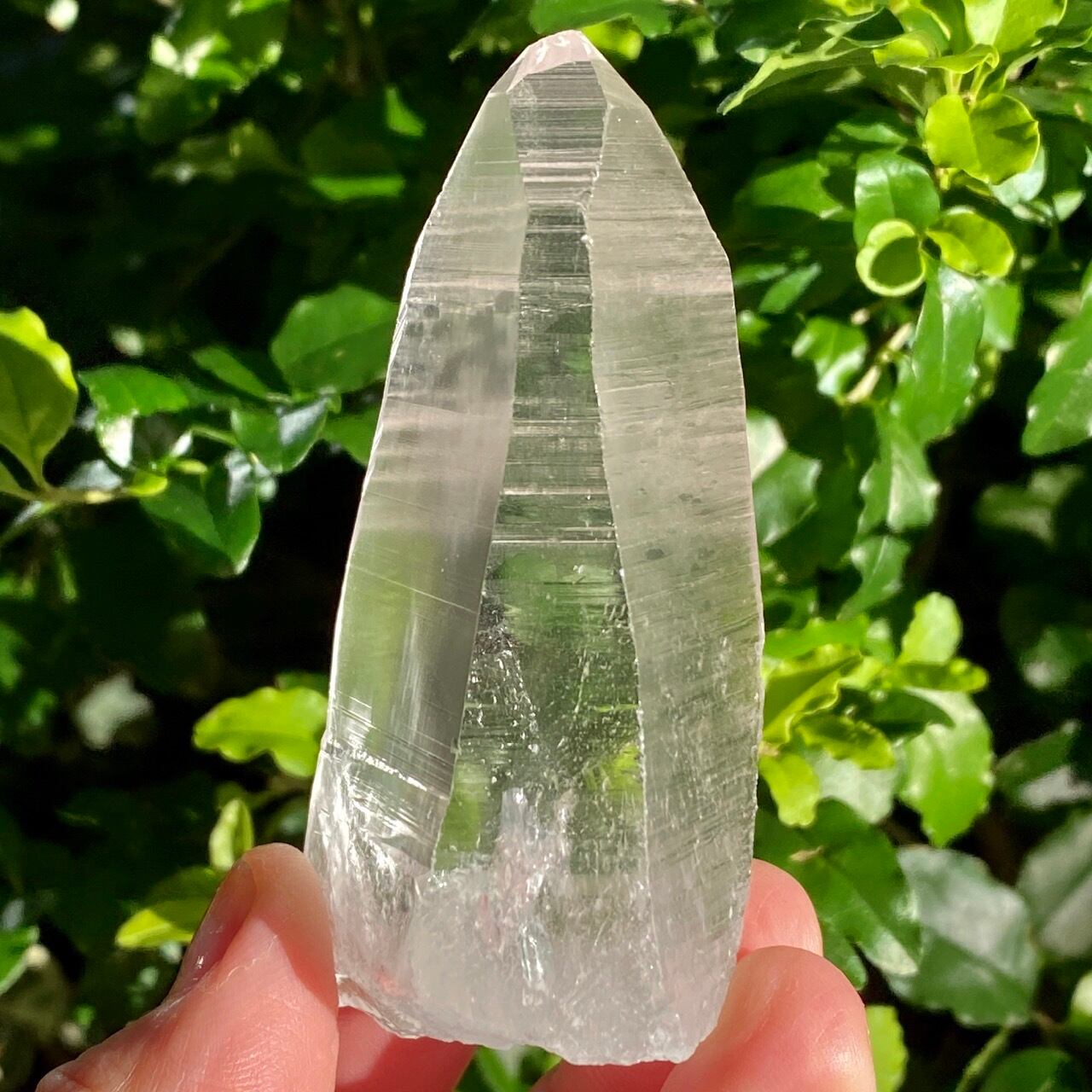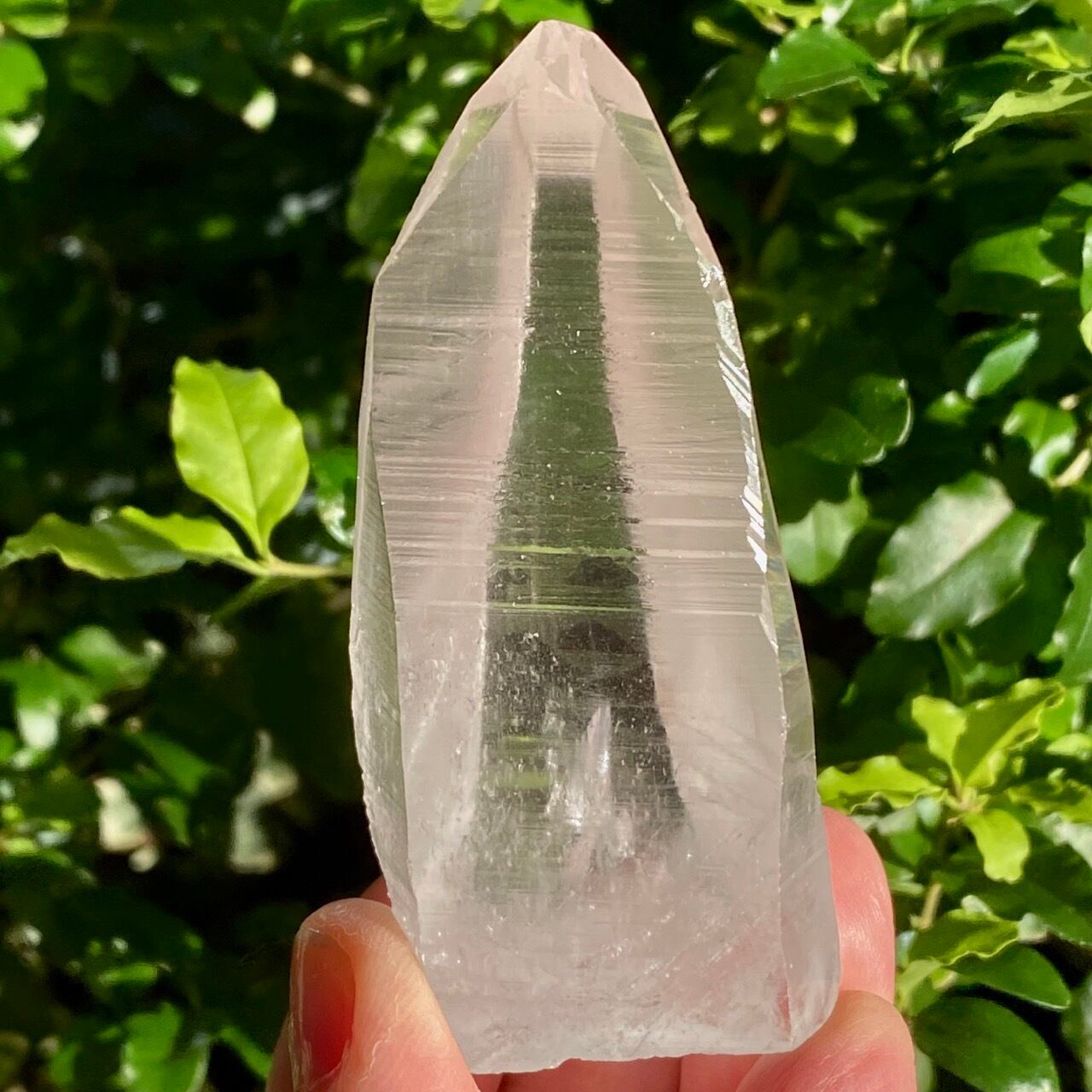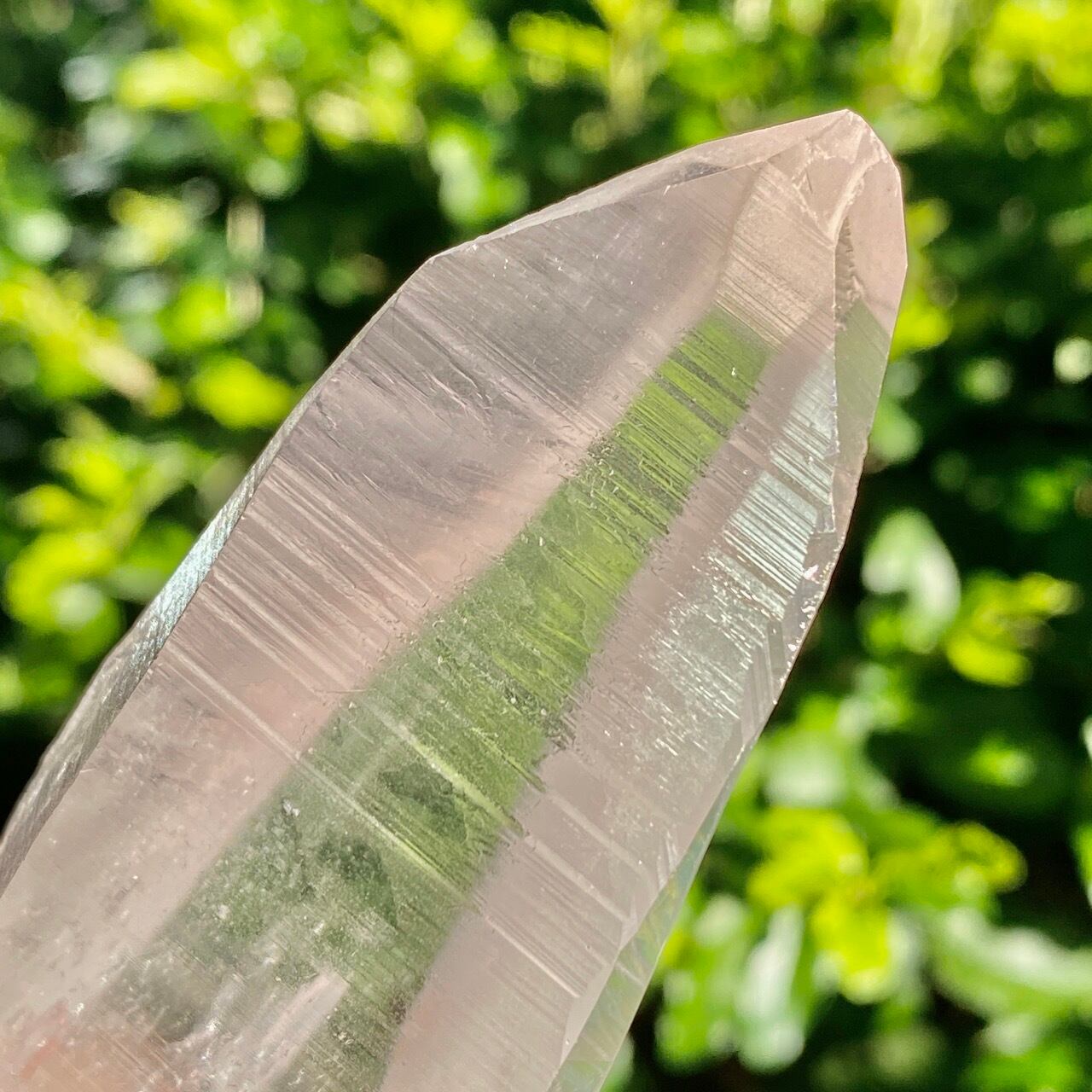広い柱面から見える、天からスポットライトの光が降りてきているような2つラインが美しい子です。幾つかの面に最後から2枚目の画像のような模様が入っていて、光と見る角度によってその模様が浮かび上がります。
