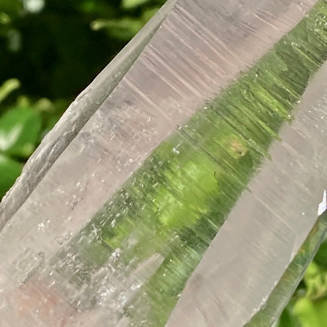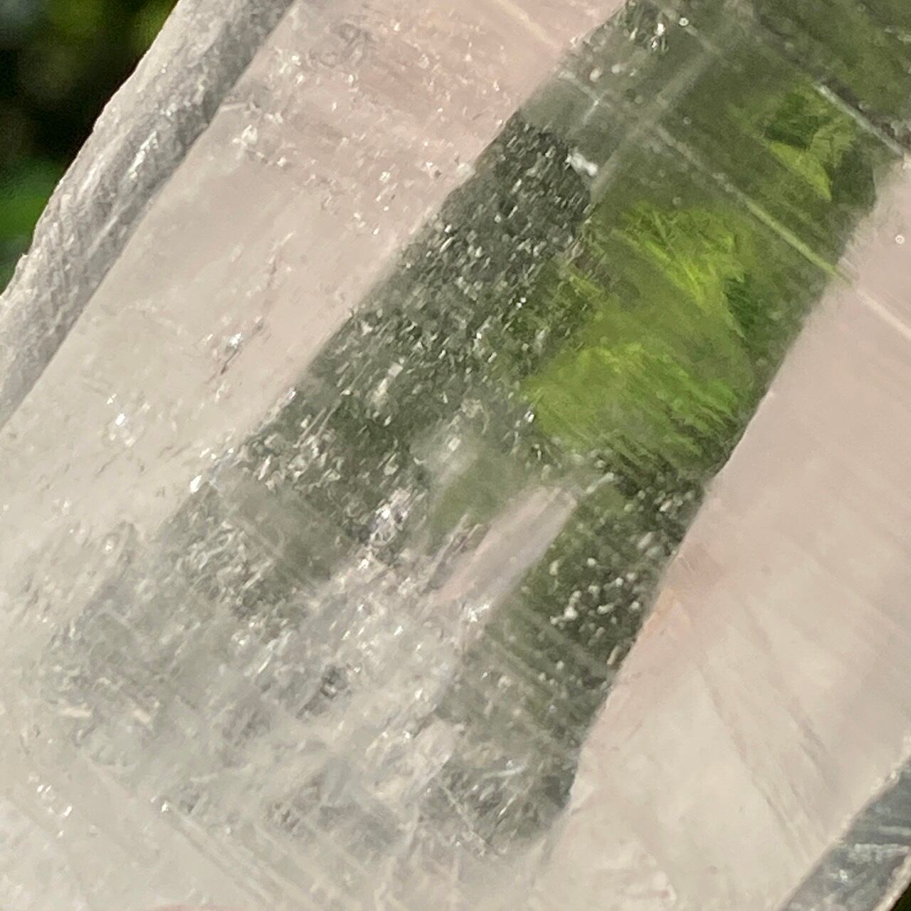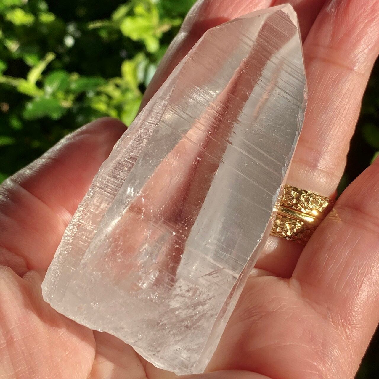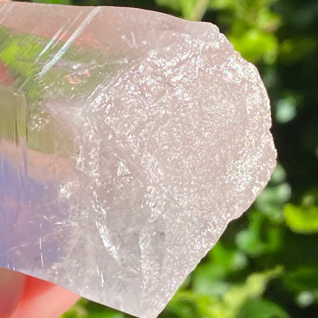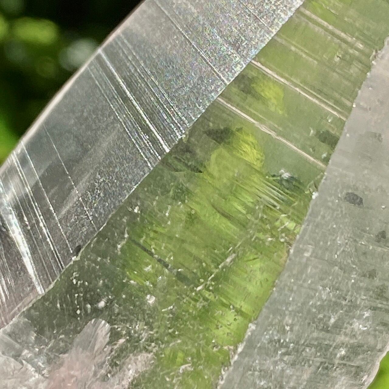 広い柱面から見える、天からスポットライトの光が降りてきているような2つラインが美しい子です。幾つかの面に最後から2枚目の画像のような模様が入っていて、光と見る角度によってその模様が浮かび上がります。