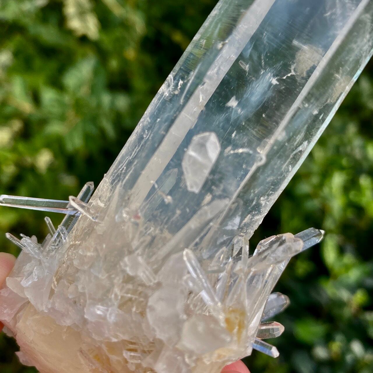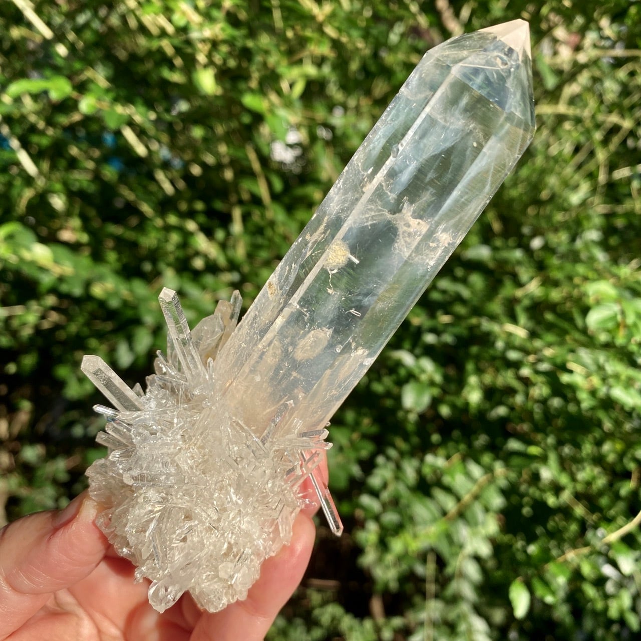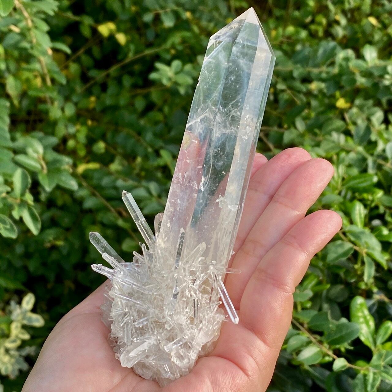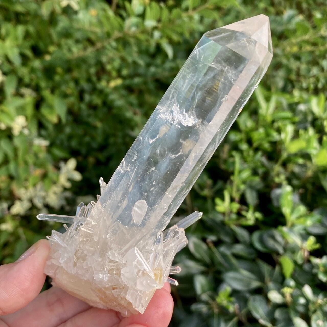 コロンビア産の高透明度で照りの強い、しっかりとした太くて照りのあるポイントとそこに浮かぶブルースモーク、そしてレムリアンの組み合わせだけでもスペシャル過ぎますが、さらに極細で透明感のあるきらっきらのニードルクォーツのクラスターが下部にびっしりと付いているゴージャスな子です。