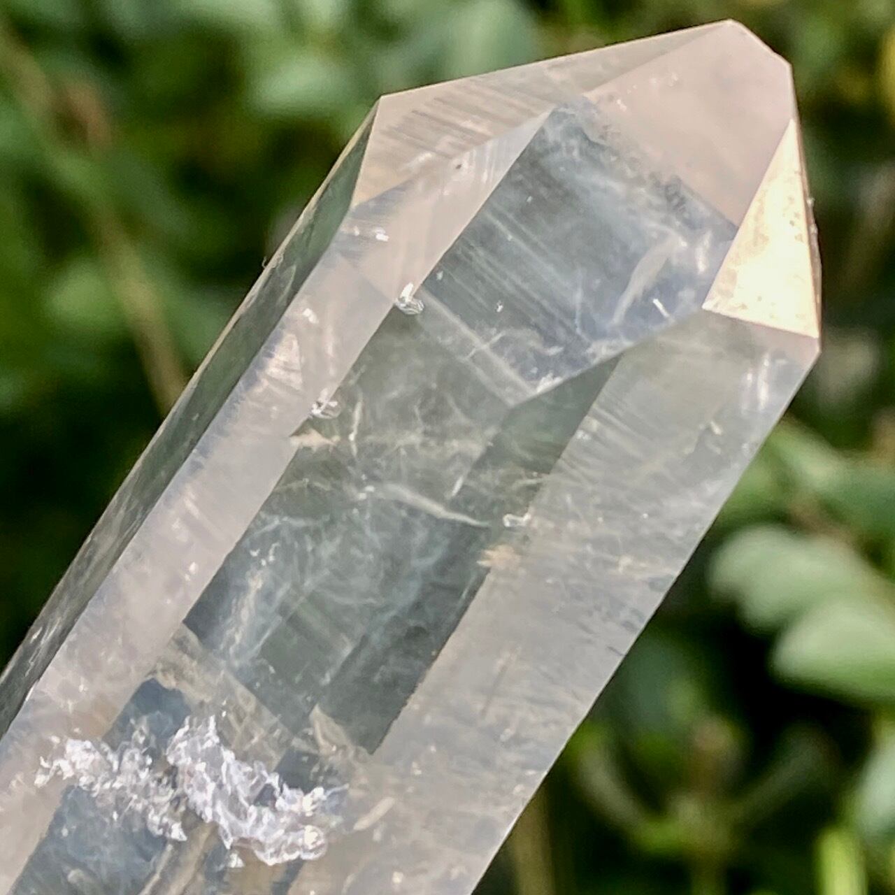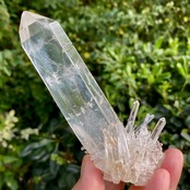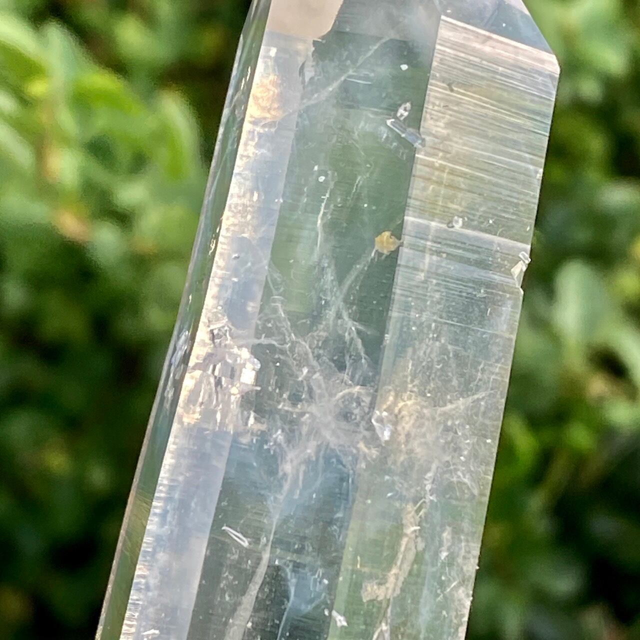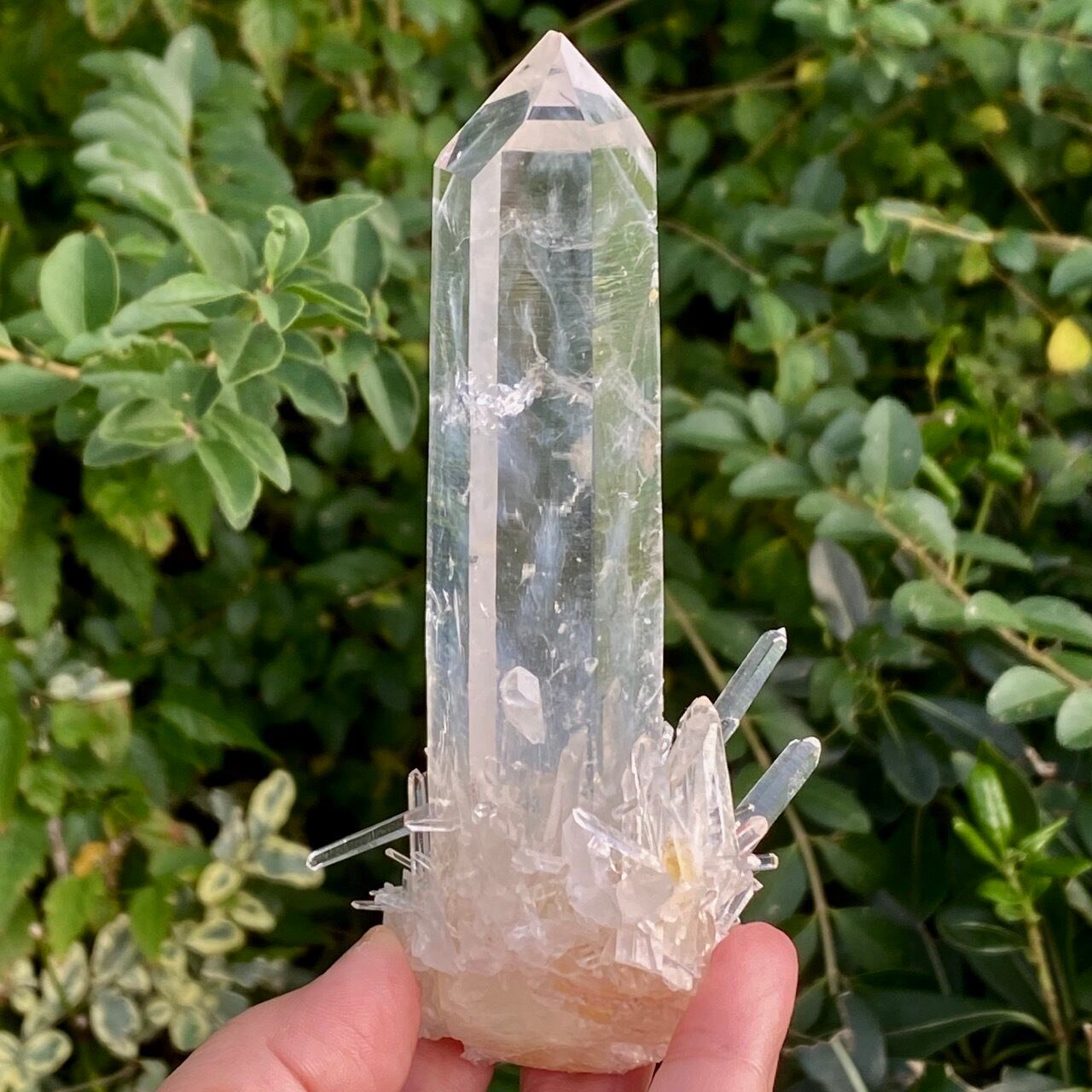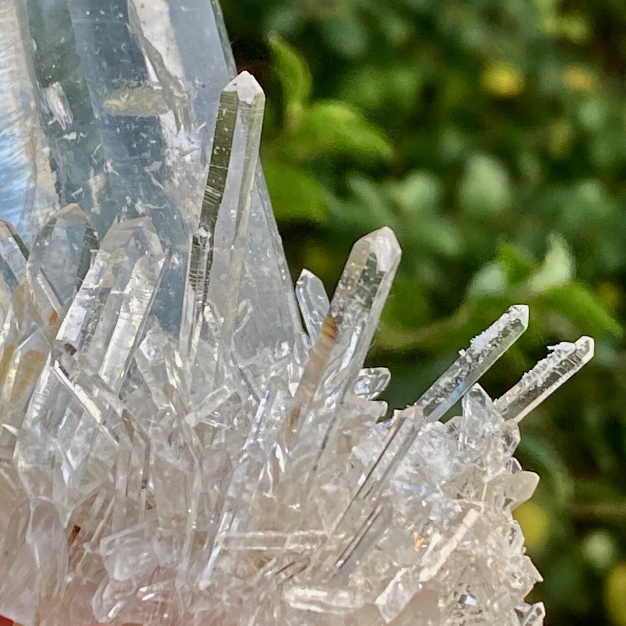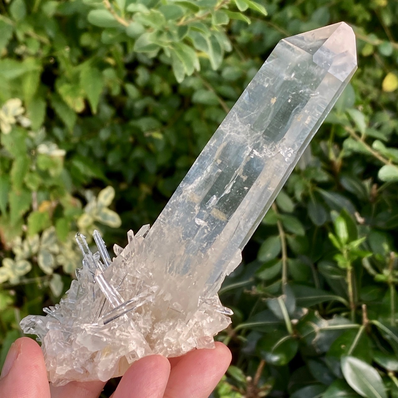 コロンビア産の高透明度で照りの強い、しっかりとした太くて照りのあるポイントとそこに浮かぶブルースモーク、そしてレムリアンの組み合わせだけでもスペシャル過ぎますが、さらに極細で透明感のあるきらっきらのニードルクォーツのクラスターが下部にびっしりと付いているゴージャスな子です。